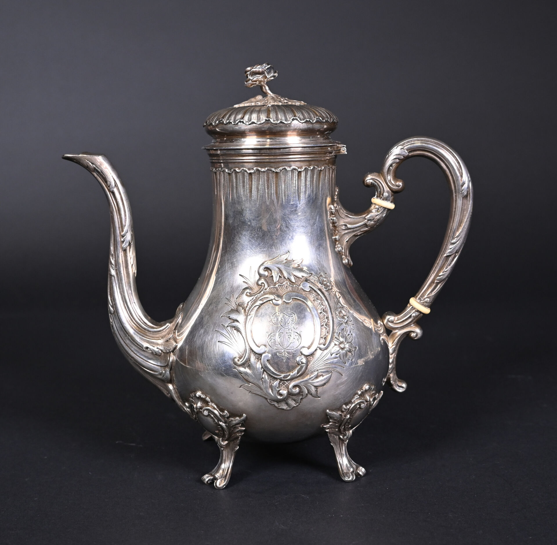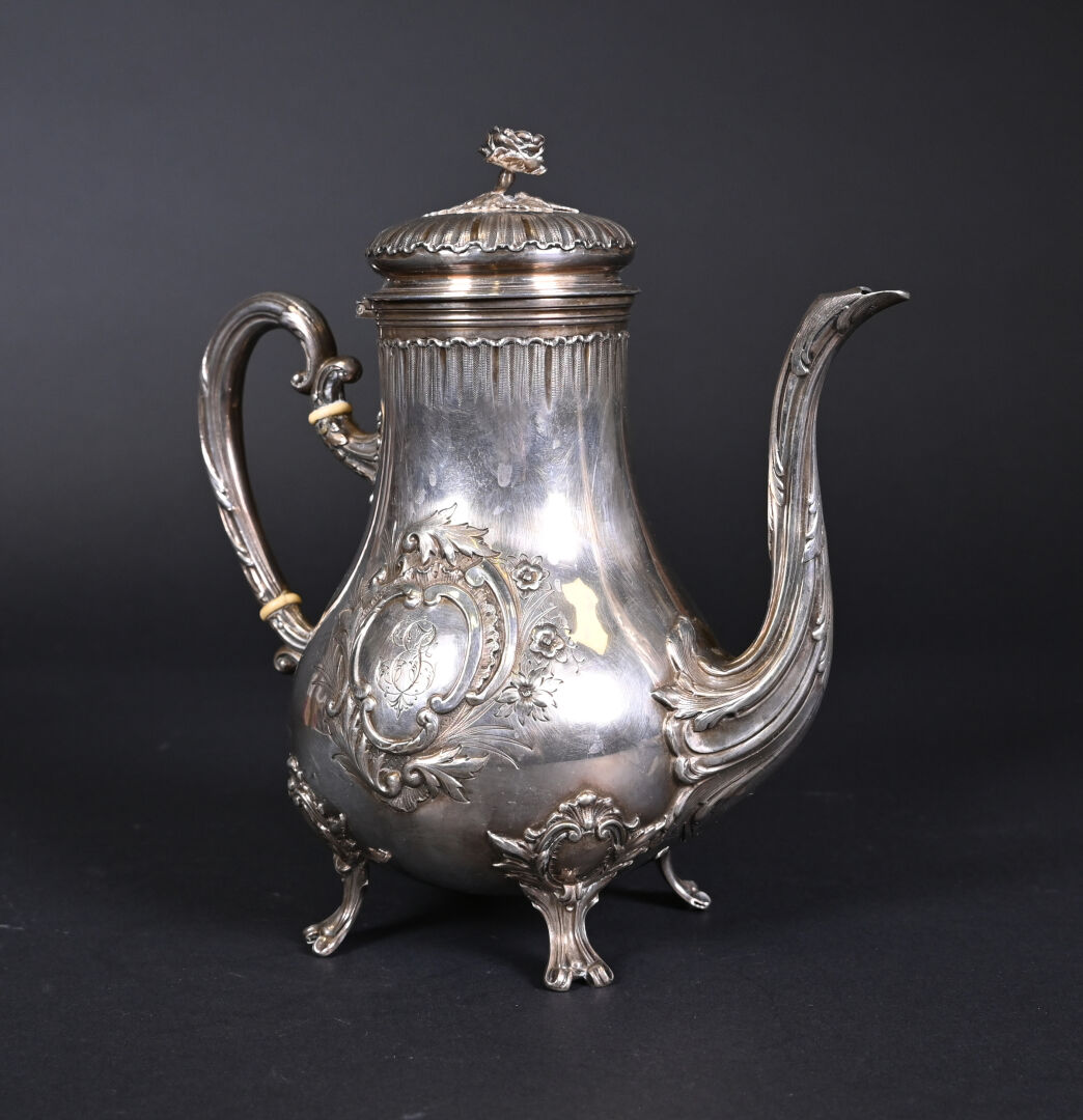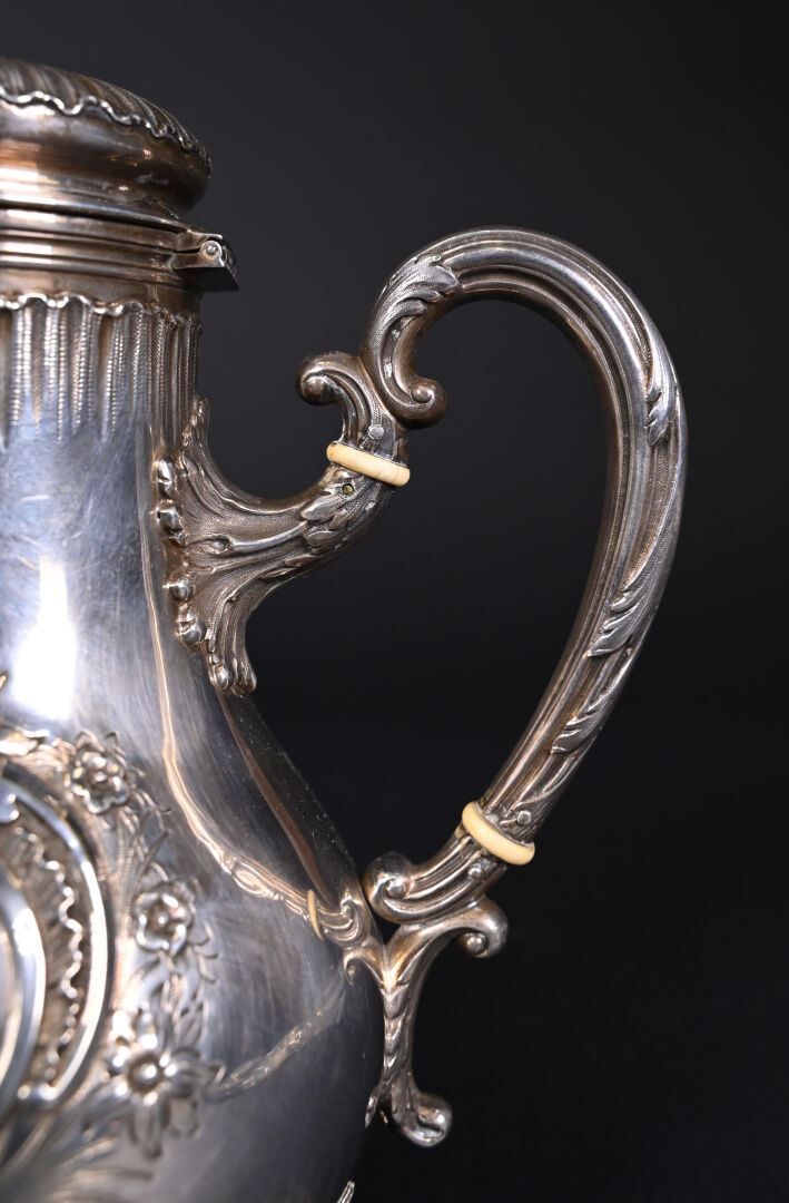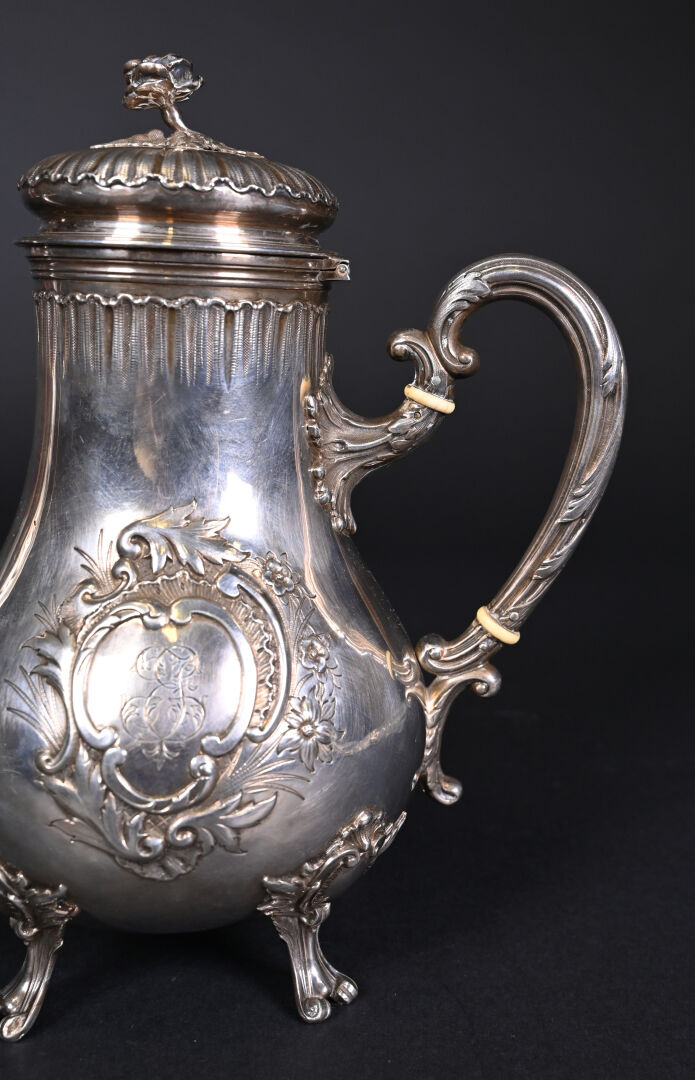 PARIS, troisième quart du XIXe siècle. Théière en argent massif, poinçon Minerve au titre de 950/1000e. Elle repose sur 4 pieds, le corps est décoré en repoussé d’un cartouche à décor de fleurs, gravé en son centre d’un monogramme. L’anse est séparée de deux anneaux en ivoire.