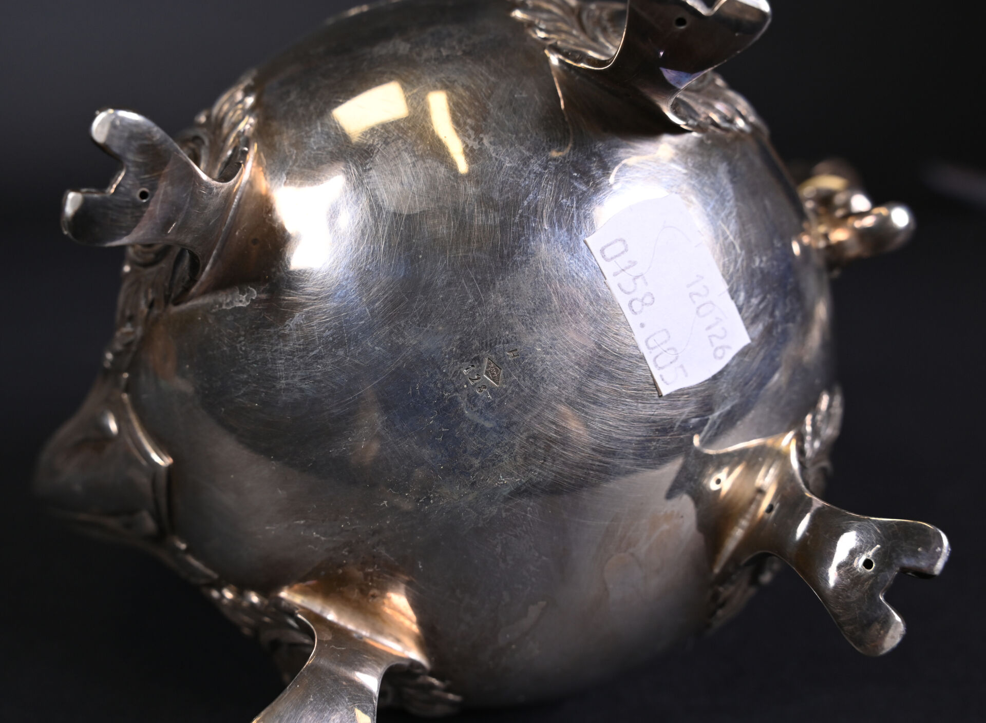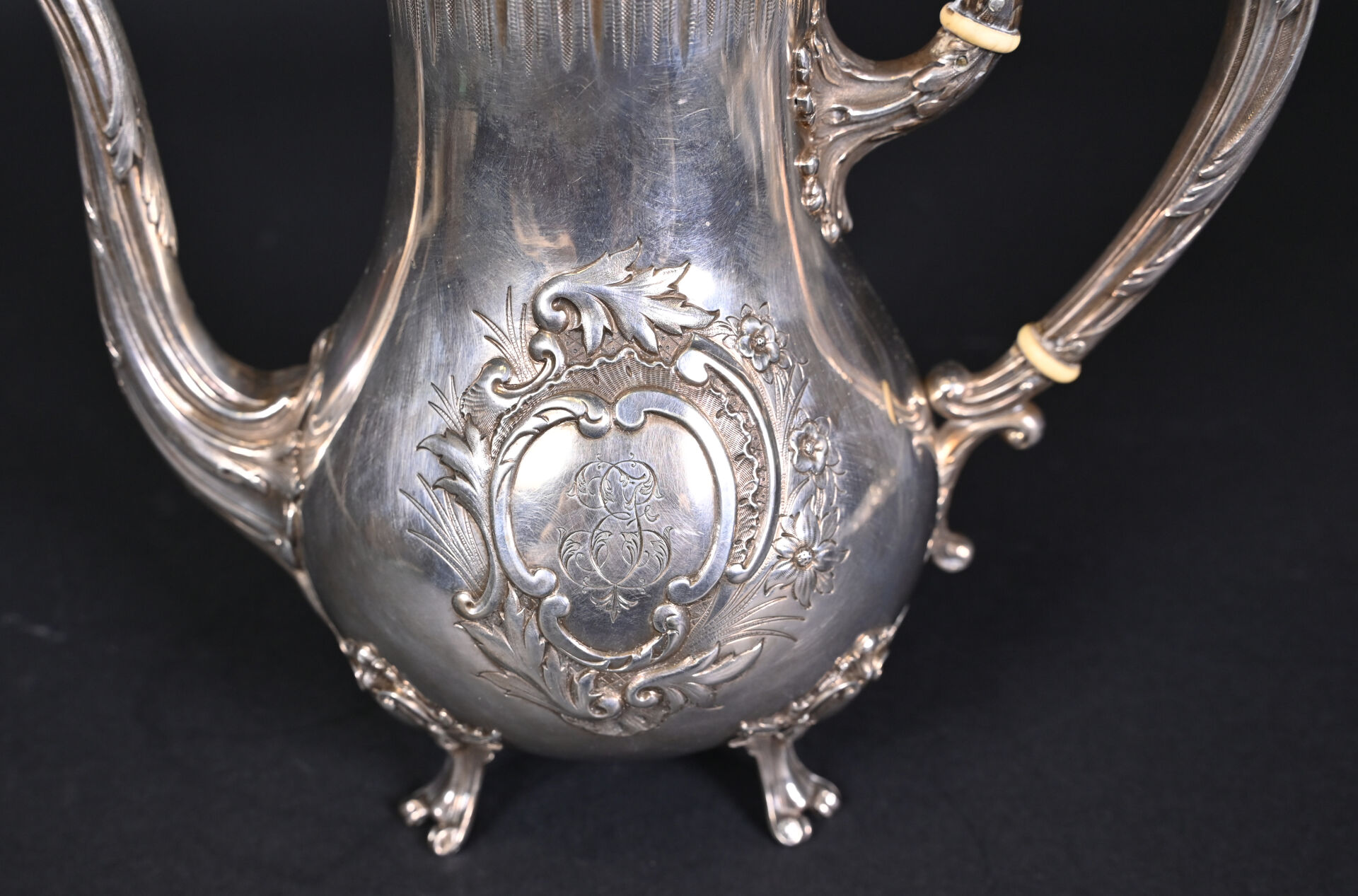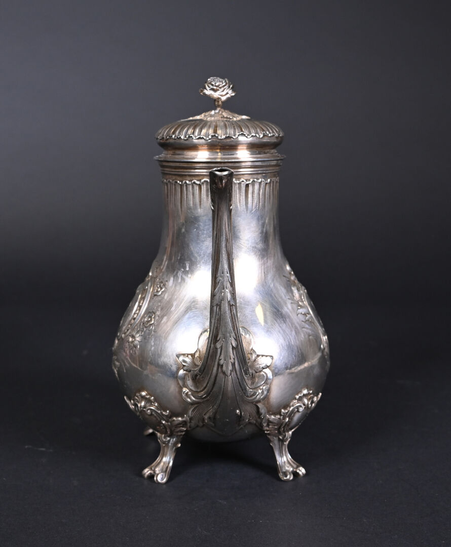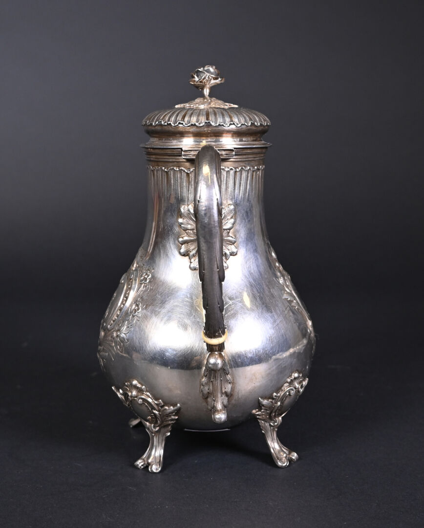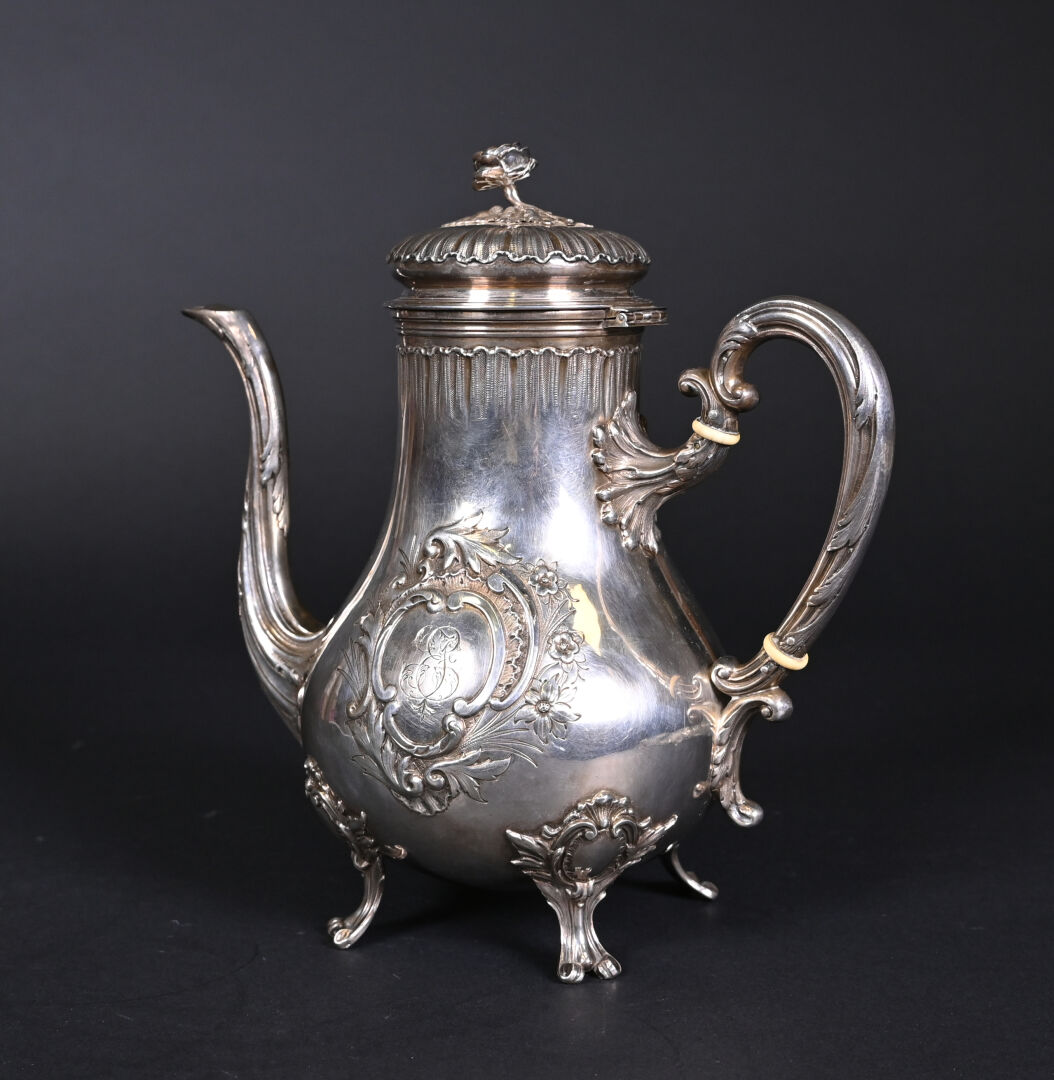 PARIS, troisième quart du XIXe siècle. Théière en argent massif, poinçon Minerve au titre de 950/1000e. Elle repose sur 4 pieds, le corps est décoré en repoussé d’un cartouche à décor de fleurs, gravé en son centre d’un monogramme. L’anse est séparée de deux anneaux en ivoire. Orfèvre : FRAY ET FILS, reçu maître en 1875. N° de garantie 8594. Dimensions : 21,5 x 22 x 11,5 cm. Poids brut. : 535 g. Bon état général (rayures d’usages). CIC obtenu : FR2606400038-K.