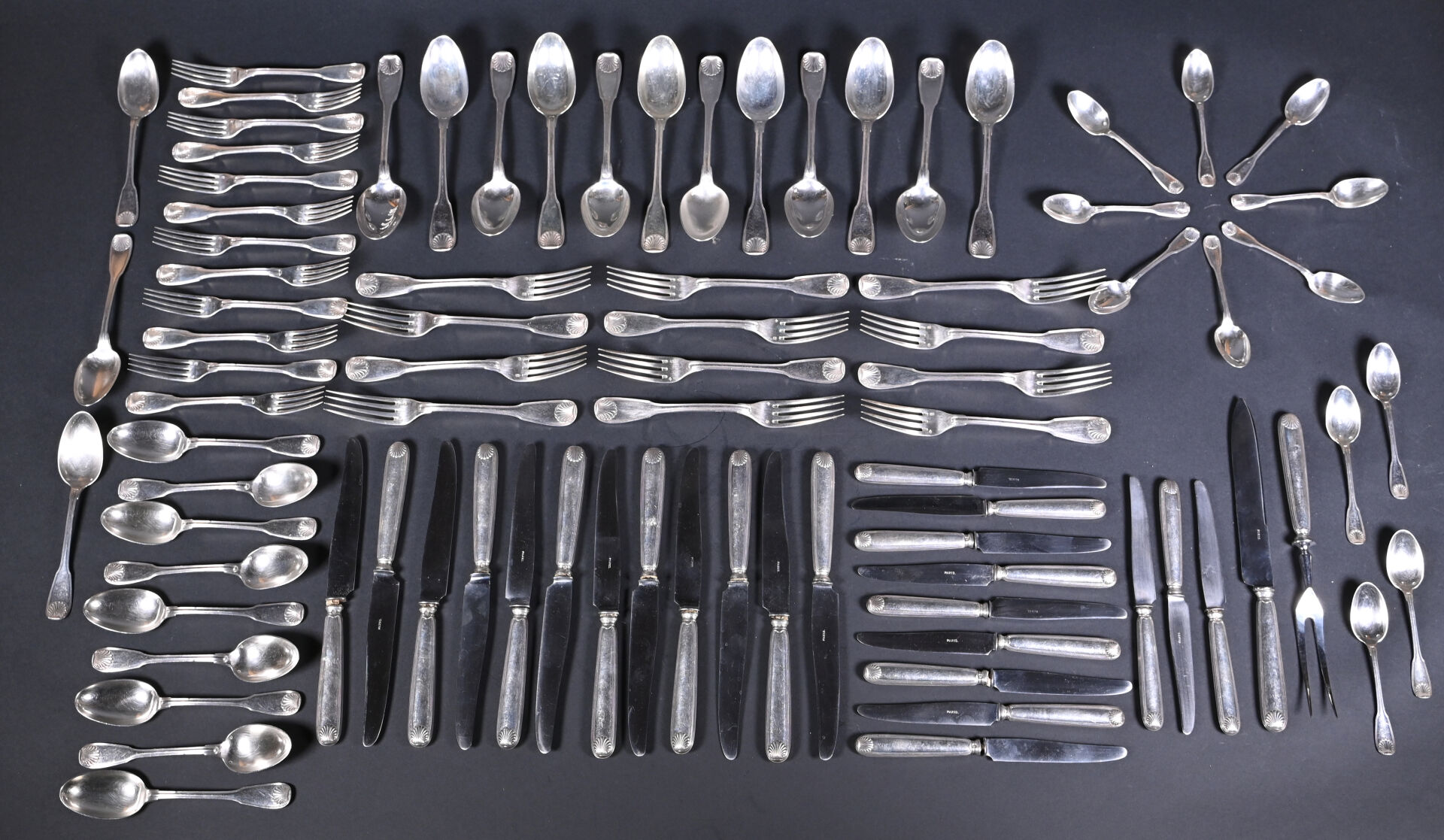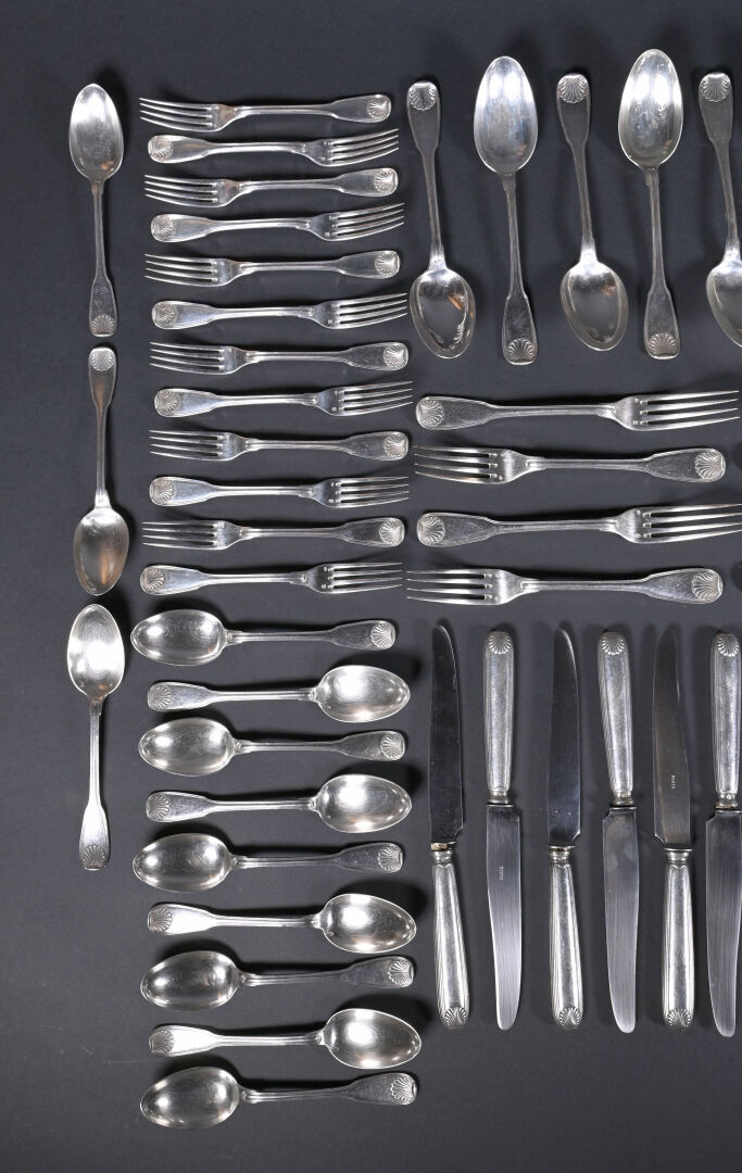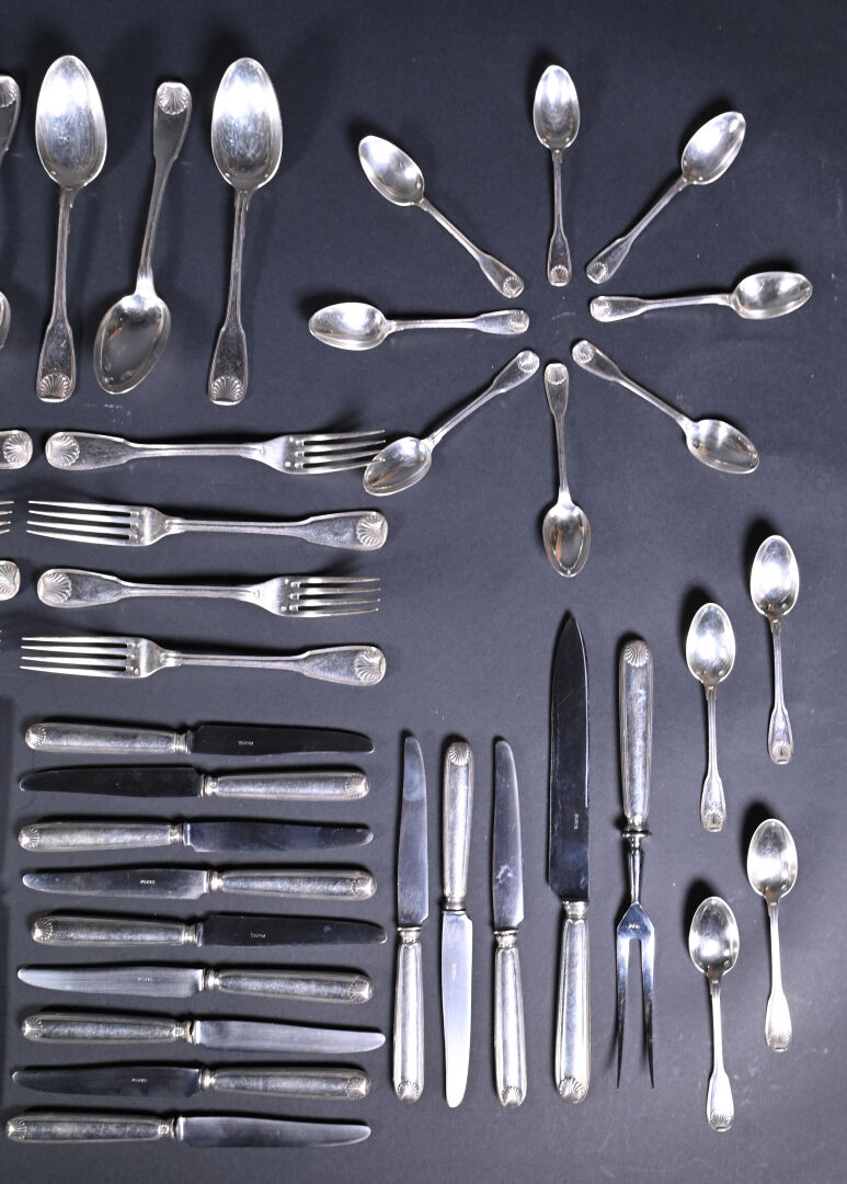 Partie de ménagère en argent 925/1000e, poinçon Minerve, la spatule à coquille comprenant 12 grands couverts, 12 couverts à entremets, 12 petites cuillères, 12 grands couteaux (argent fourré). 12 petits couteaux (argent fourré), 1 couvert de service à viande à manches en argent fourré. Poids total brut. : 4 650 g. Poids argent net : 2 965 g. Poids argent brut. : 1 685 g.