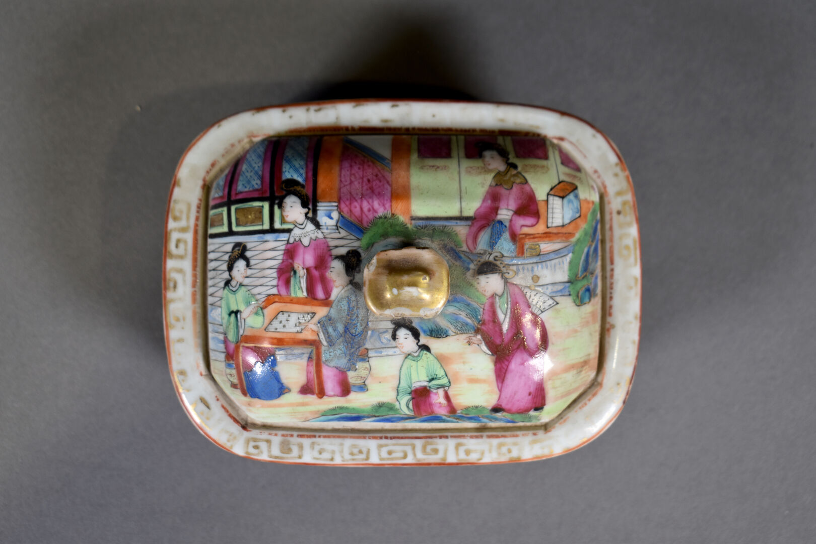 Partie de nécessaire de toilette en porcelaine à décor émaillé en polychromie de scènes de palais, fleurs et insectes dans le goût de la famille rose comprenant : un pot à coton (couvercle accidenté) un porte savon (petits éclats à la prise) et une boîte carrée. Canton, fin du XIXe siècle.