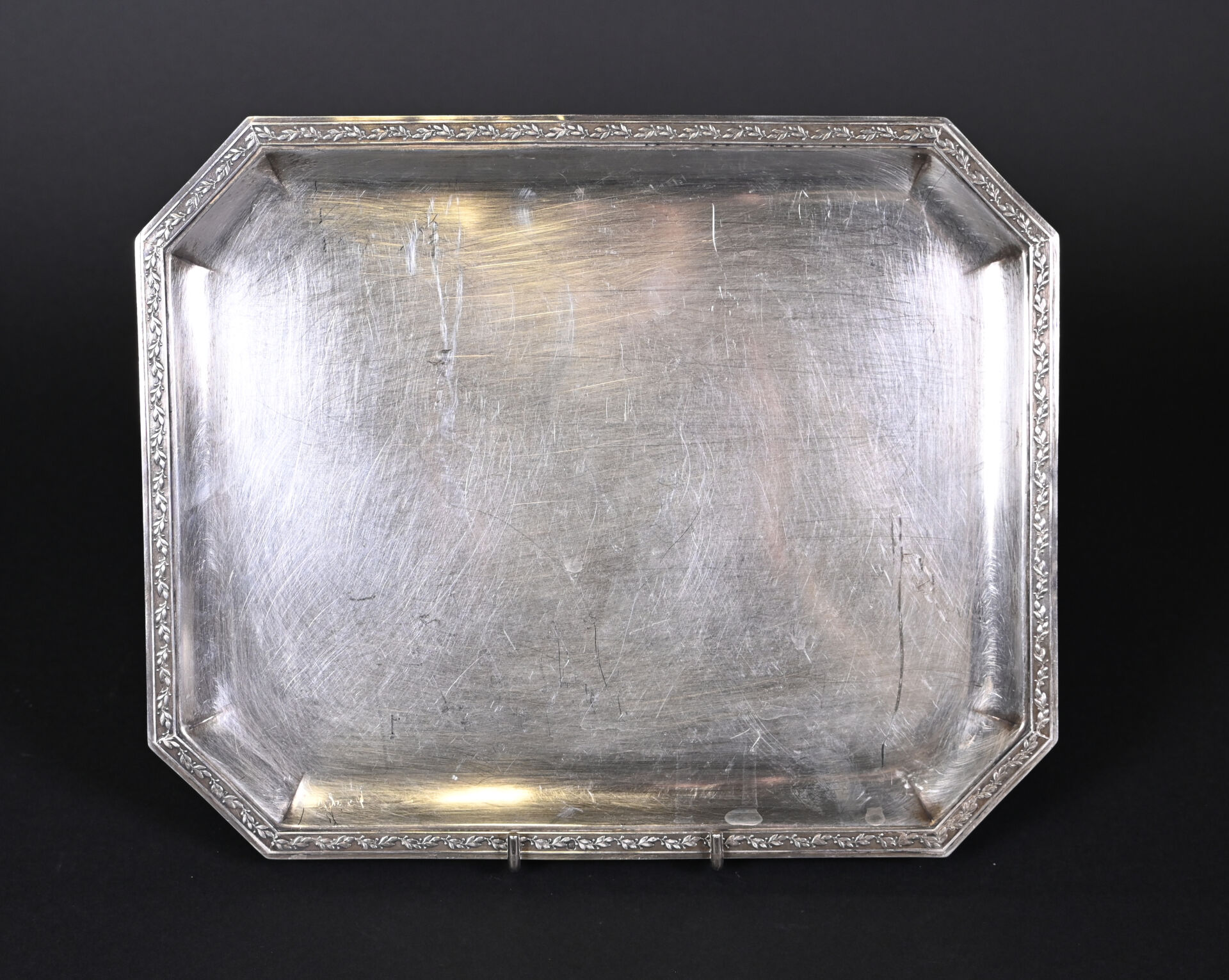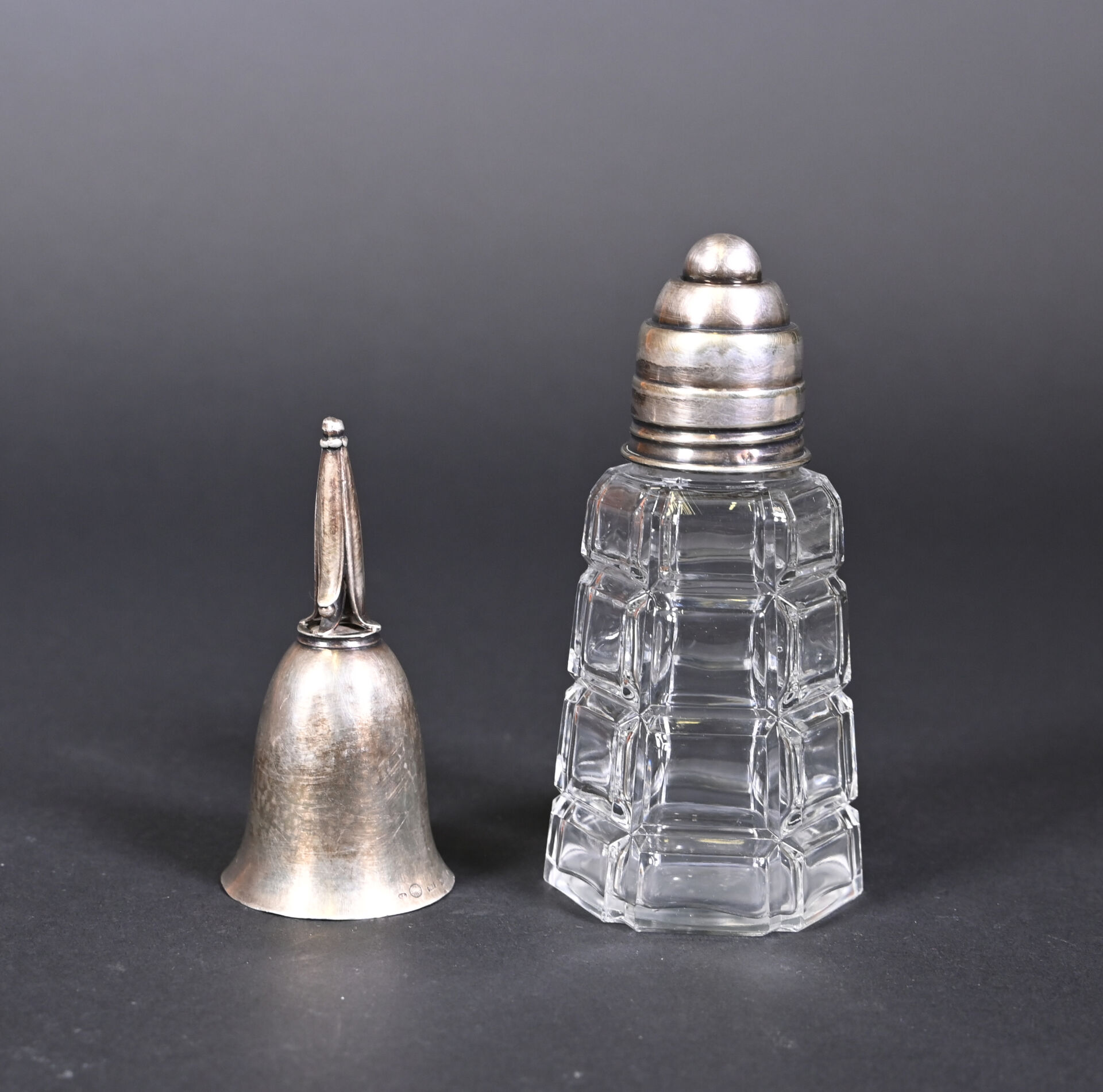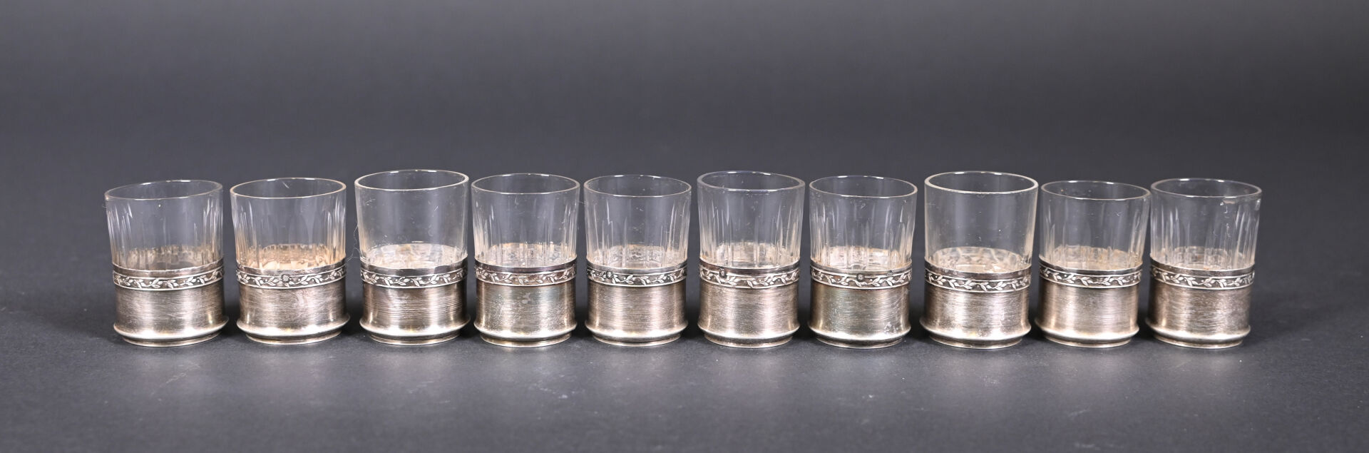Partie de service à liqueur en argent 925/1000e (poinçon Minerve) et verre comprenant 10 petits verres (un à verre remplacé) et un plateau, l’ensemble à décor de frise de laurier. Poids brut total : 330 g. Poids plateau seul : 381 g. On joint une cloche en argent et une saupoudreuse en verre à bouchon en argent. Poids total argent des deux : 110 g.
