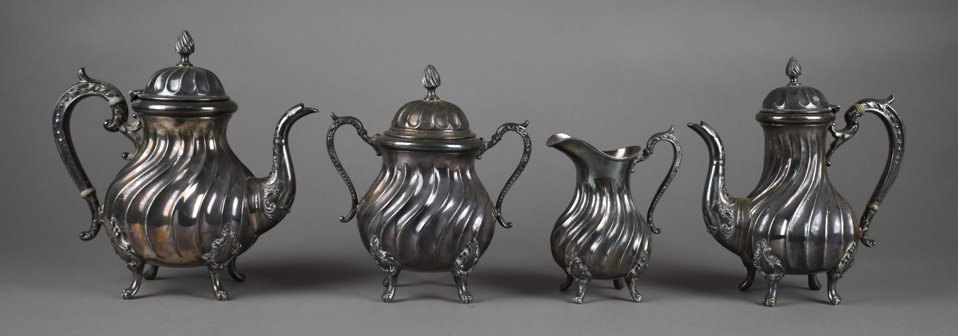 Partie de service à thé en métal argenté comprenant deux théières, un sucrier, un pot à lait.