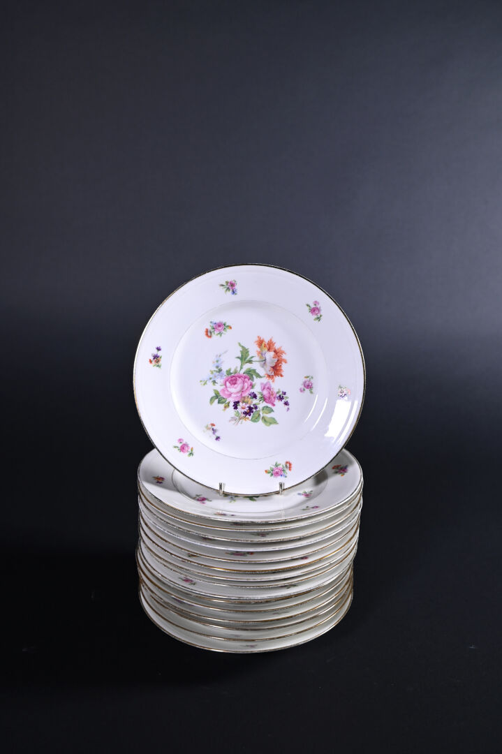 Partie de service de table en porcelaine à décor en polychromie de fleurs et liseré or comprenant 6 assiettes creuses et 10 assiettes plates (usures, un éclat). Marquées PL au dessous.