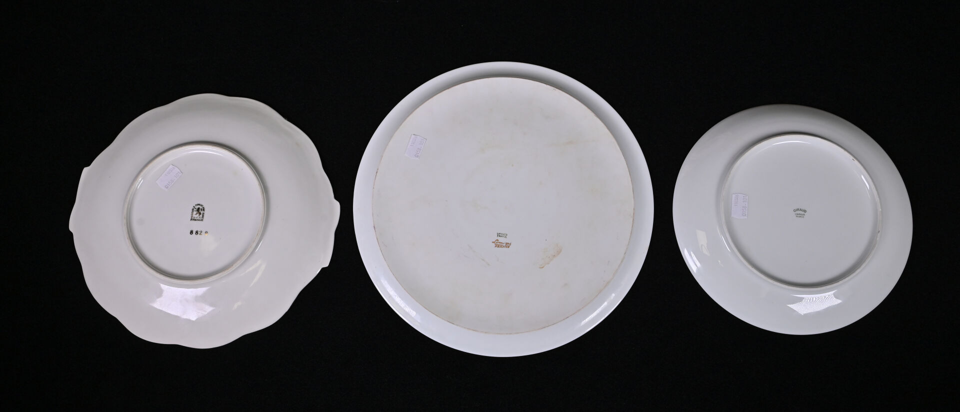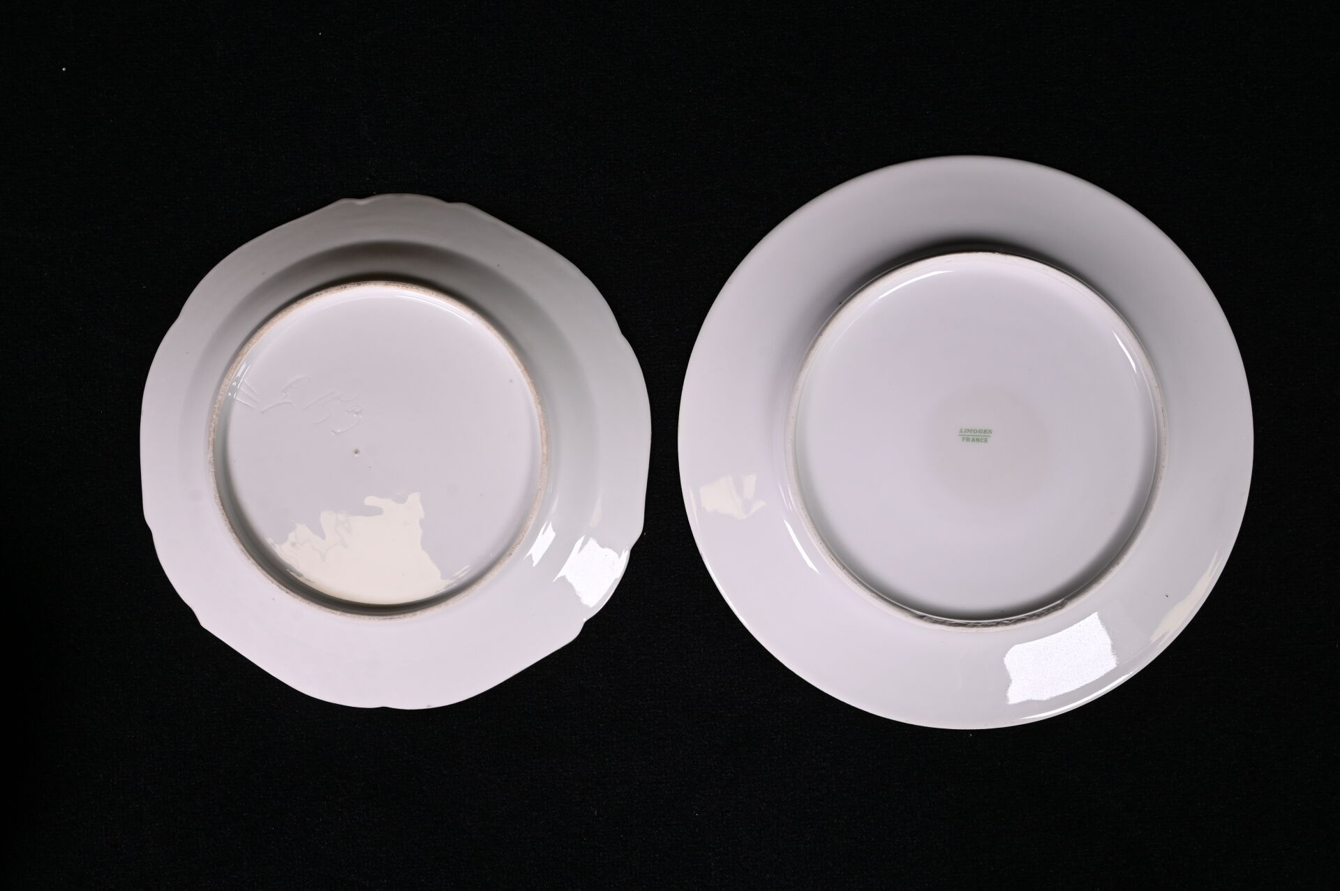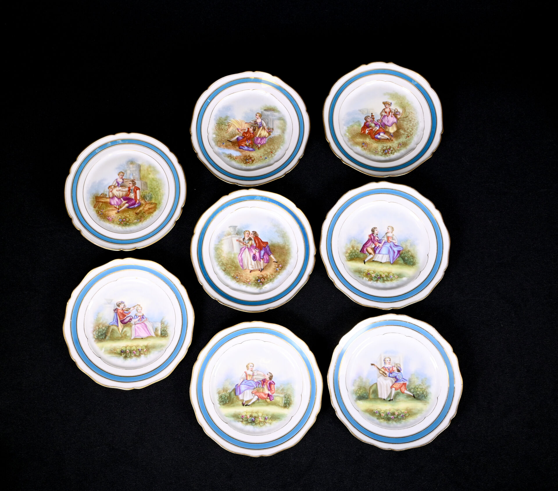 Partie de service de table en porcelaine à décor peint de scènes galantes, bordure violonée turquoise et liseré or soit 7 assiettes et un plat à gâteau (usures). Fin du XIXe ou début du XXe siècle. On joint 12 assiettes en porcelaine à bordure céladon, le bassin centré d’un bouquet de fleurs, Limoges et 3 plats de service plus modernes à décor de scènes galantes (usures sur l’ensemble, éclats).