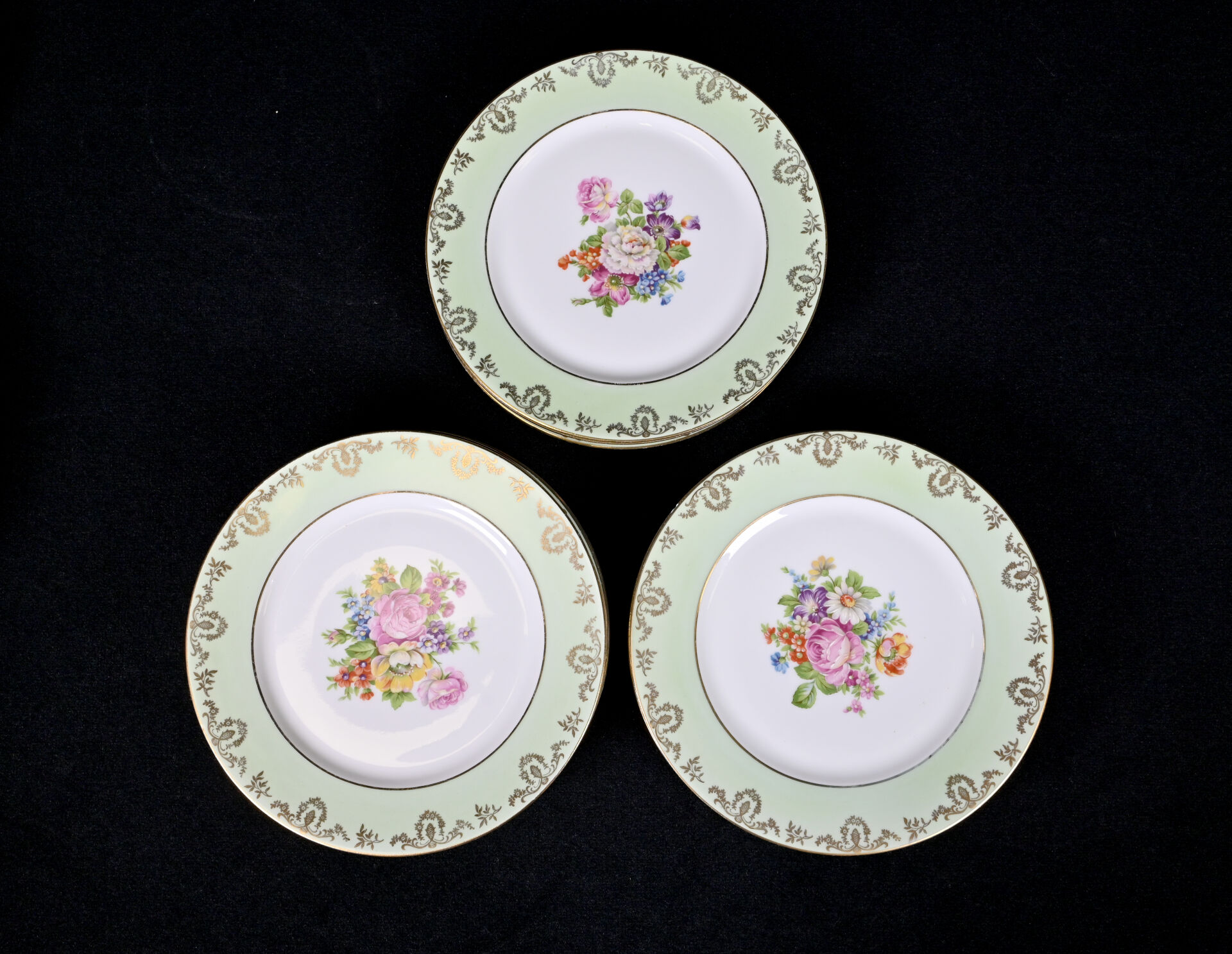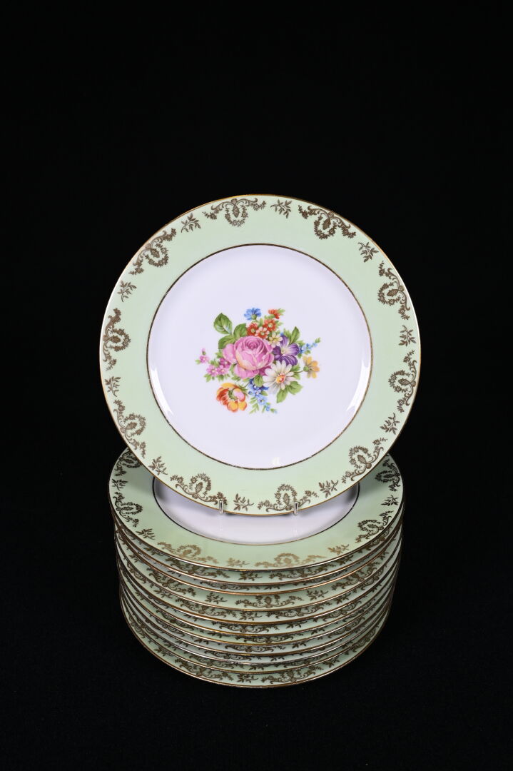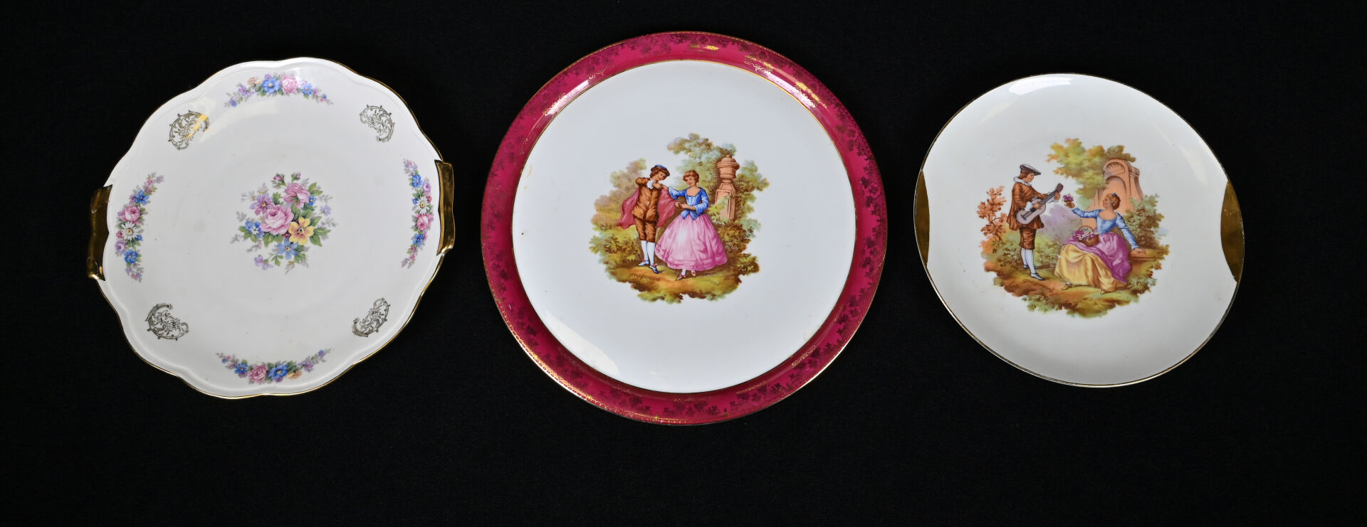 Partie de service de table en porcelaine à décor peint de scènes galantes, bordure violonée turquoise et liseré or soit 7 assiettes et un plat à gâteau (usures). Fin du XIXe ou début du XXe siècle. On joint 12 assiettes en porcelaine à bordure céladon, le bassin centré d’un bouquet de fleurs, Limoges et 3 plats de service plus modernes à décor de scènes galantes (usures sur l’ensemble, éclats).
