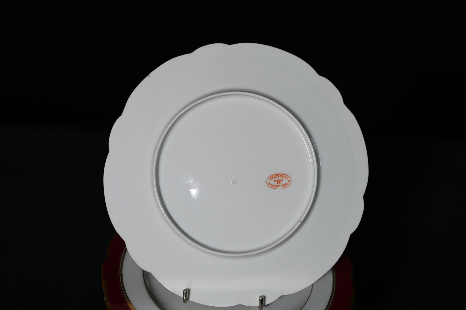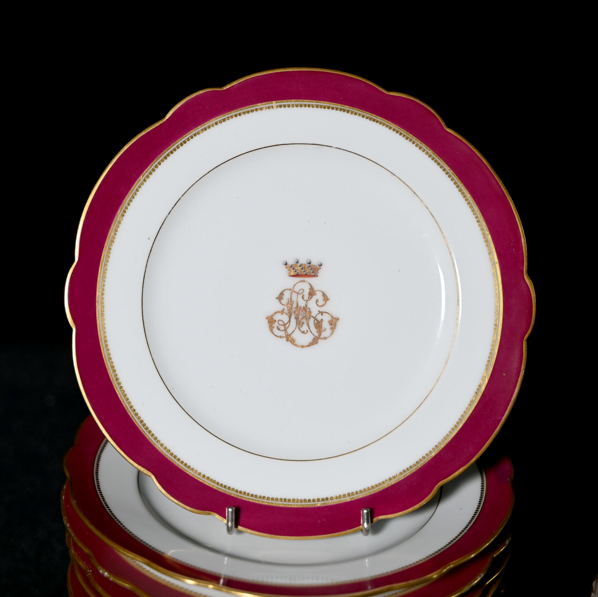 Partie de service de table en porcelaine blanche à bordure violonée bordeaux, liseré or, le fond chiffré sous une couronne de Baron comprenant 13 assiettes à entremets et 1 compotier (un fêle, usures). Probablement Limoges, fin du XIXe siècle.