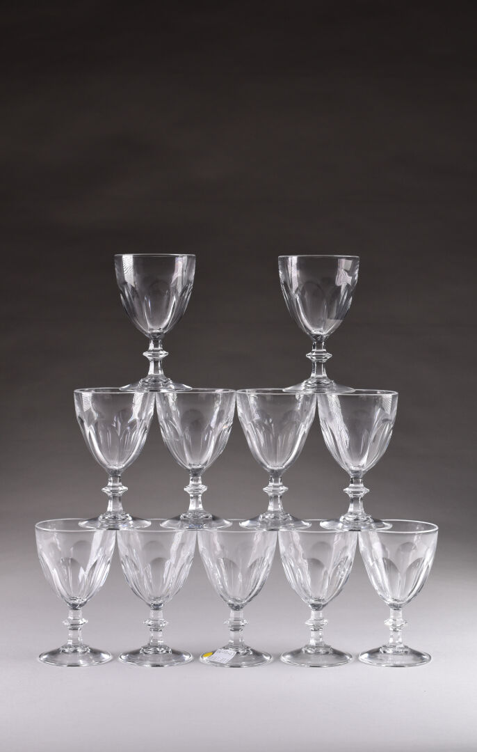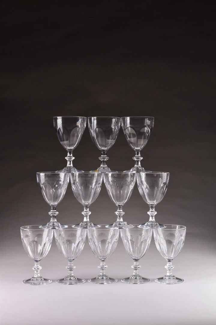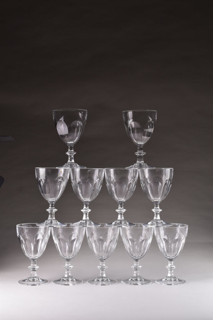 Partie de service de verres à pied comprenant 11 verres à eau, 12 verres à vin, 11 verres à porto, 11 flûtes à champagne. Dans le goût du modèle Harcourt de la maison BACCARAT.