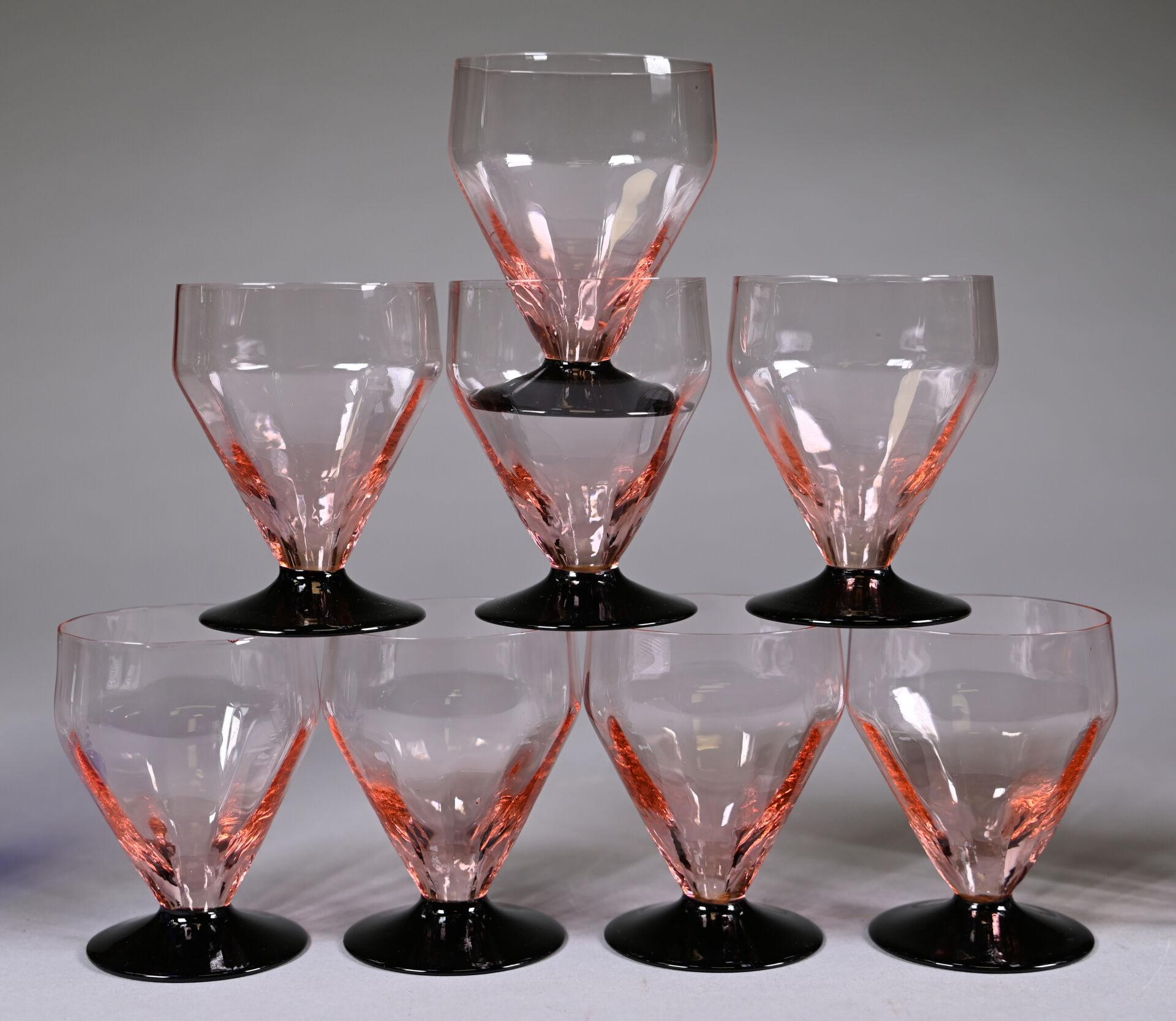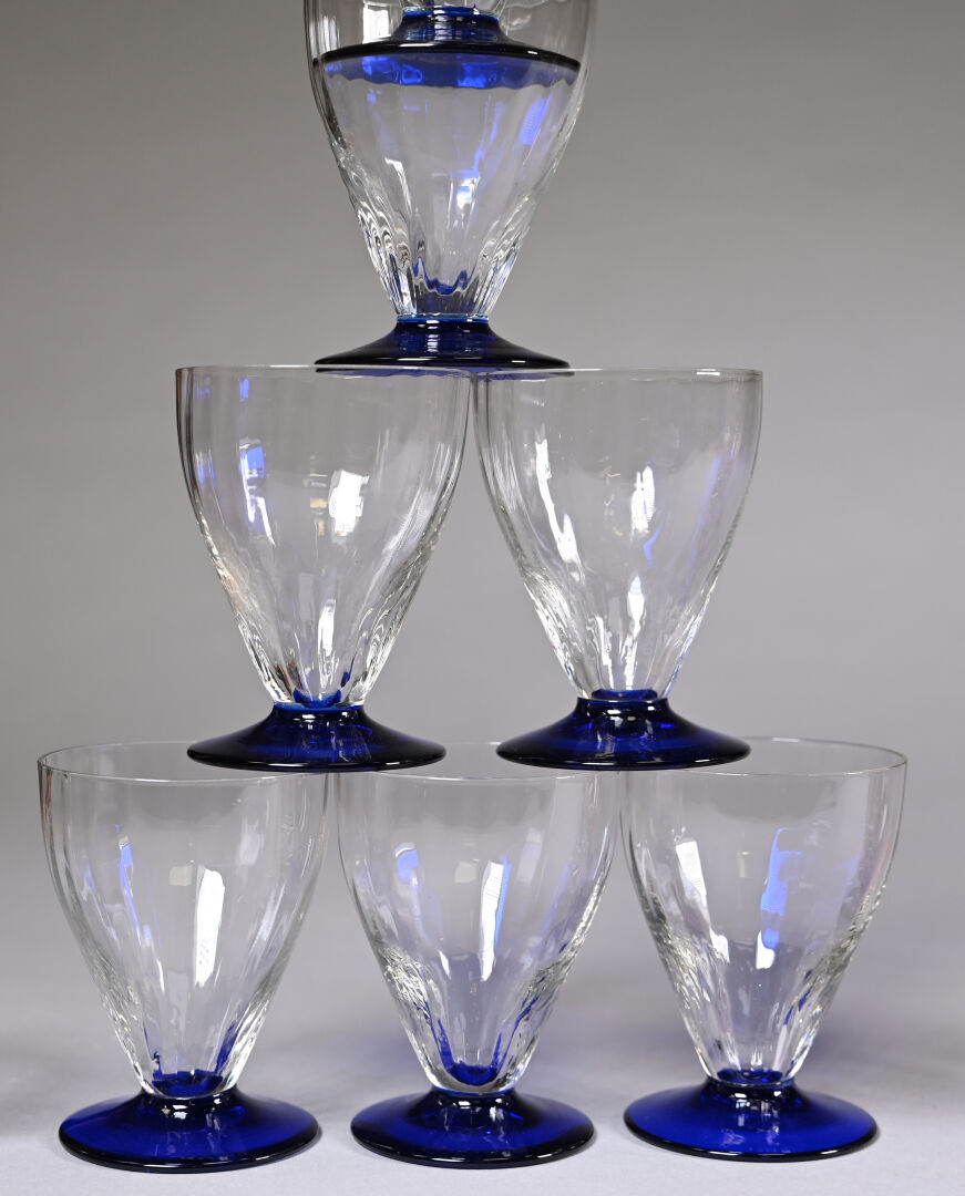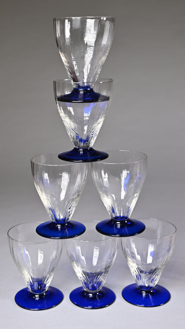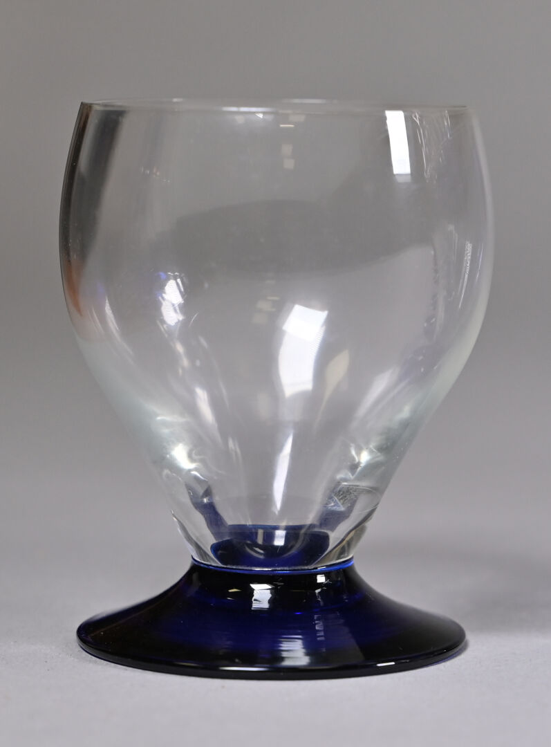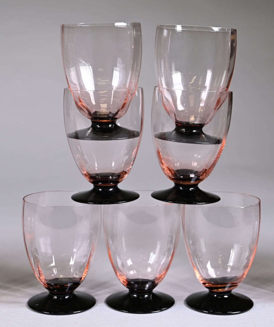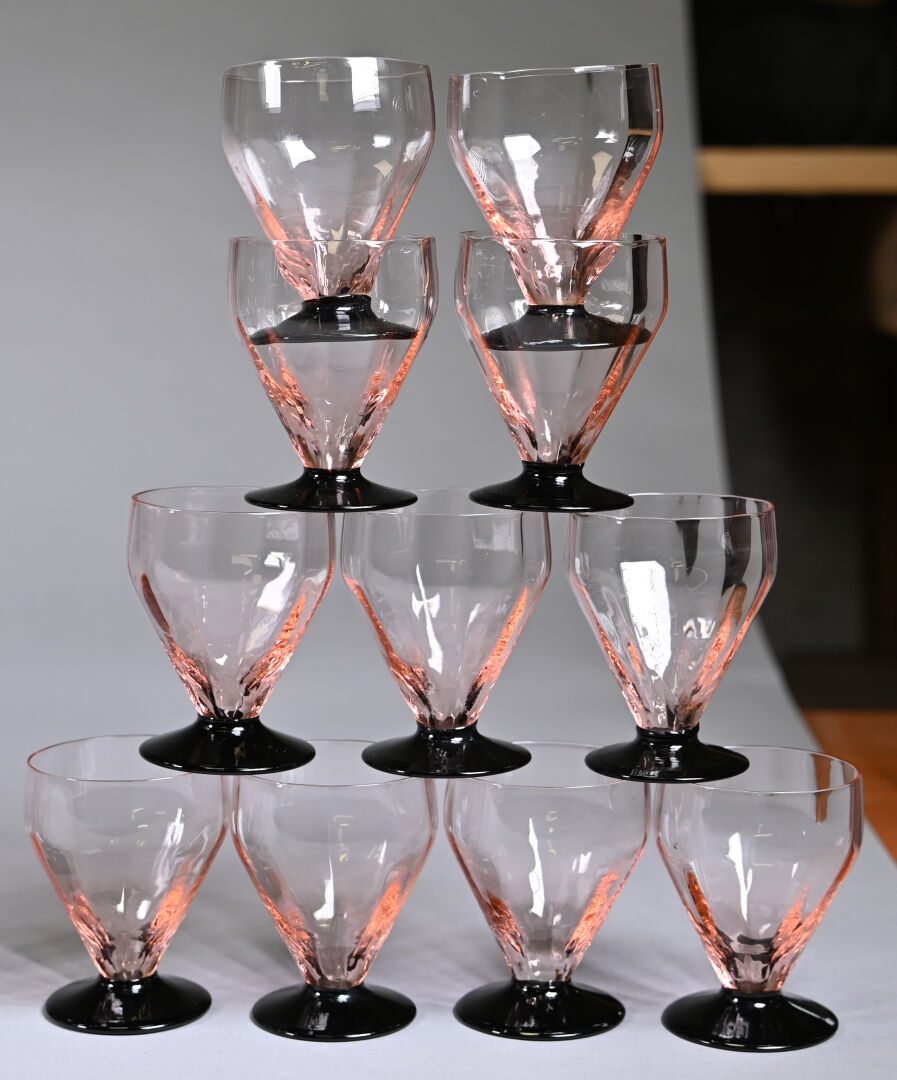 Partie de service de verres en verre rose et noir soit 7 verres à eau 8 verres à vin rouge et 11 verres à vin blanc (égrenures). Haut. des verres à eau : 10,5 cm Thouvenin ou Portieux . On joint 8 verres (7+1) de modèles approchant à piedouche bleu.