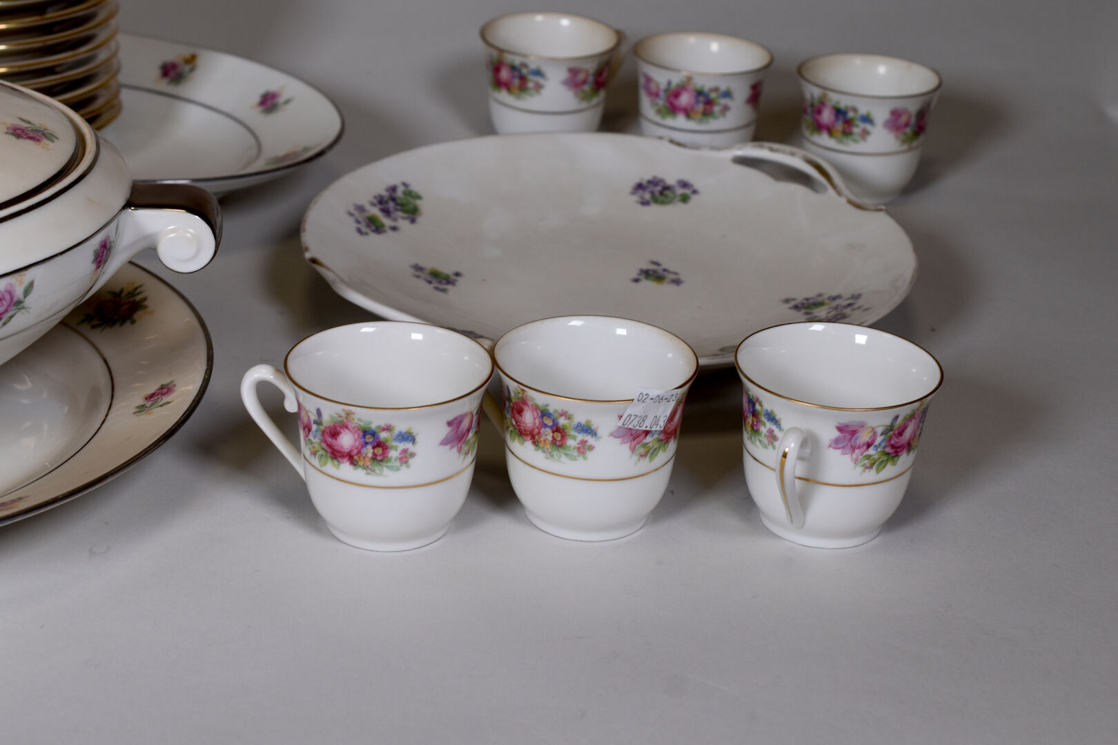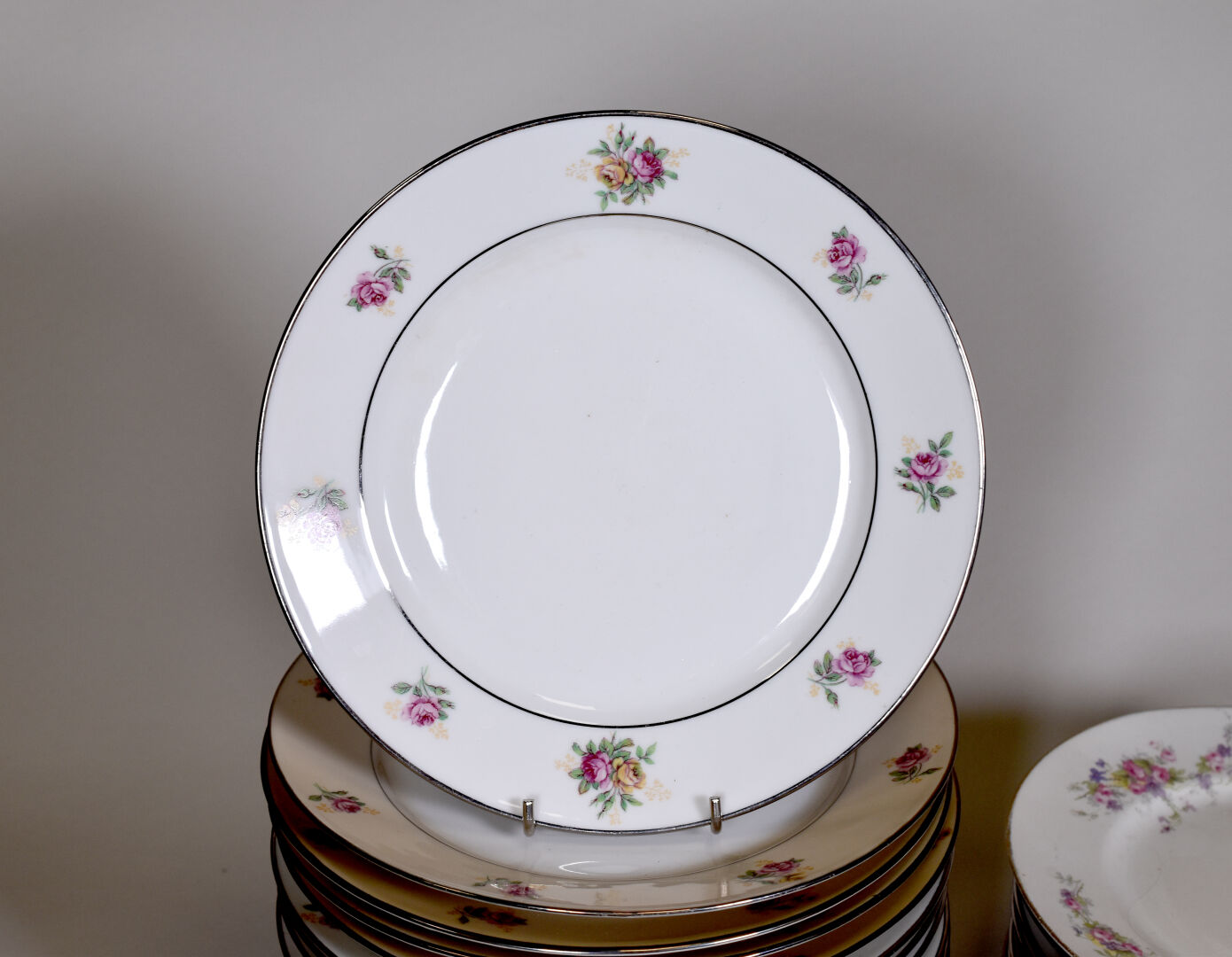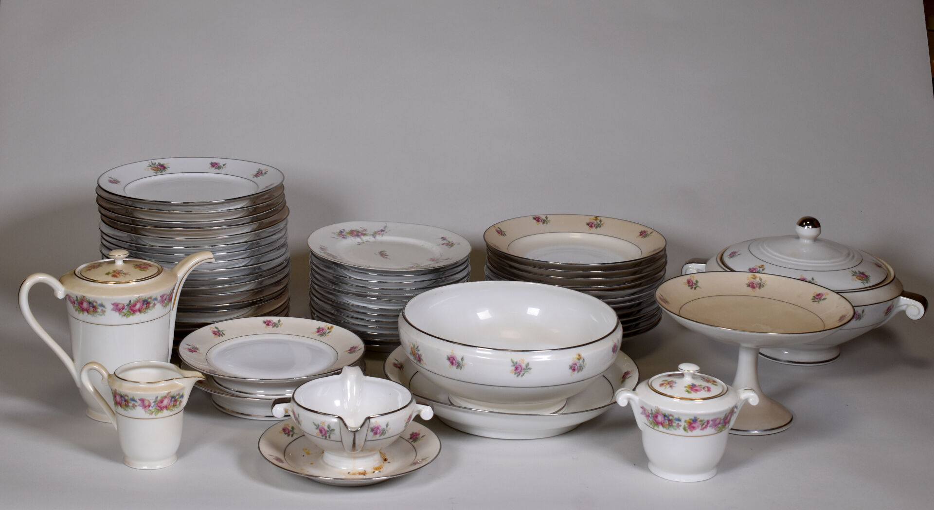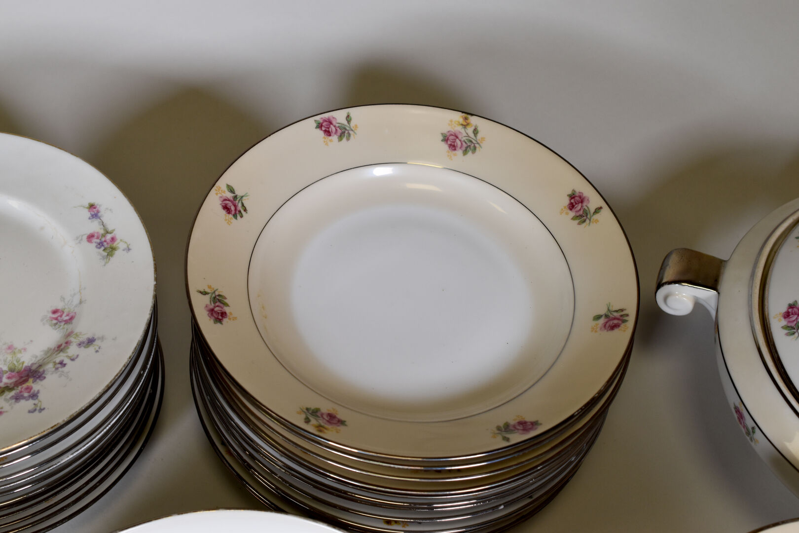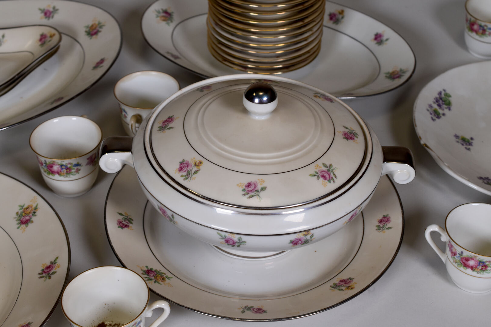 Parties de service de table en porcelaine dans le goût de Limoges à décor liseré or ou gris, la bordure ornée de fleurs (salissures).