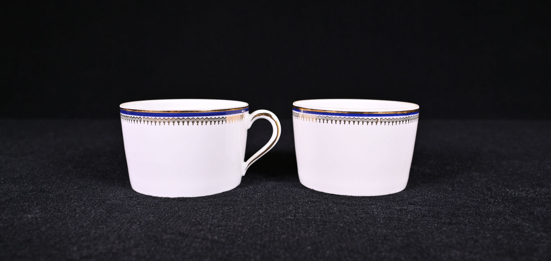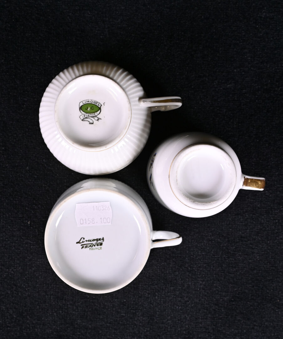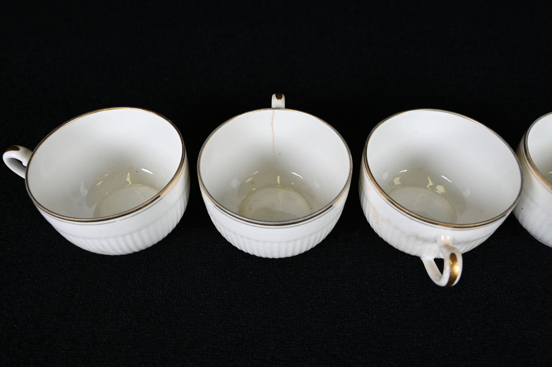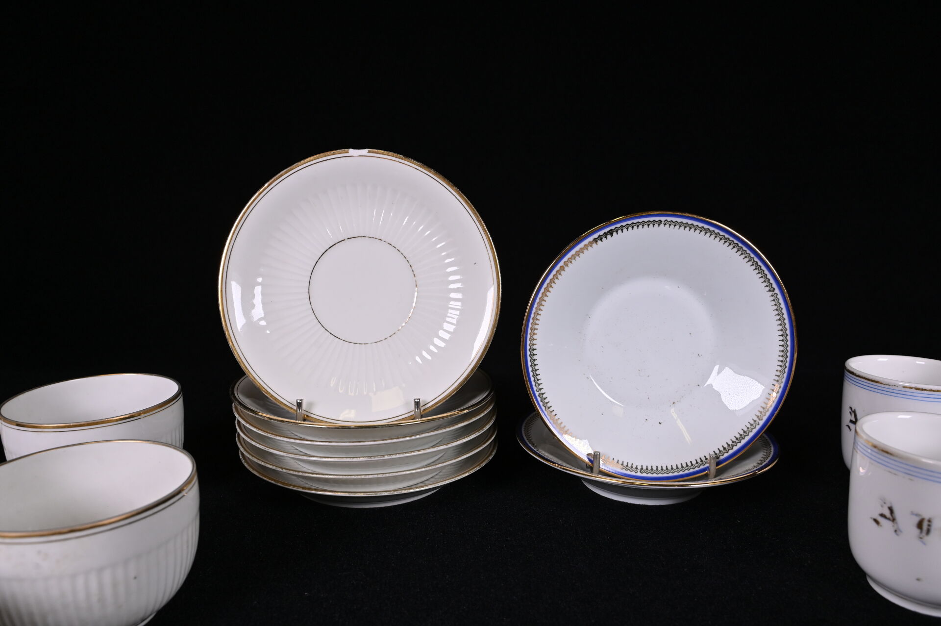 Parties de services à café en porcelaine blanche (3 modèles), liseré or et bleu, un modèle chiffré (usures, fèle et égrenures). Soit 9 tasses chiffrées, 2 tasses et sous-tasses à liseré bleu et 5 tasses et 6 sous-tasses liseré or (éclats).