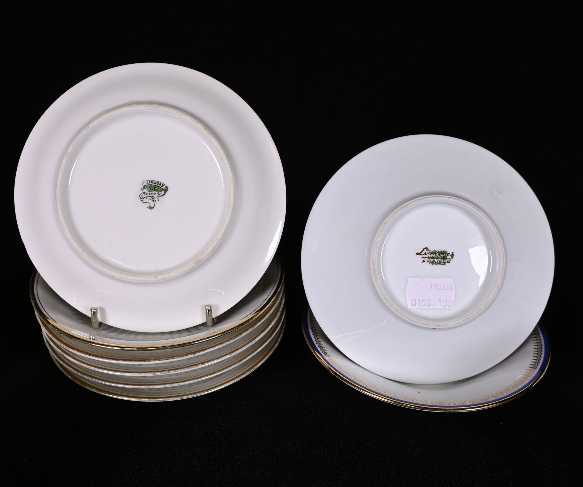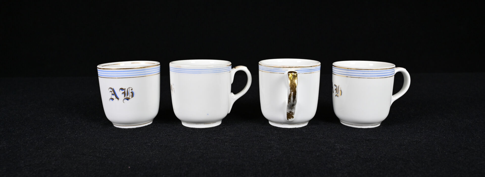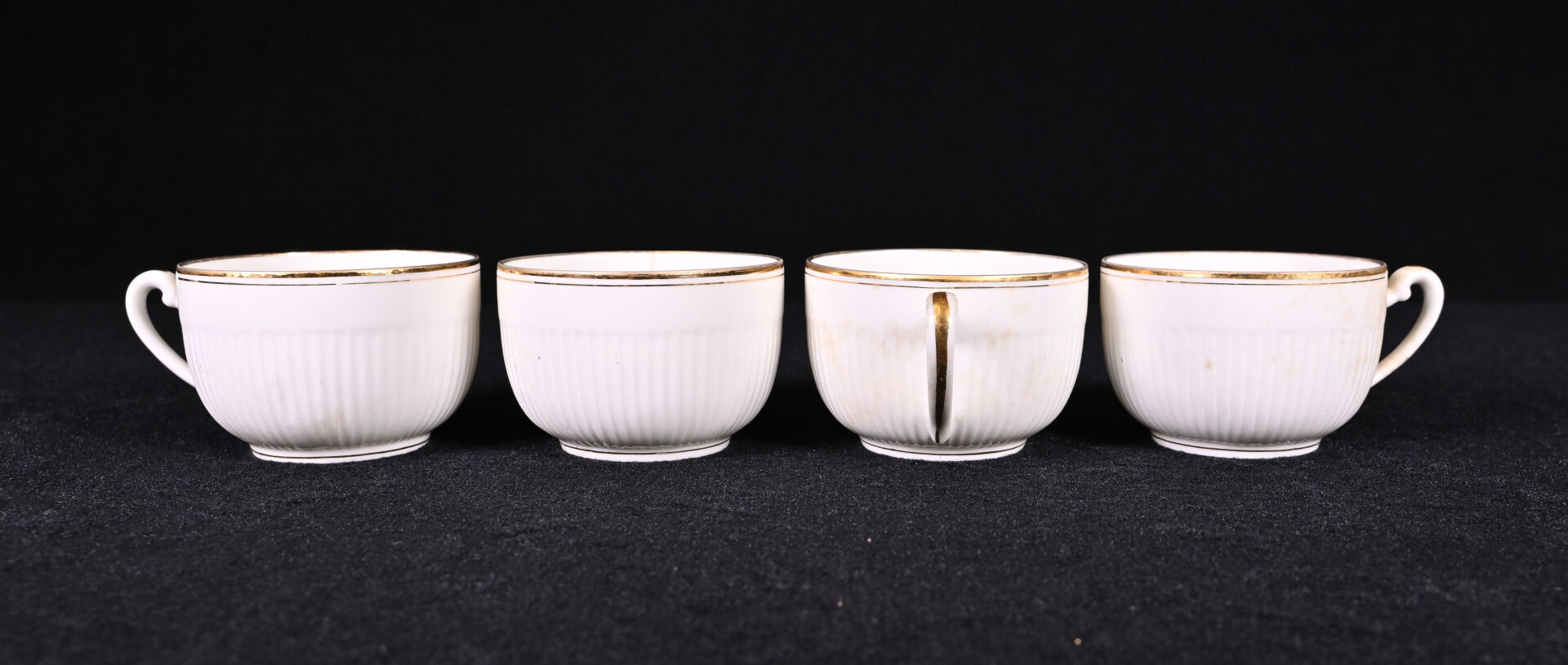Parties de services à café en porcelaine blanche (3 modèles), liseré or et bleu, un modèle chiffré (usures, fèle et égrenures). Soit 9 tasses chiffrées, 2 tasses et sous-tasses à liseré bleu et 5 tasses et 6 sous-tasses liseré or (éclats).
