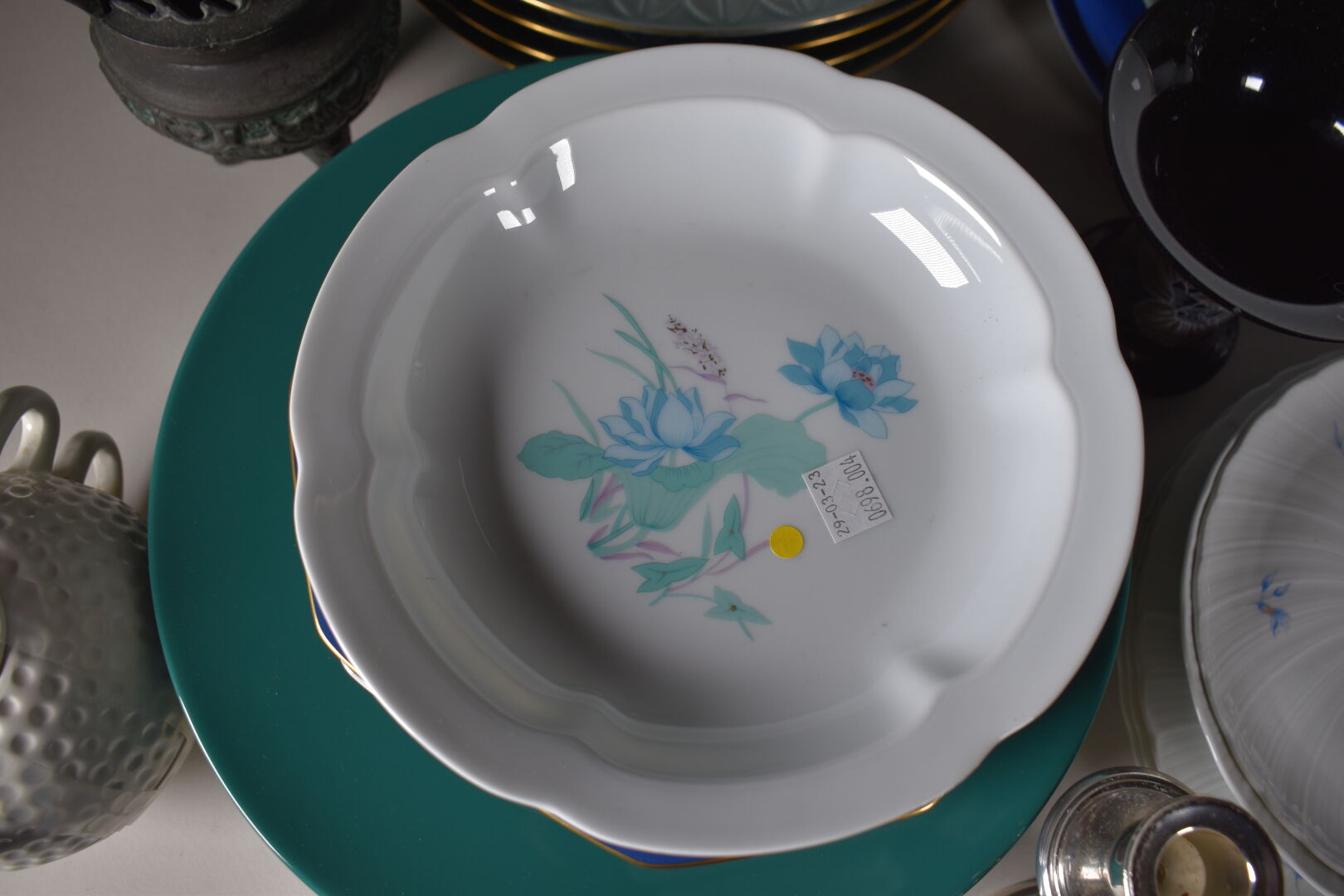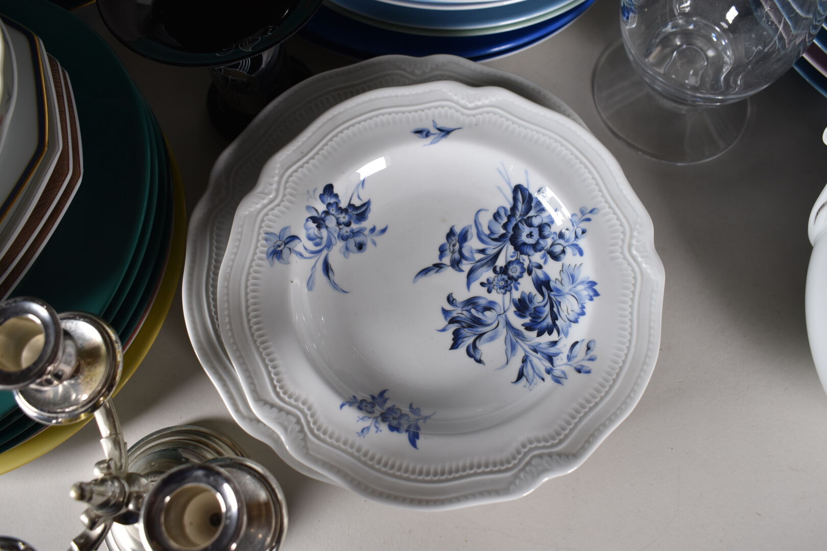 Parties de services de table en porcelaine dont Limoges, assiettes de présentation dont Coquet, JAMMET SEIGNOLLES, bougeoir en métal argenté, repose couteaux en verre et divers.