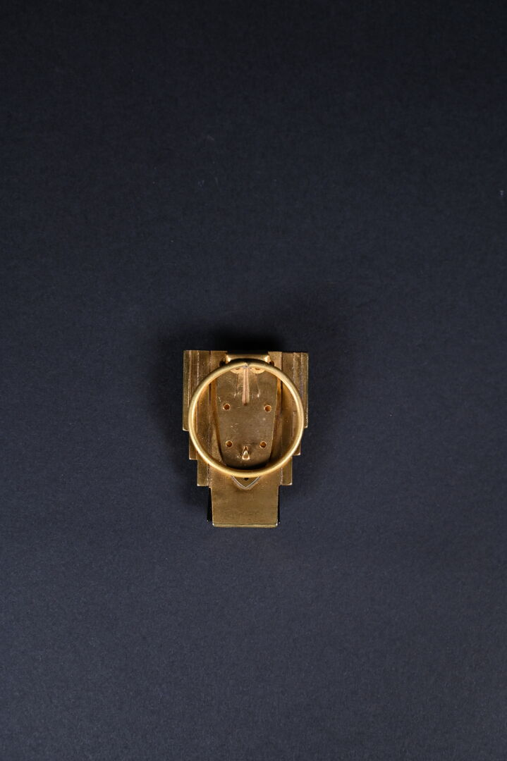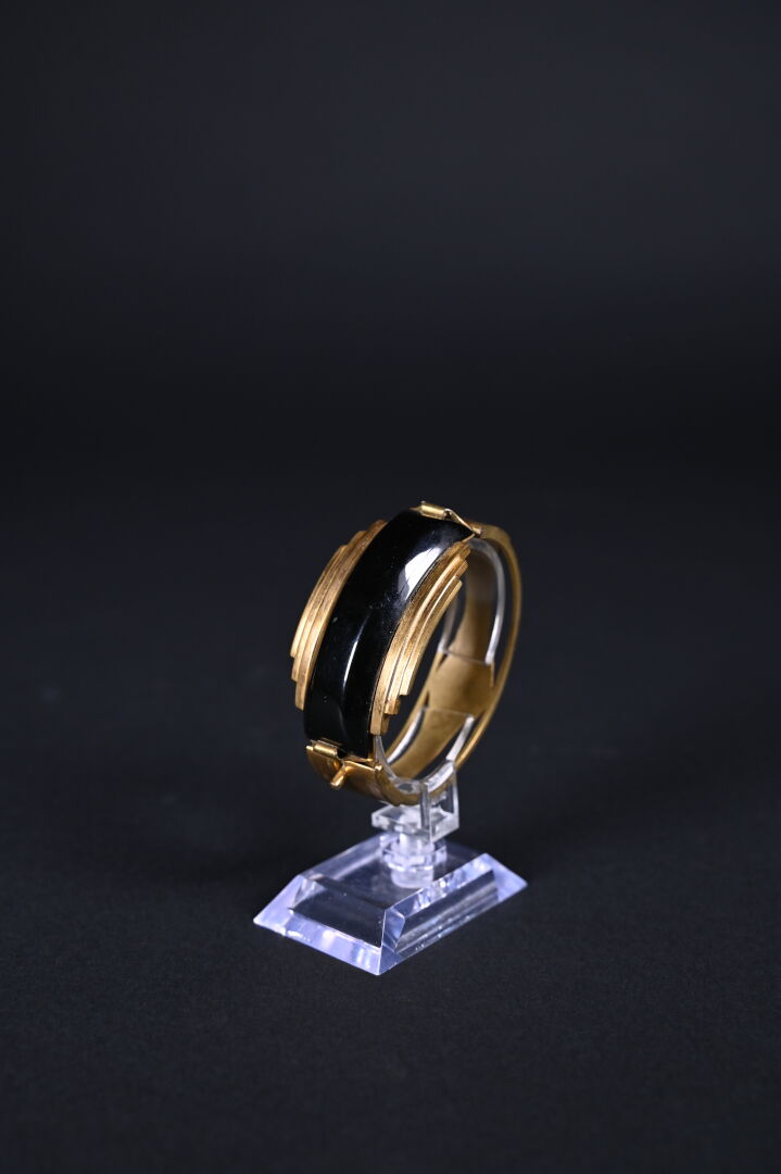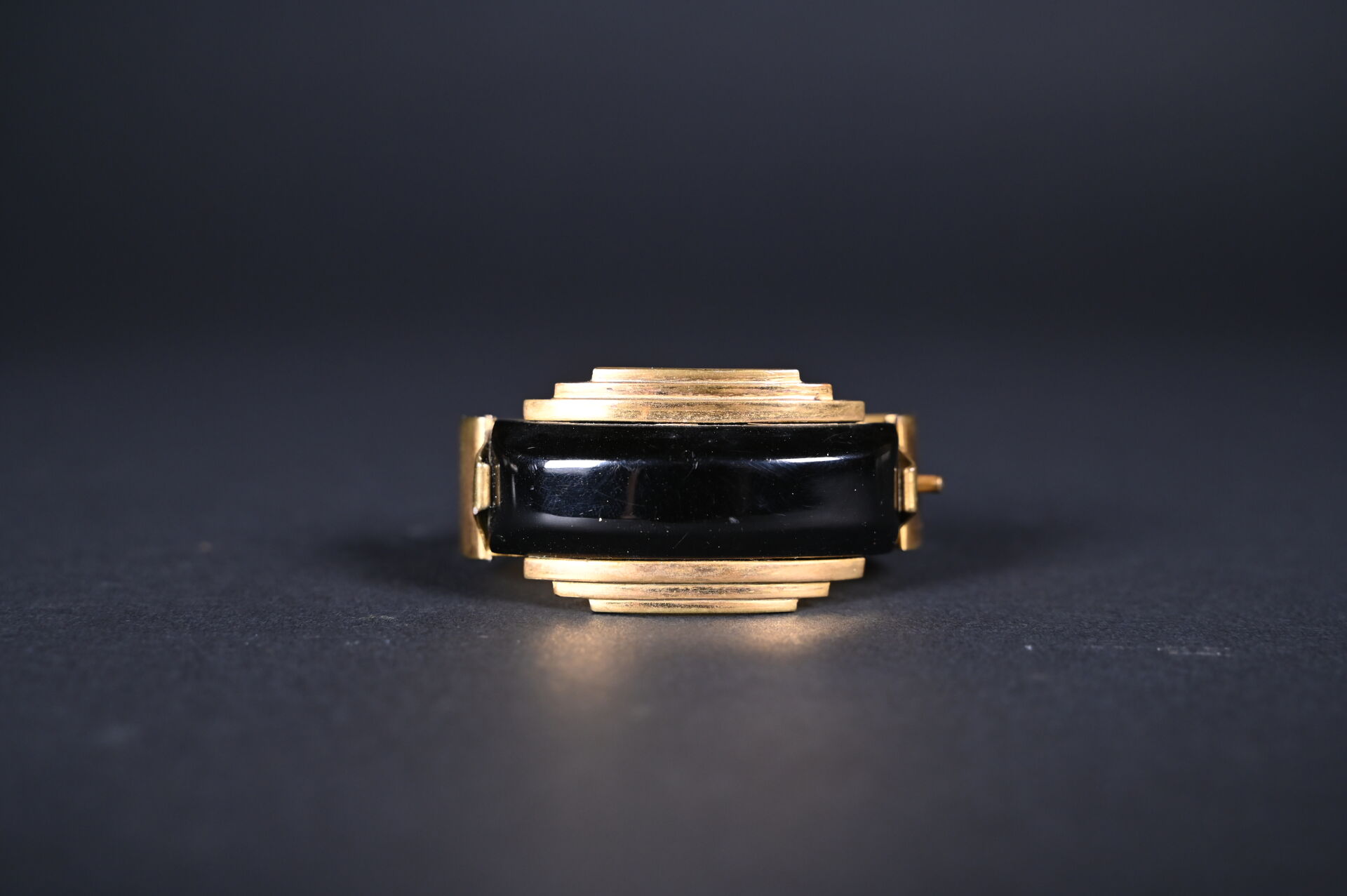 Parure en laiton et bakélite noire soit un bracelet et un clip de revers ou boucle de ceinture. Avec boite. Epoque Art Déco.