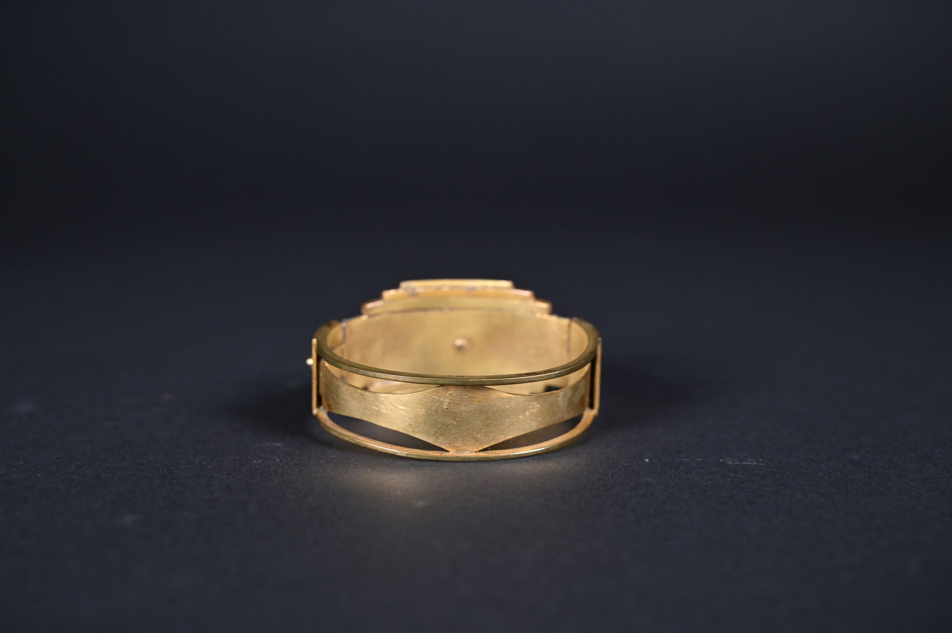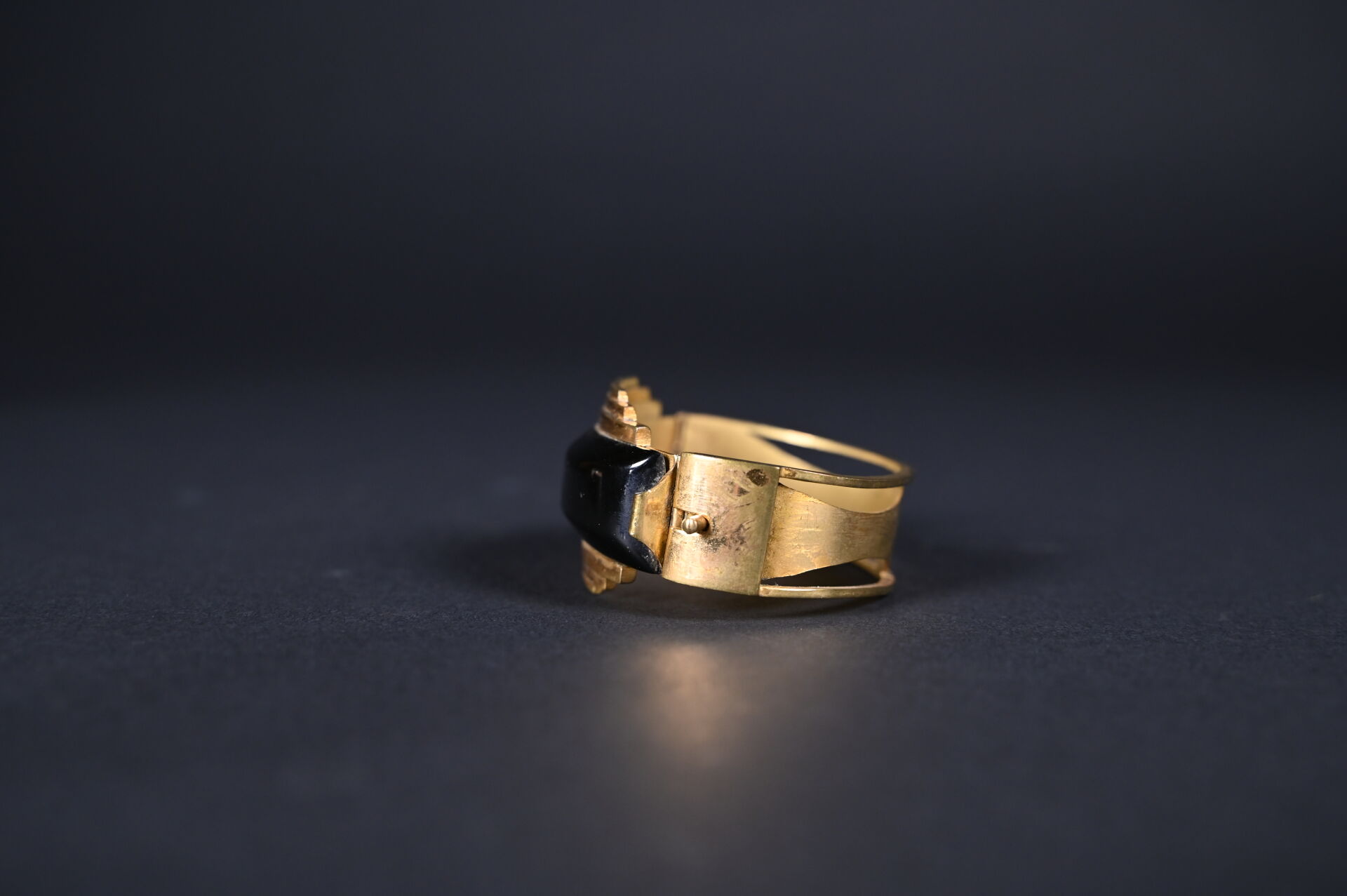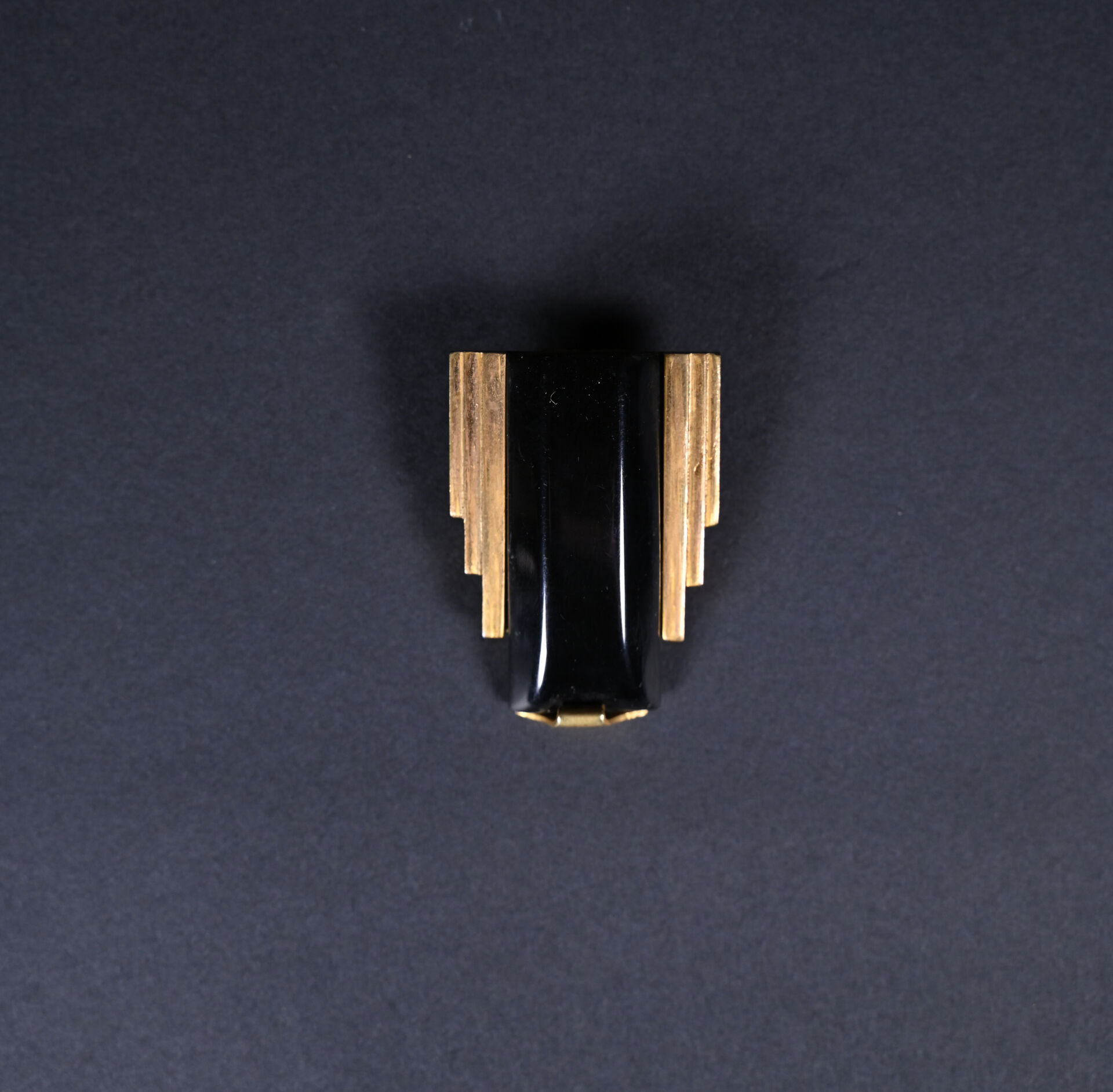Parure en laiton et bakélite noire soit un bracelet et un clip de revers ou boucle de ceinture. Avec boite. Epoque Art Déco.