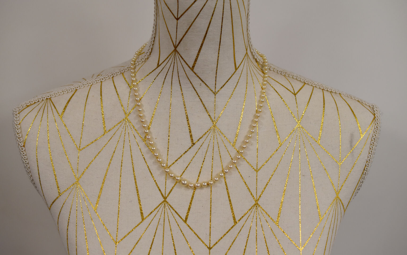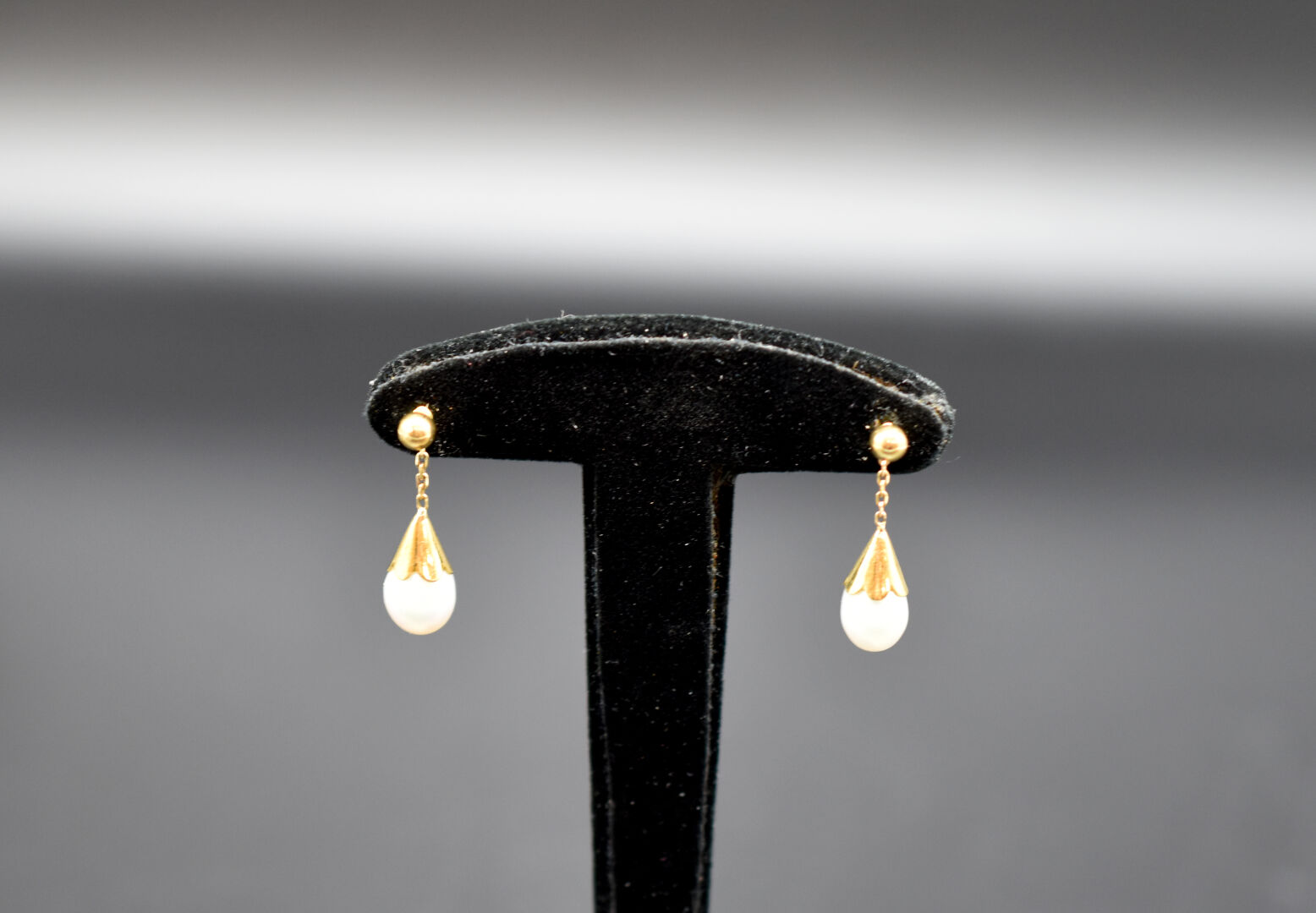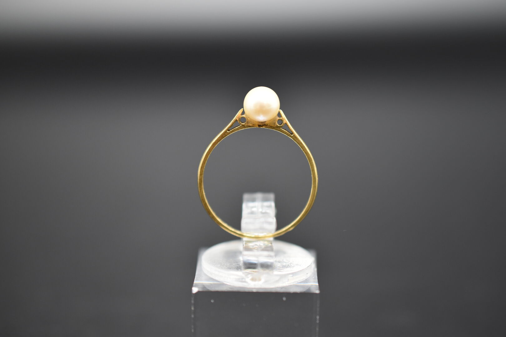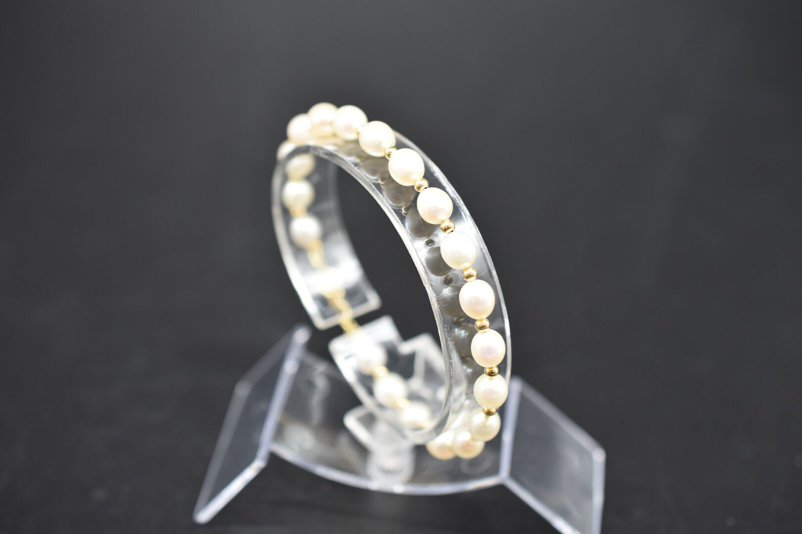 Parure en or jaune 18K 750/1000e et perles de culture soit une paire de dormeuses, une bague, un bracelet souple et un collier choker. Poids brut total : 25,78 g.