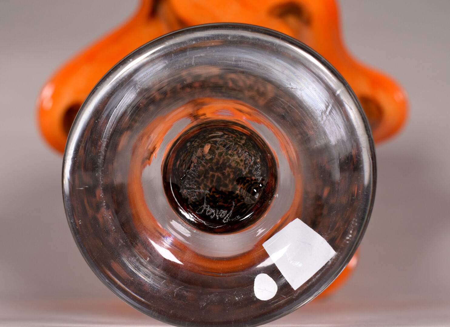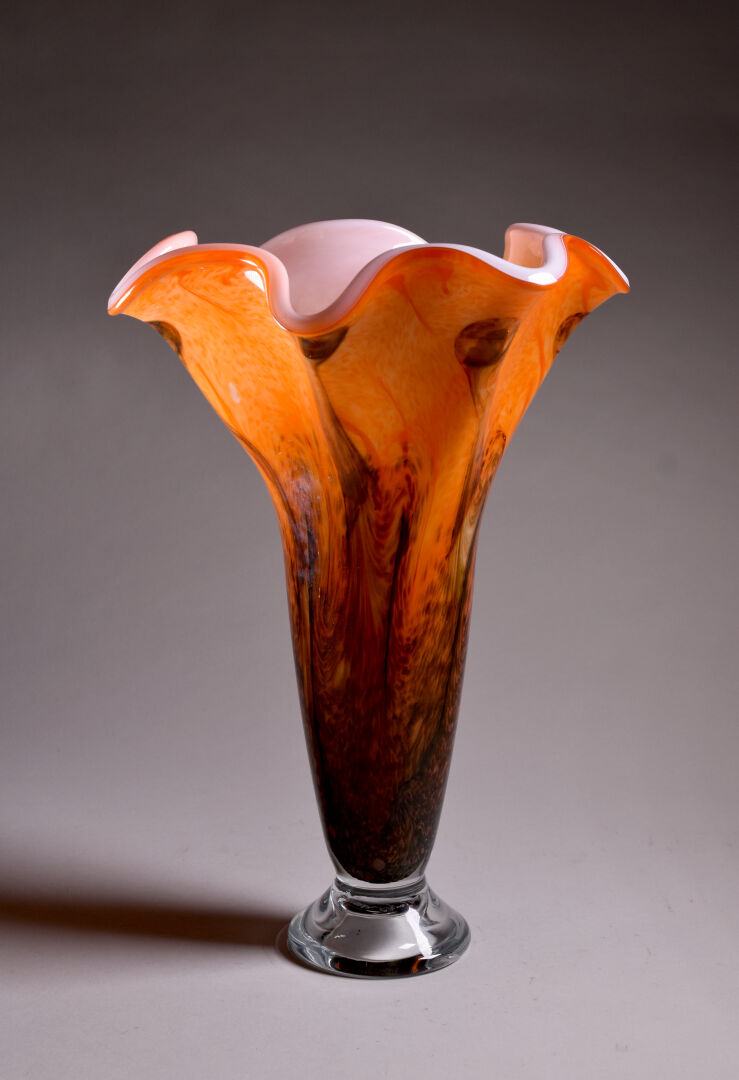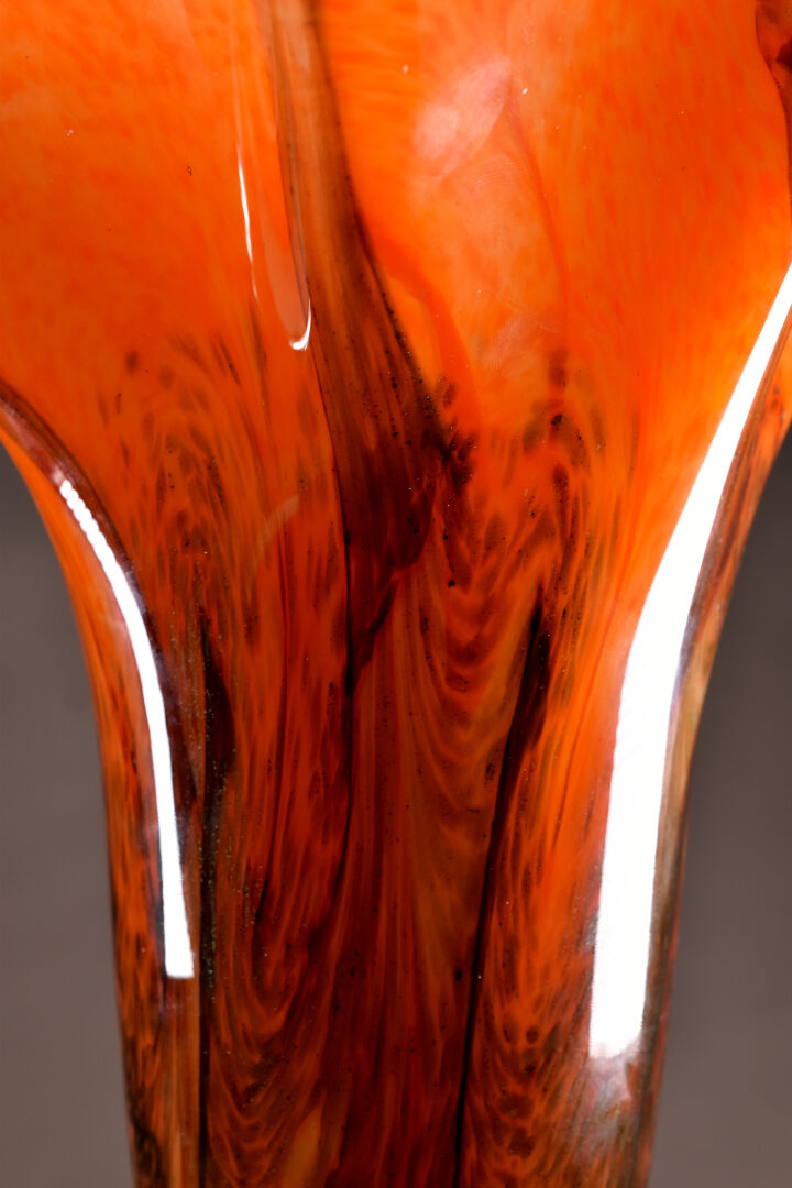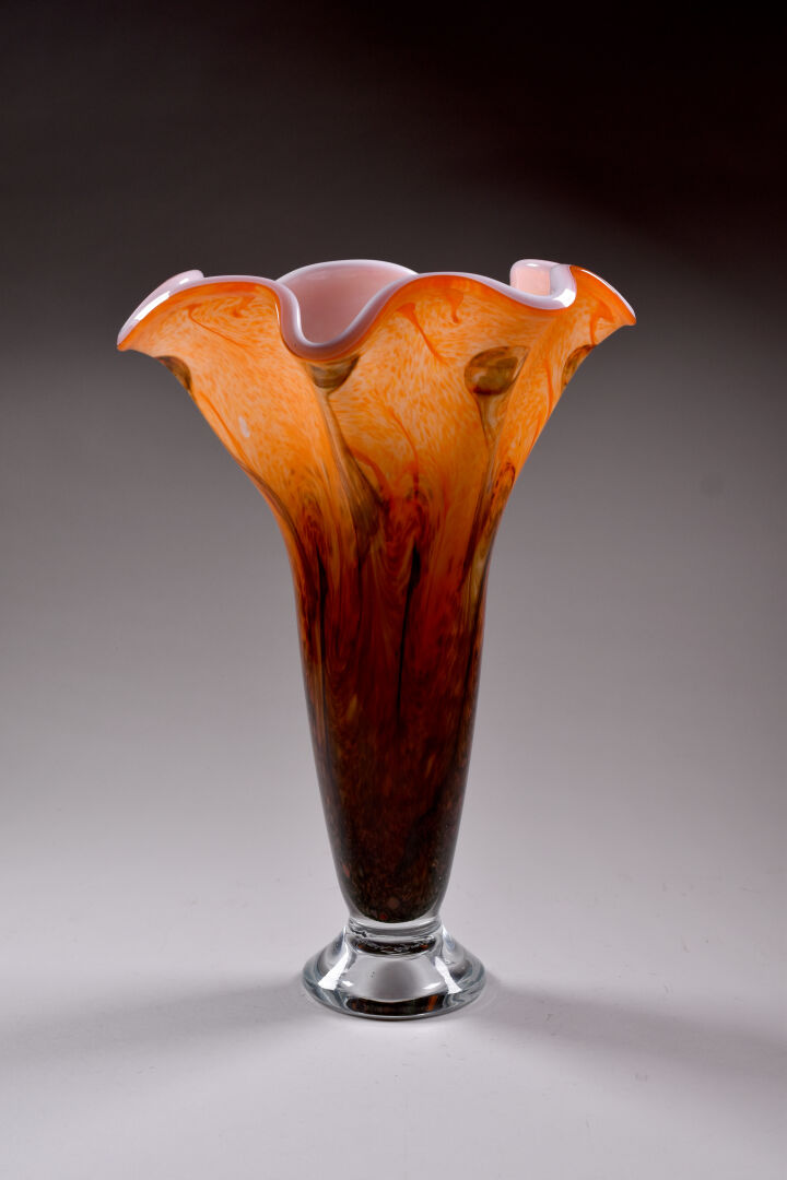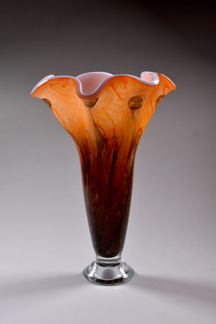 Pascal GUERNIC (XXe siècle) à Montpazier. Vase cornet à corolle sur piedouche en verre multicouche marmoréen orange et brun, l’intérieur doublé blanc. Signé à la pointe au dessous. Haut. : 45 cm.
