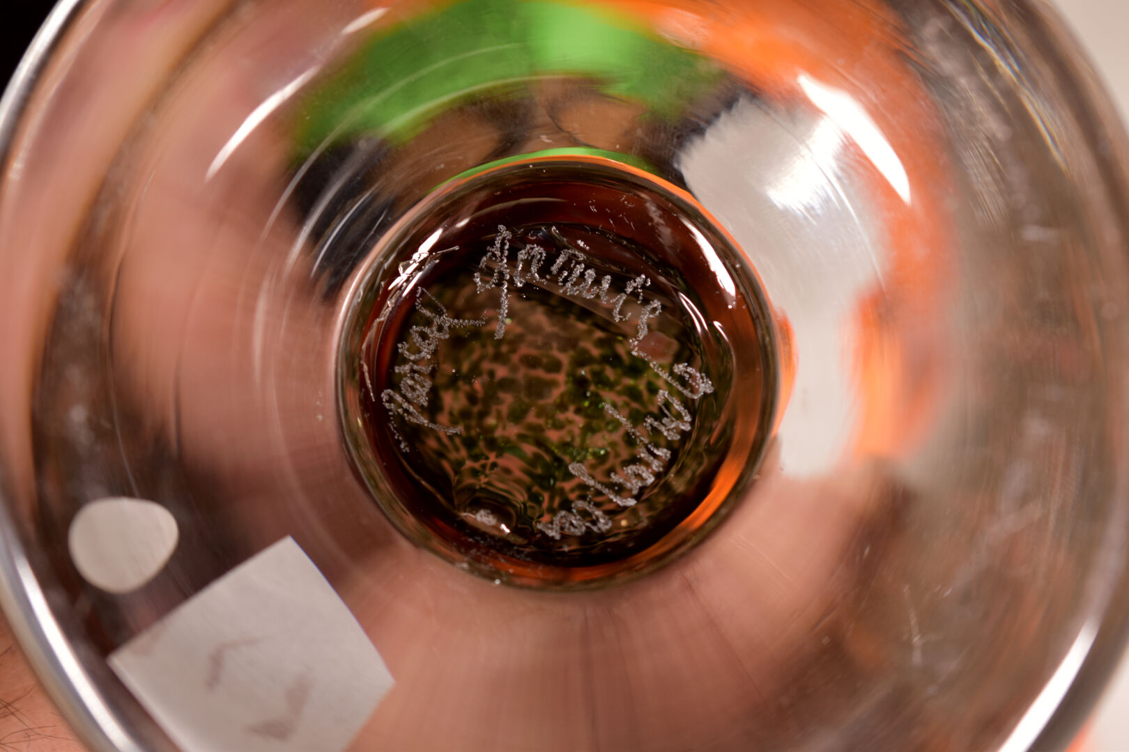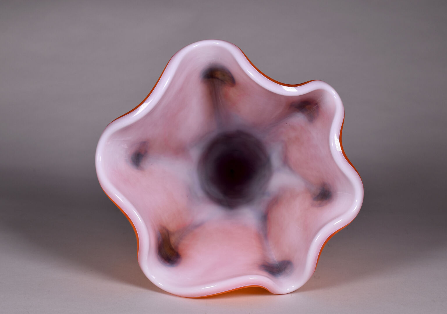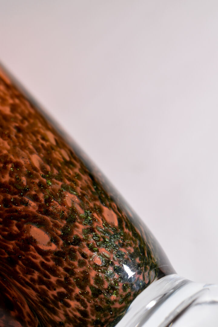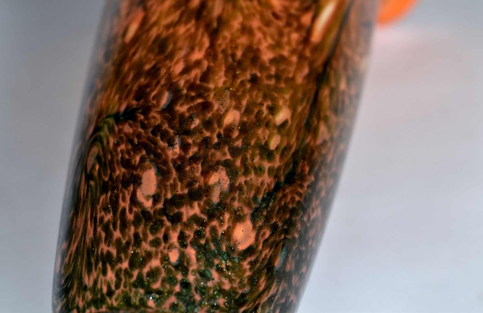Pascal GUERNIC (XXe siècle) à Montpazier. Vase cornet à corolle sur piedouche en verre multicouche marmoréen orange et brun, l’intérieur doublé blanc. Signé à la pointe au dessous. Haut. : 45 cm.