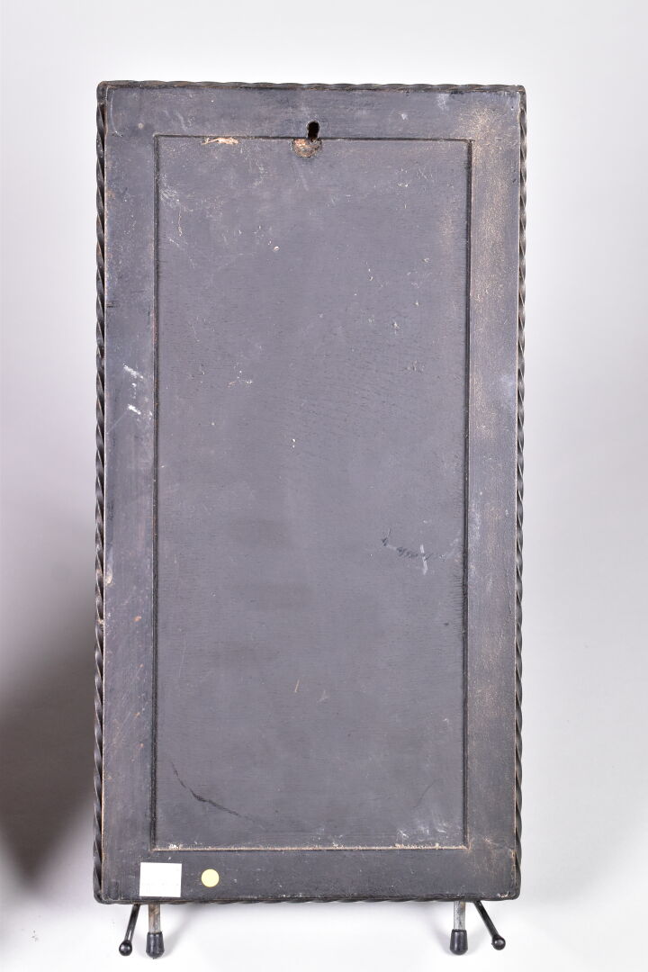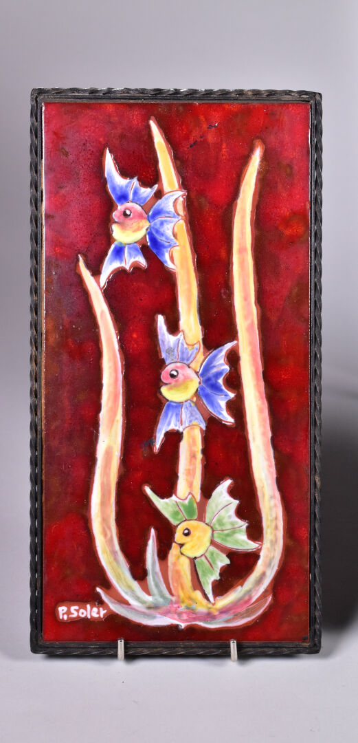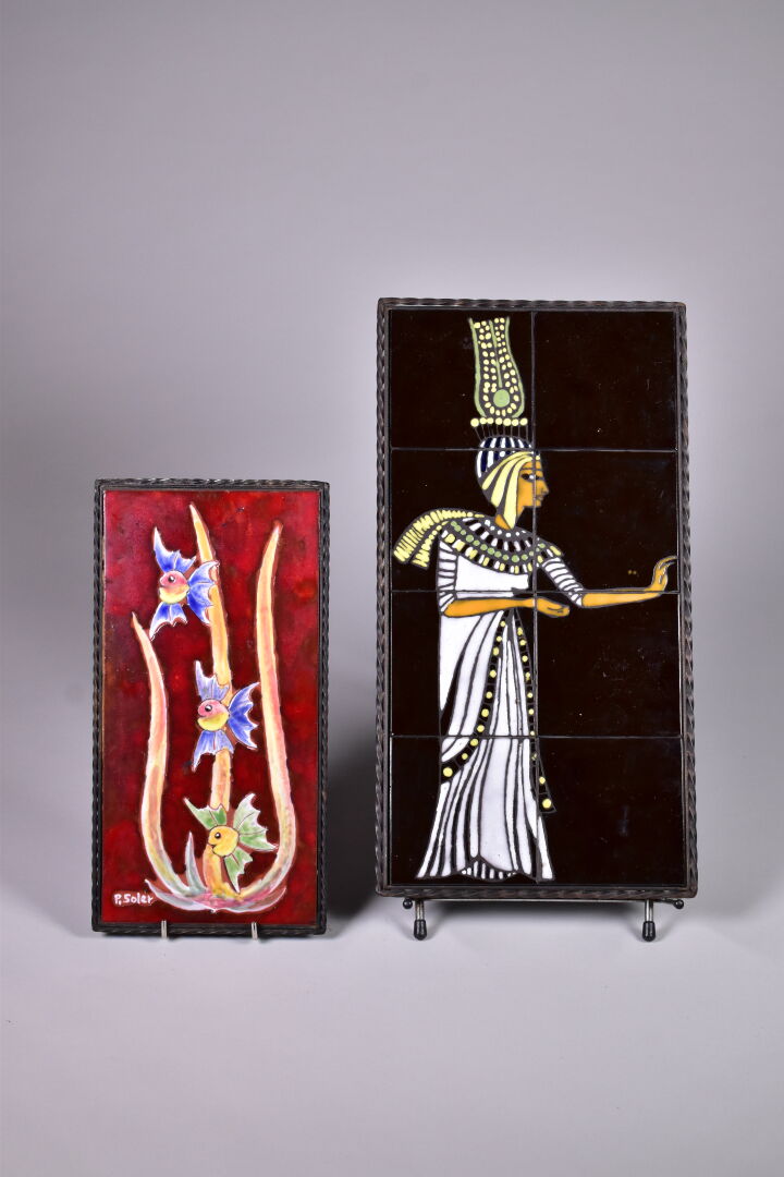 Pascal SOLER à VALLAURIS. Carreau de céramique émaillé en polychromie de poissons sur fond rouge. Signé en bas à gauche. Cadre en métal torsadé. 30,5 x 15,5 cm. On joint un second à décor d’une égyptienne sur fond brun. 41,5 x 21,5 cm.
