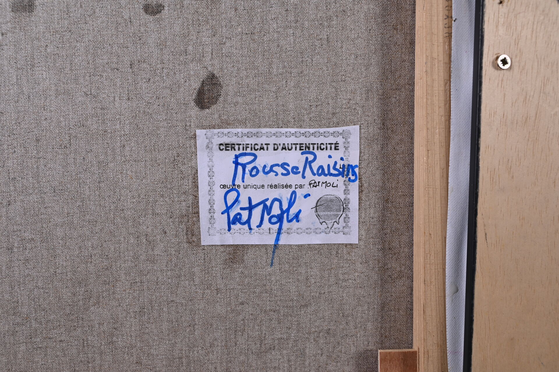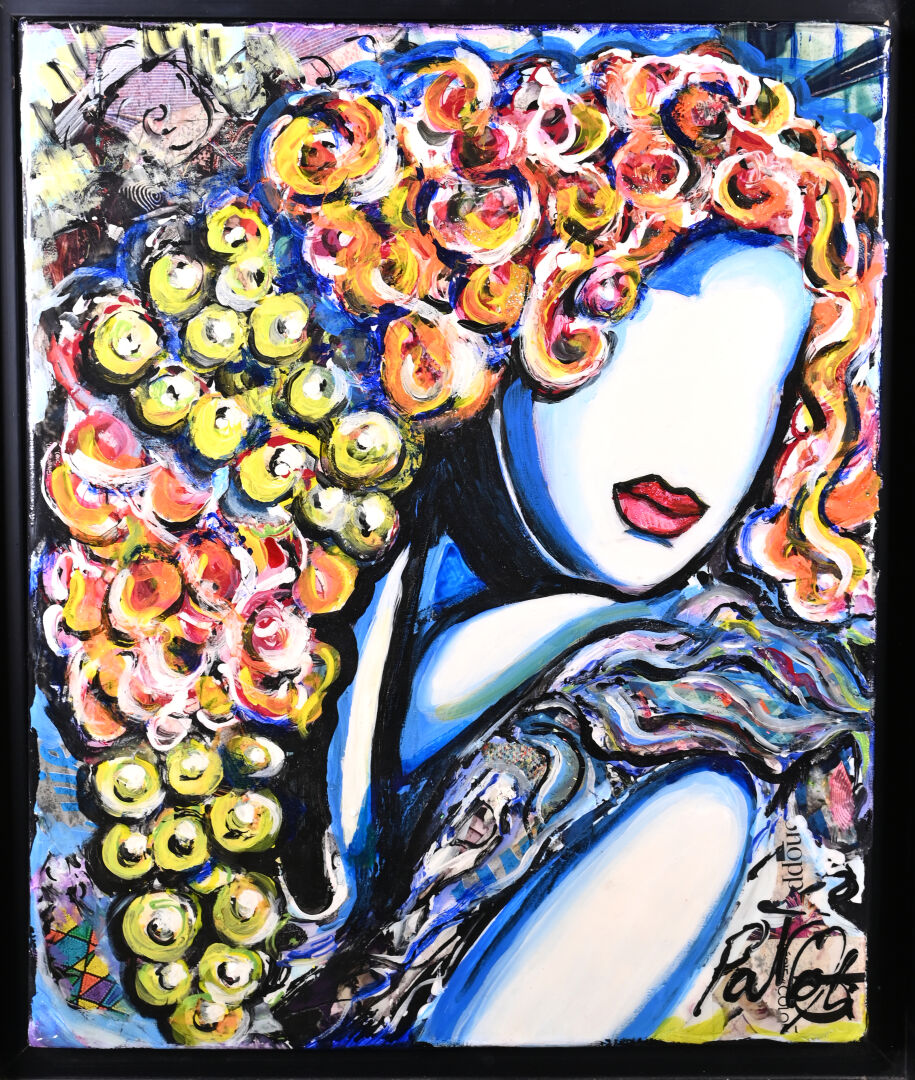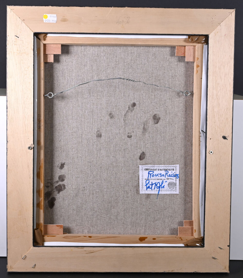 PATMOLI (Né en 1962). « Rousse Raisins ». Technique mixte signée en bas à droite. Au dos, étiquette avec titre et contre signature. 46 x 37,5 cm.