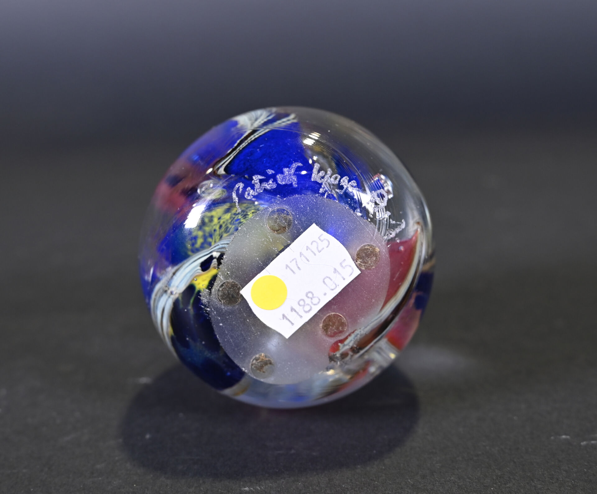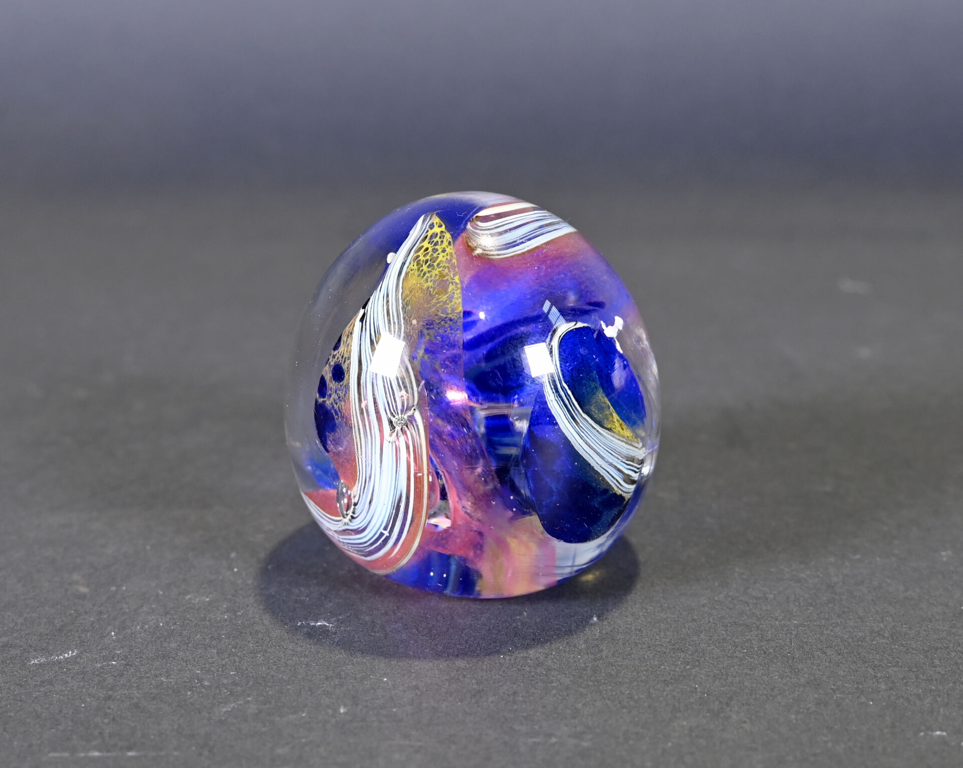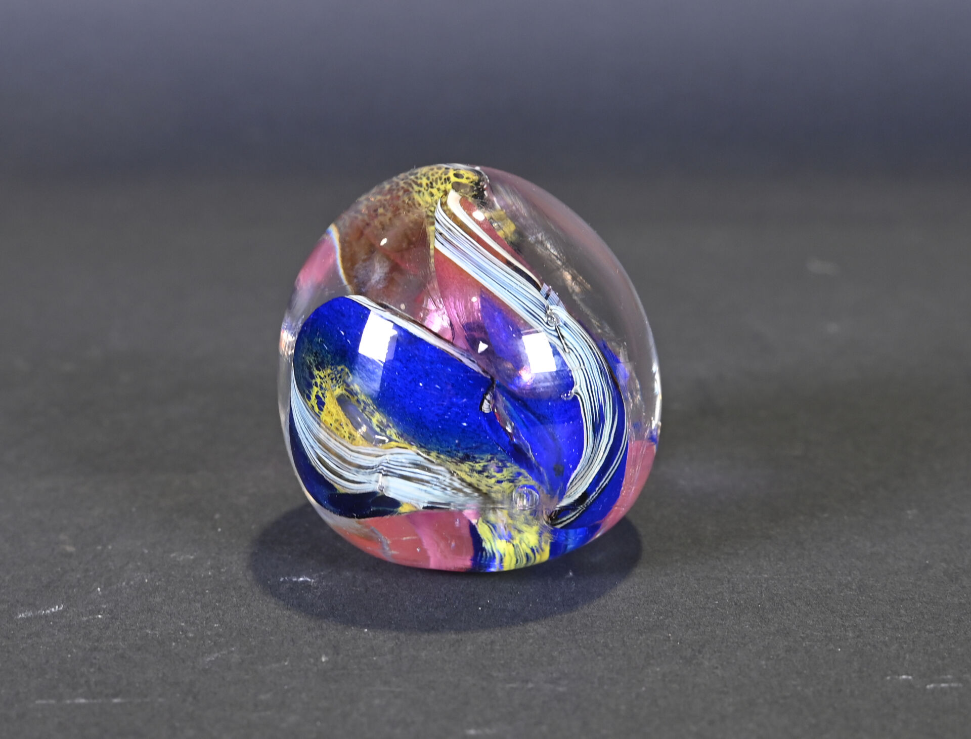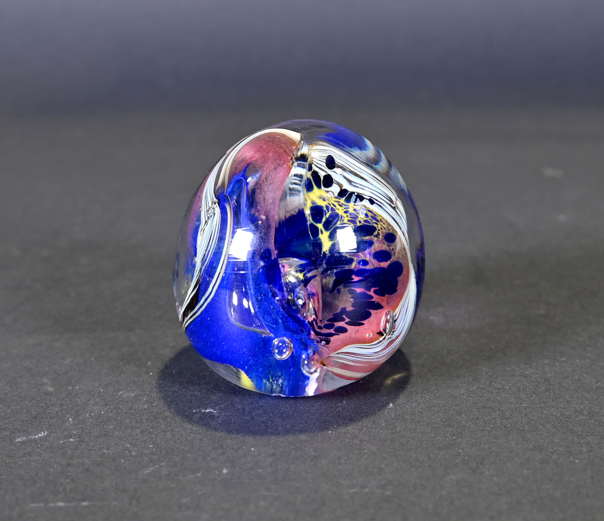 Patrick LEPAGE (1949-2015). Boule presse-papier en verre polychrome bullé. Signée au dessous. Haut. : 8 cm.