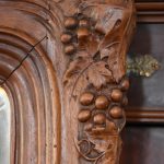 – un buffet deux corps de forme demi lune à entablement, ouvrant en partie haute par trois vantaux dont le central foncé d’un vitrail polychrome à décor de feuilles et pampres de vigne, deux tiroirs en ceinture et quatre vantaux en partie basse. Il repose sur une base mouvementée et est coiffé d’une corniche cintrée. Entrées de serrure et poignées de tirage en bronze ciselé de feuilles et pampres de vigne et doré (usures, mouillures, trace de brûlures sur le miroir).). Époque Art Nouveau. Haut. : 276 cm – Larg. : 167 cm – Prof. : 60 cm.
