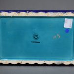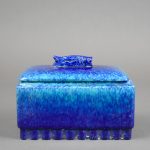 Paul MILLET (1870-1950), Sèvres. Boîte rectangulaire en céramique émaillée turquoise, la prise en forme de poisson, la base cannelée (petits éclats). Travail Art déco. 14 cm – Larg. : 19,5 cm – Prof. : 12,5 cm.