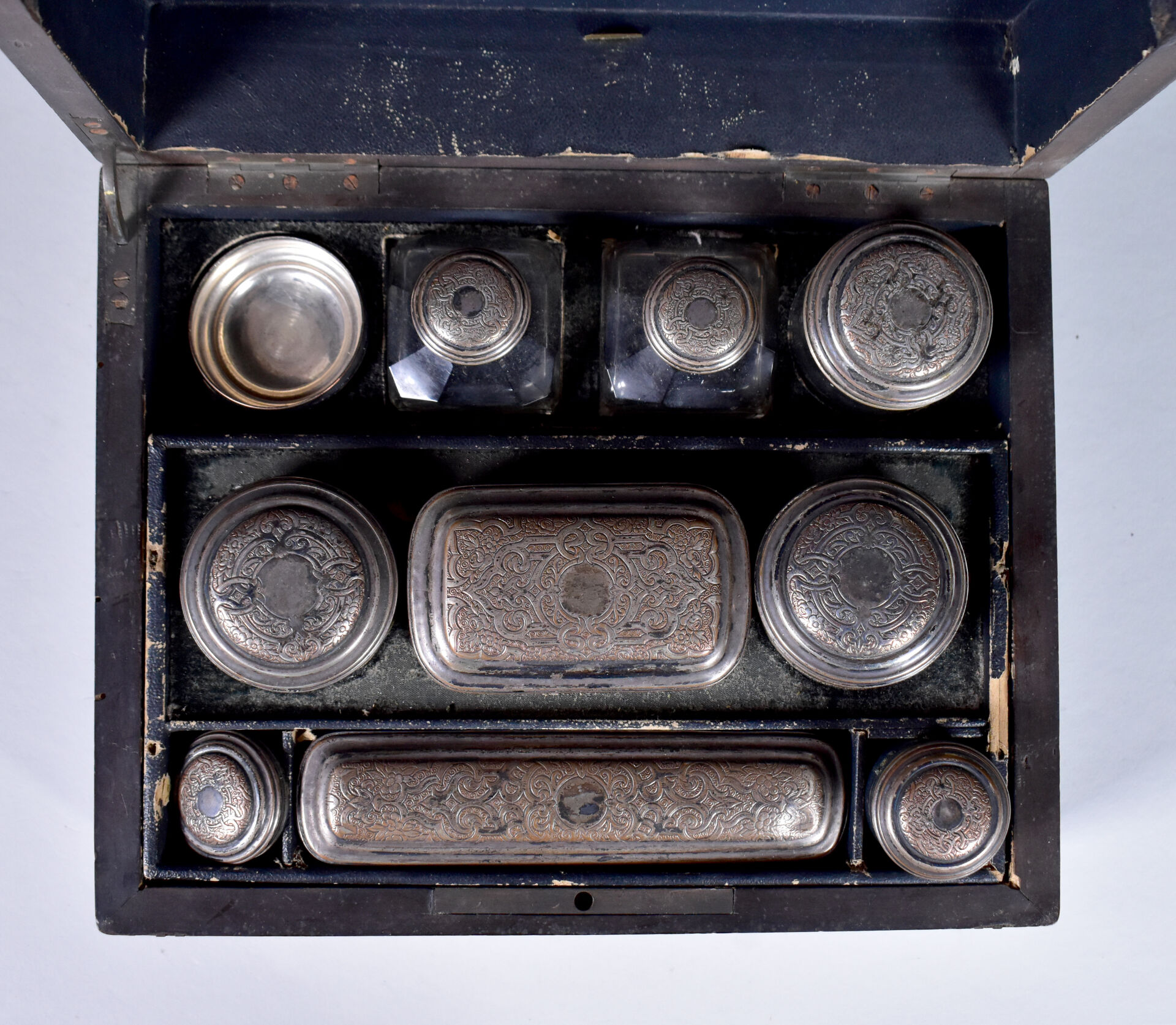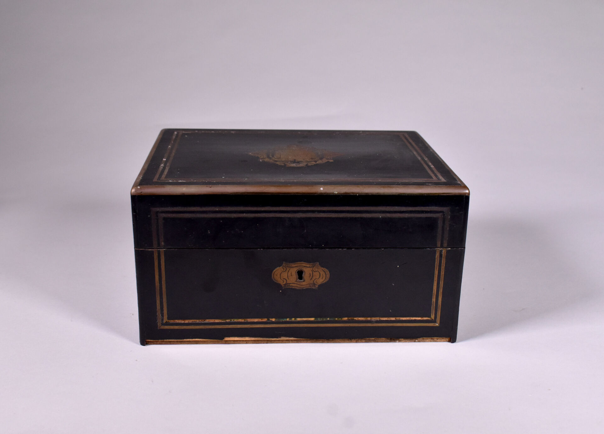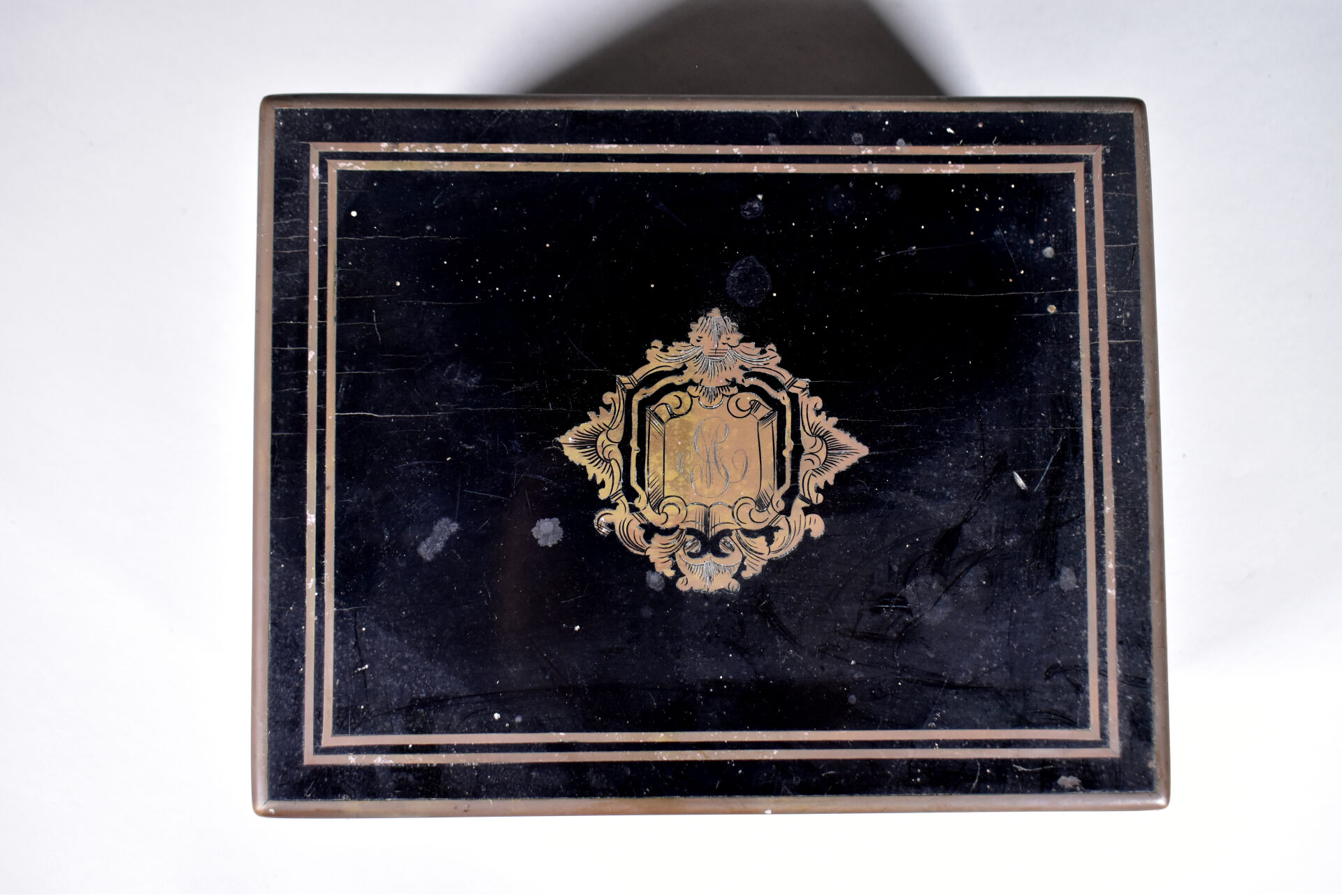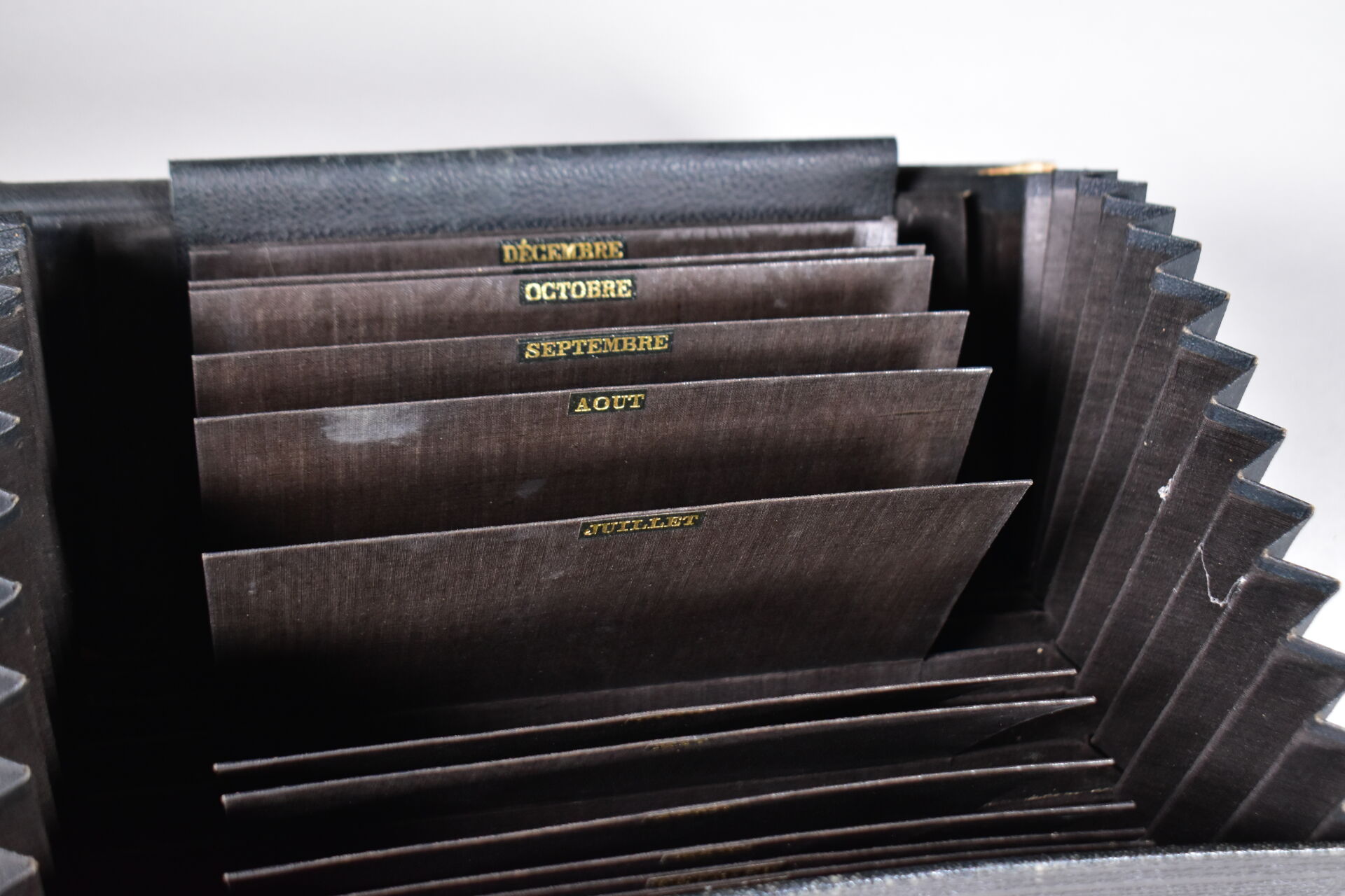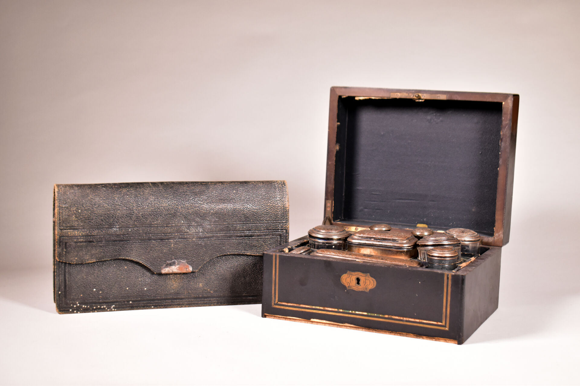 PAUL SORMANI – 114 Rue du Temple – PARIS. Necessaire de voyage en bois noirci et laiton, garni d’accessoires en métal argenté et cristal (manques, oxydations). Marqué à l’intérieur. On joint une pochette ou sacoche à correspondance (?) organisée en mois de l’année (usures, manques, clé absente).