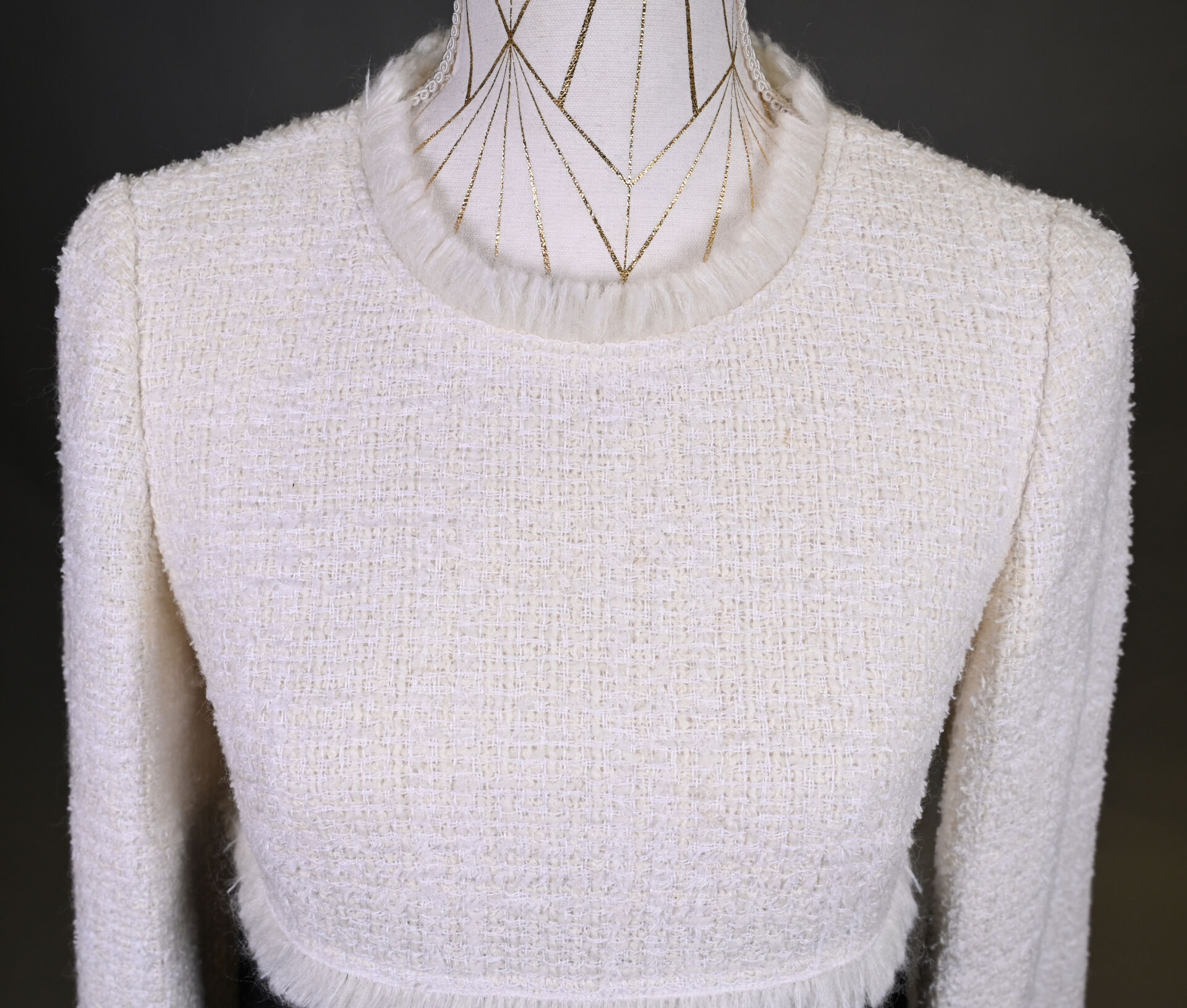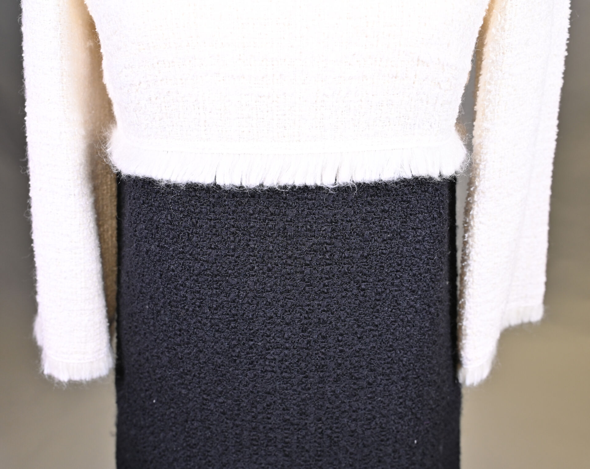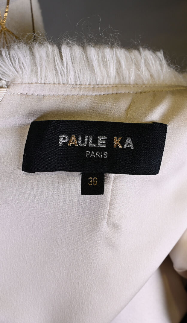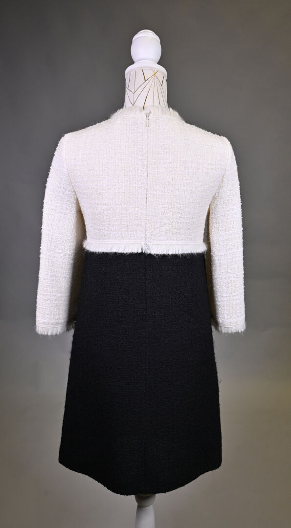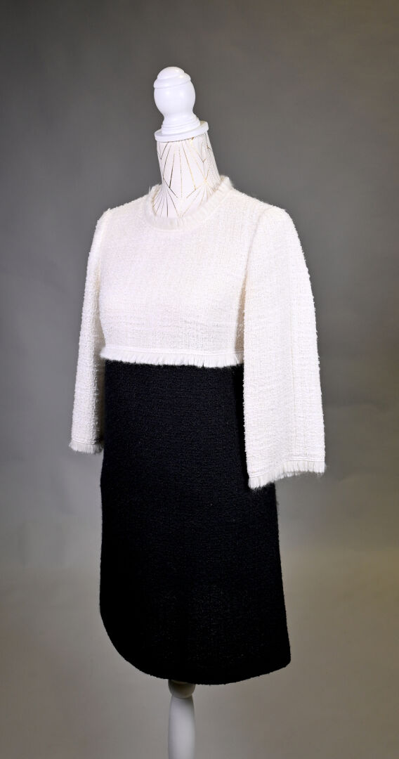 PAULE KA. Robe légèrement trapèze noir et crème, mélange laine, coton et synthétiques (un petit accro). Taille 36. Long. : 91 cm.