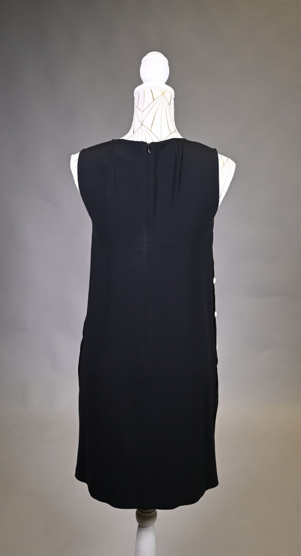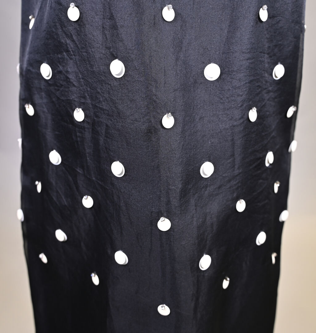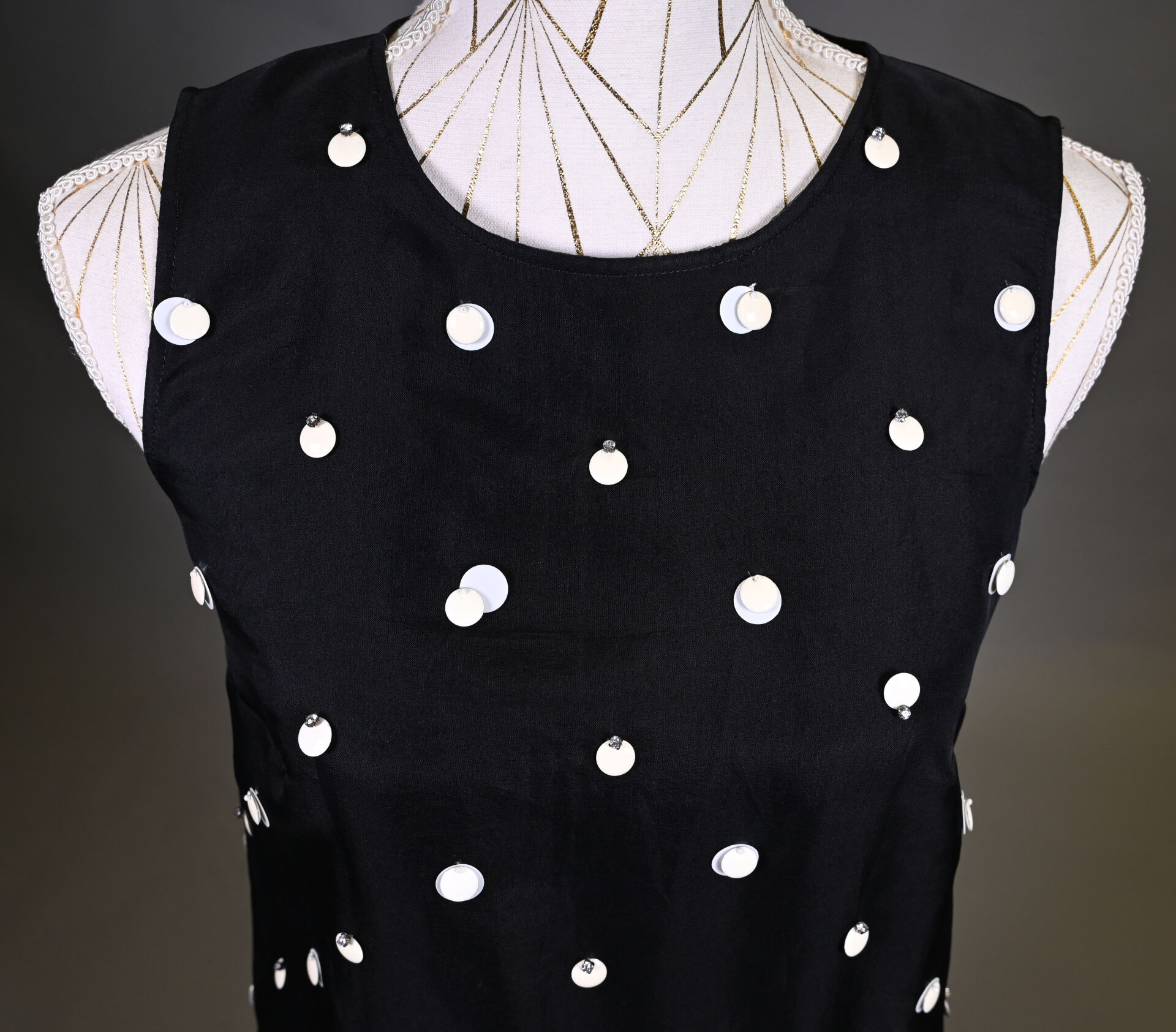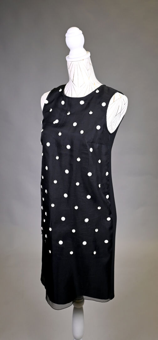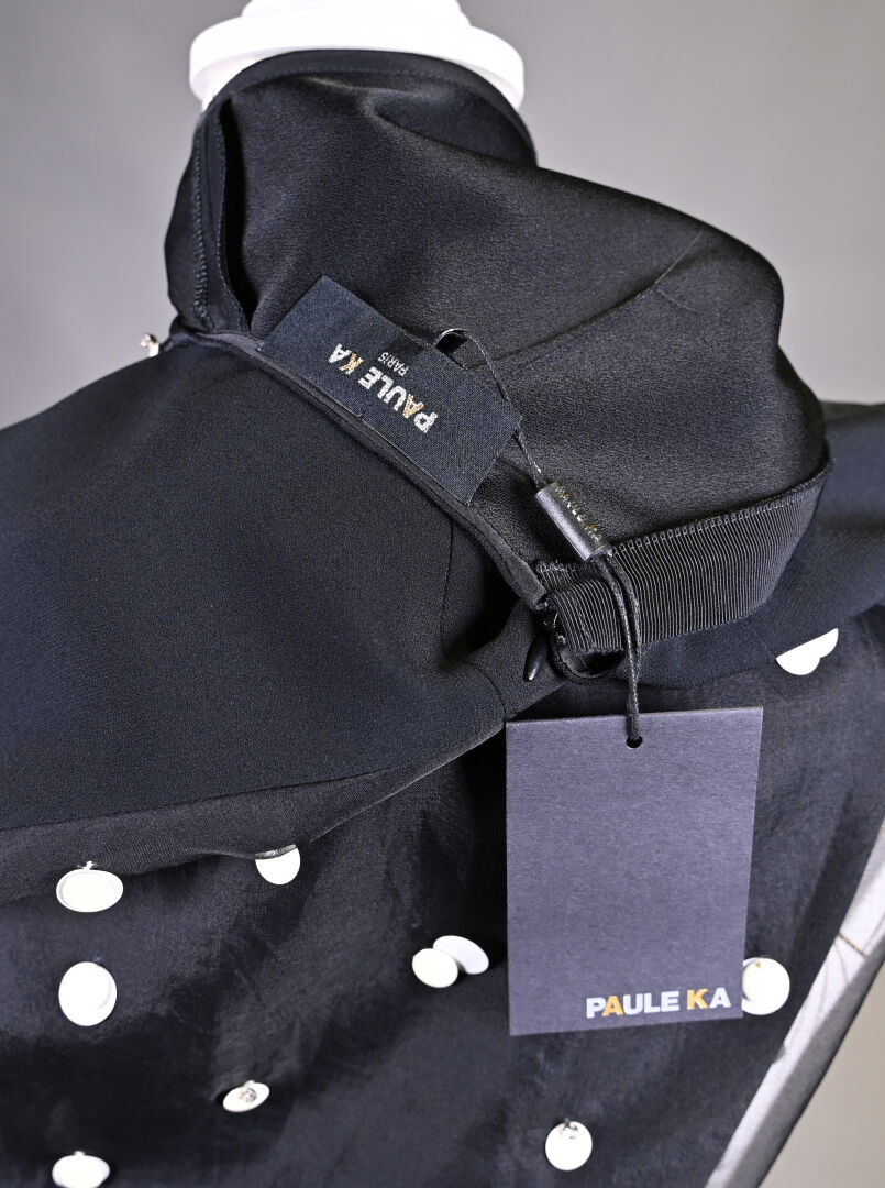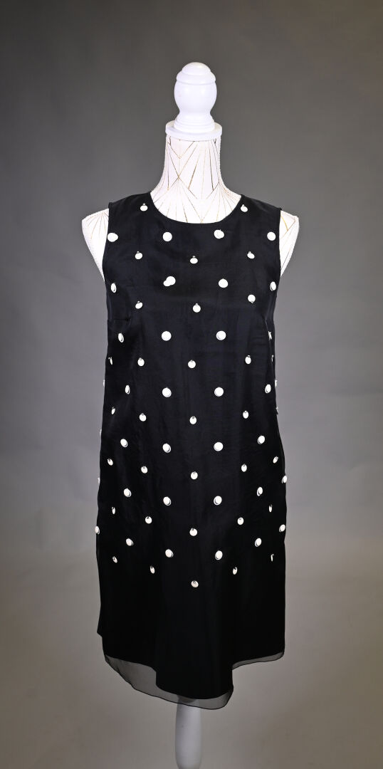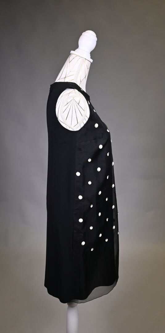 PAULE KA. Robe sans manches noire, synthétique à décor de pastilles crème, nacrées, strass et perles. Jamais portée avec étiquette. Taille 36. Long. : 92 cm.