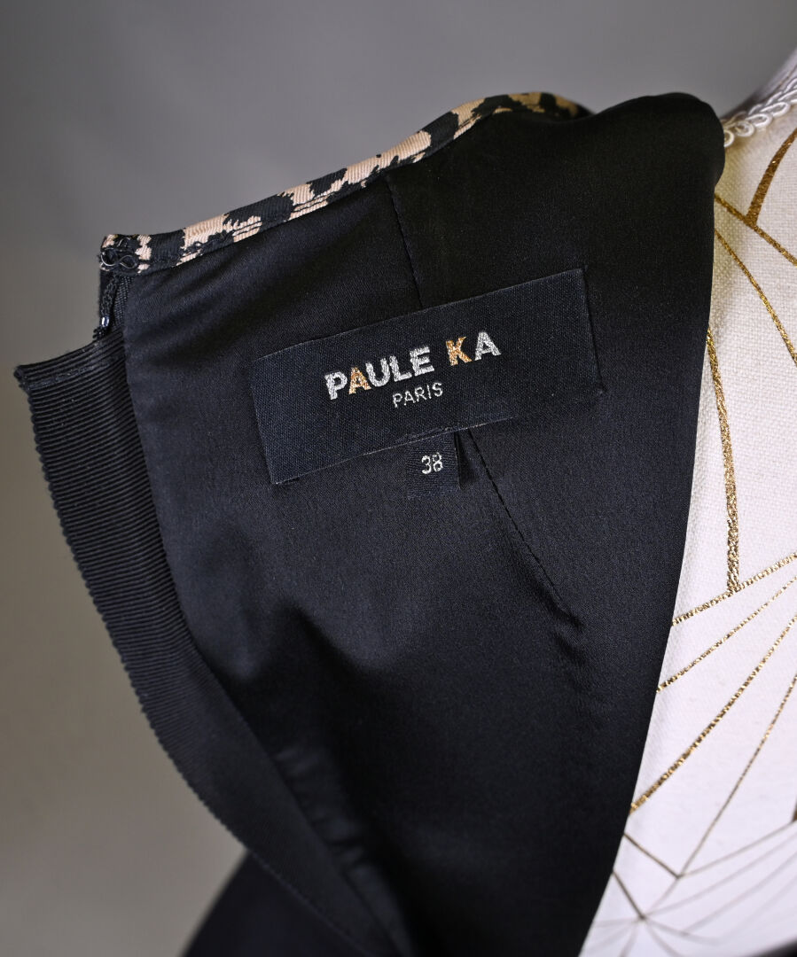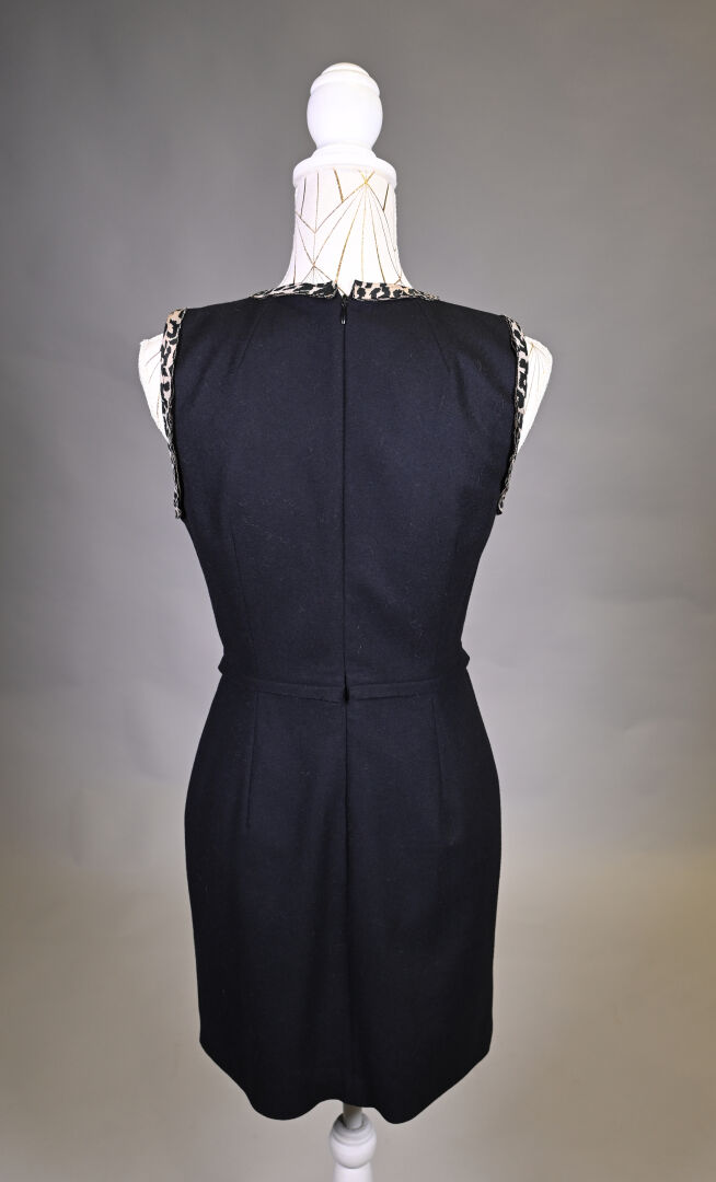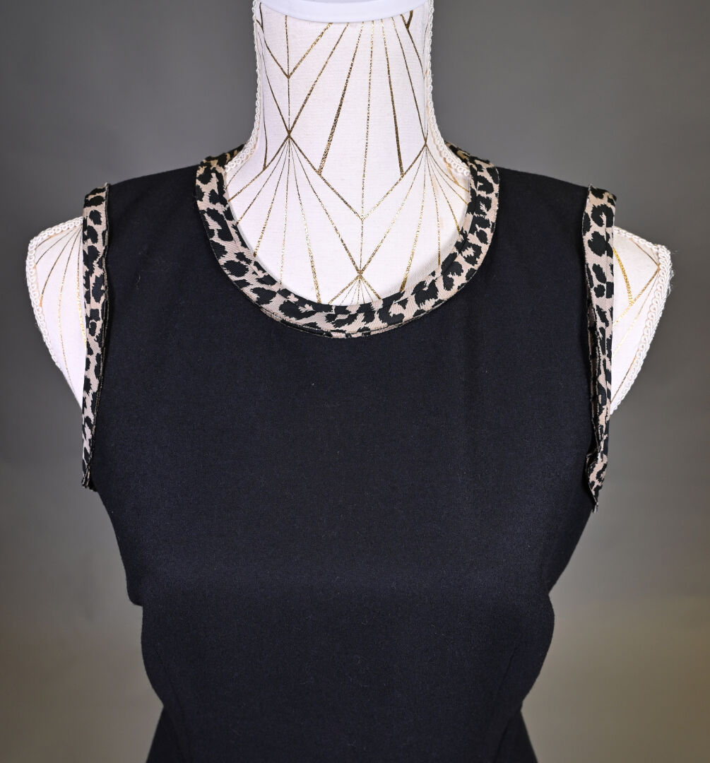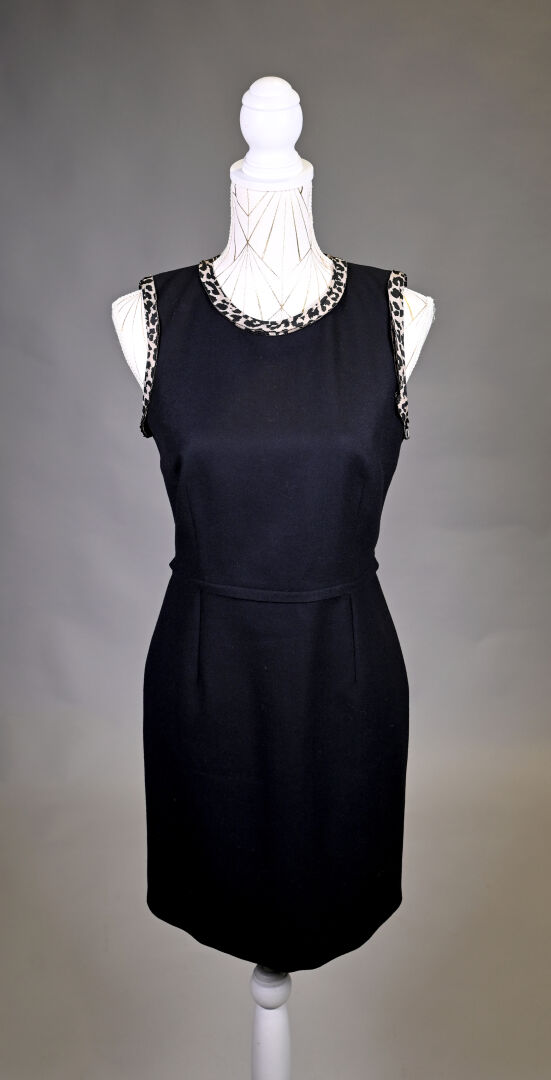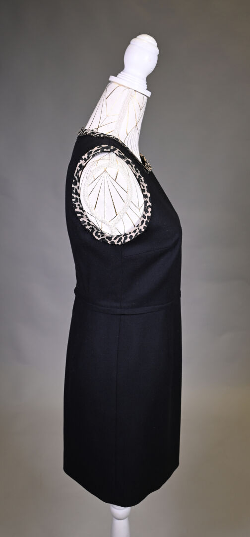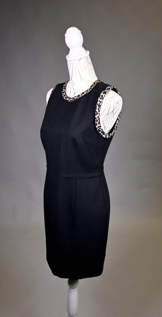 PAULE KA. Robe trapèze sans manches noire en laine vierge, le col et l’emmanchure imprimé panthère. Taille 36. Long. : 87,5 cm.