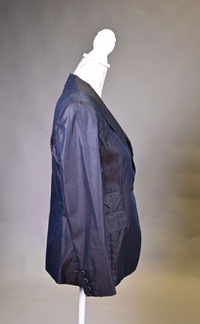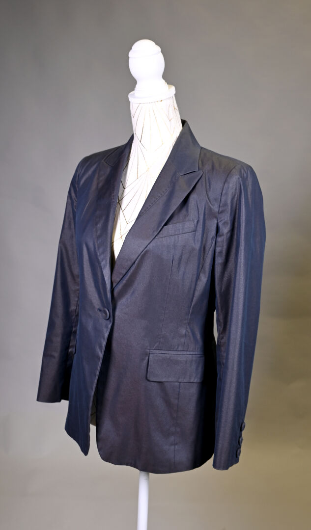 PAULE KA. Tailleur pantalon en tissu bleu marine irisé or. Taille 40 (très petit). Long. de la veste. : 72 cm.