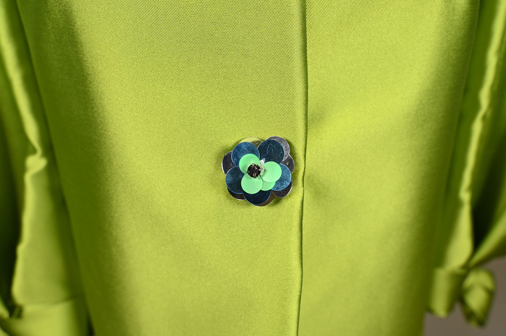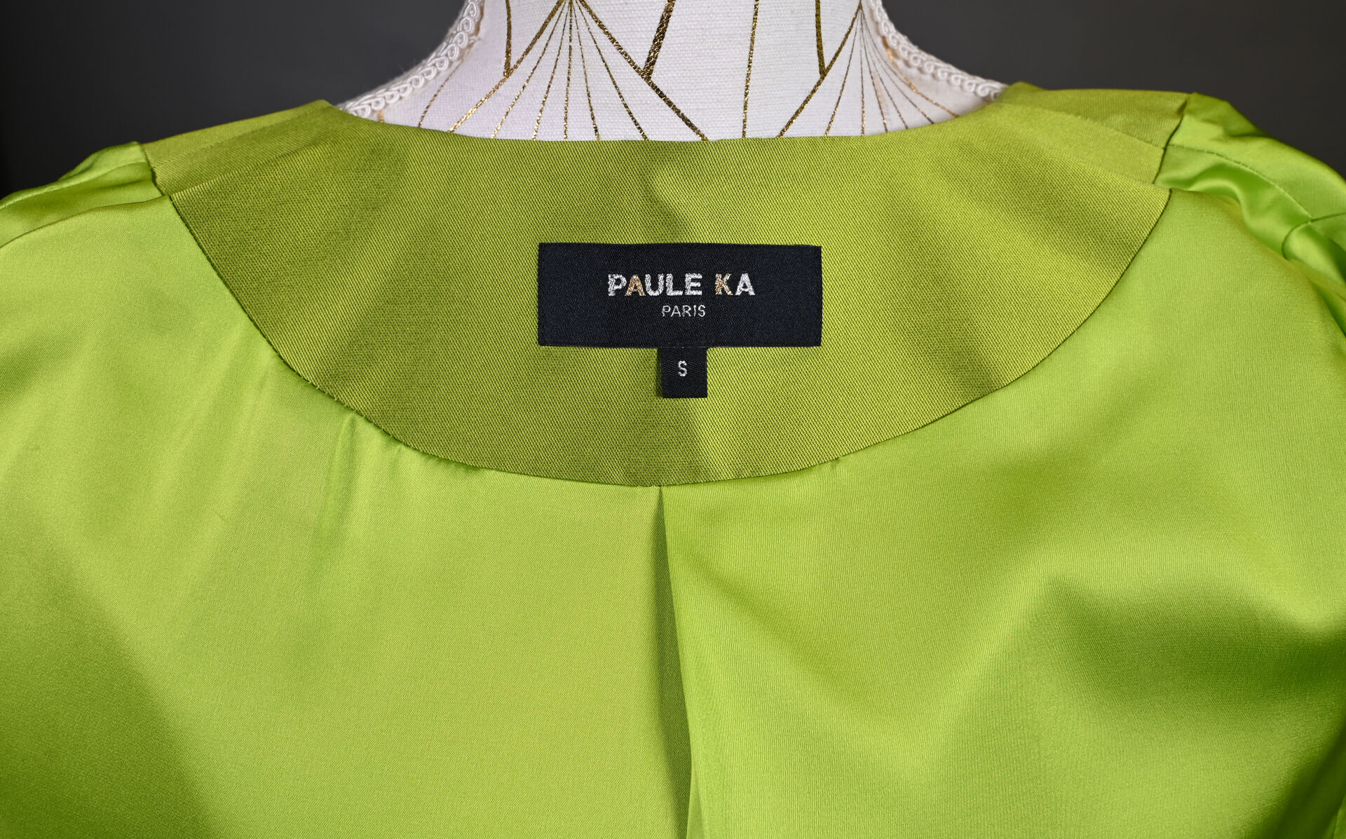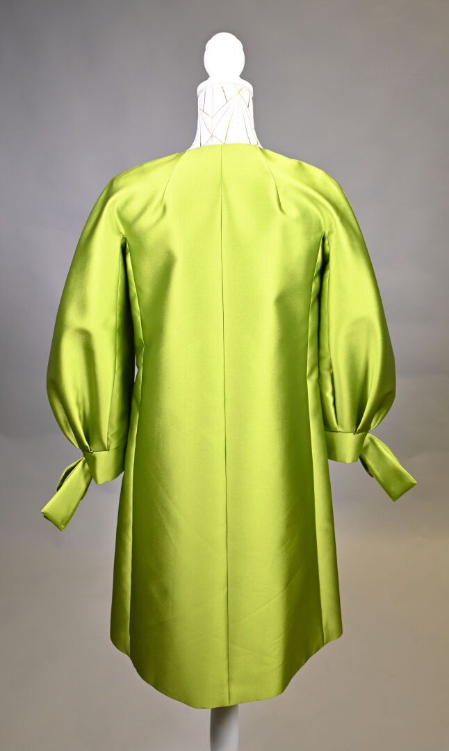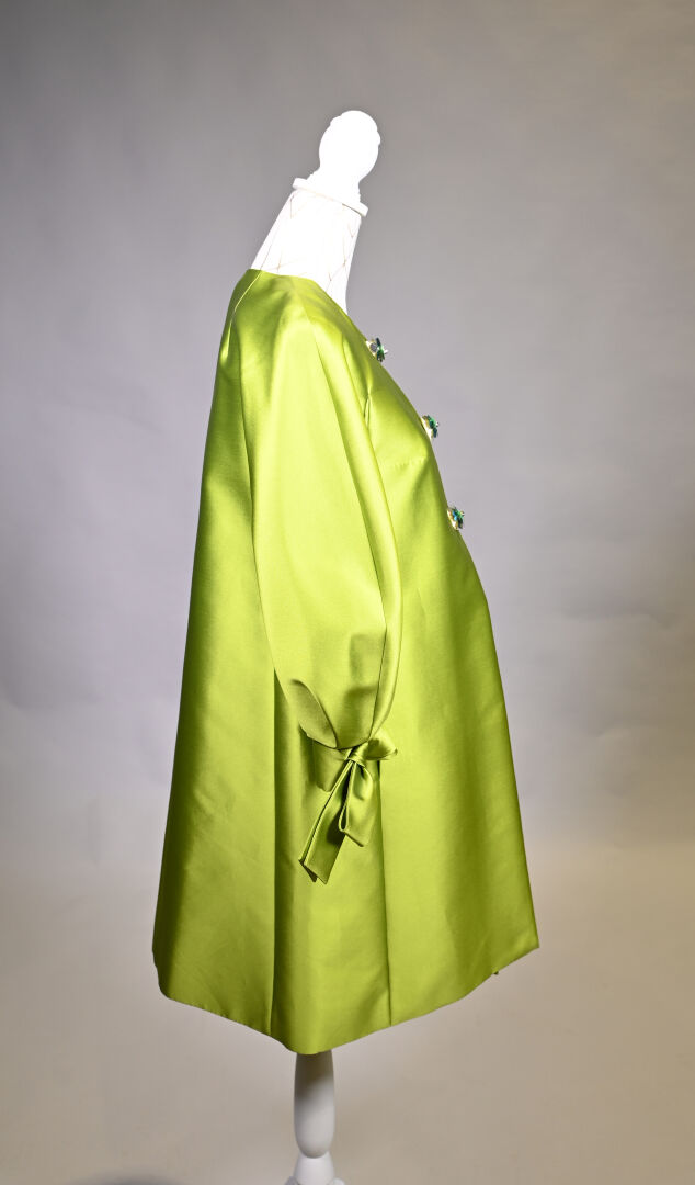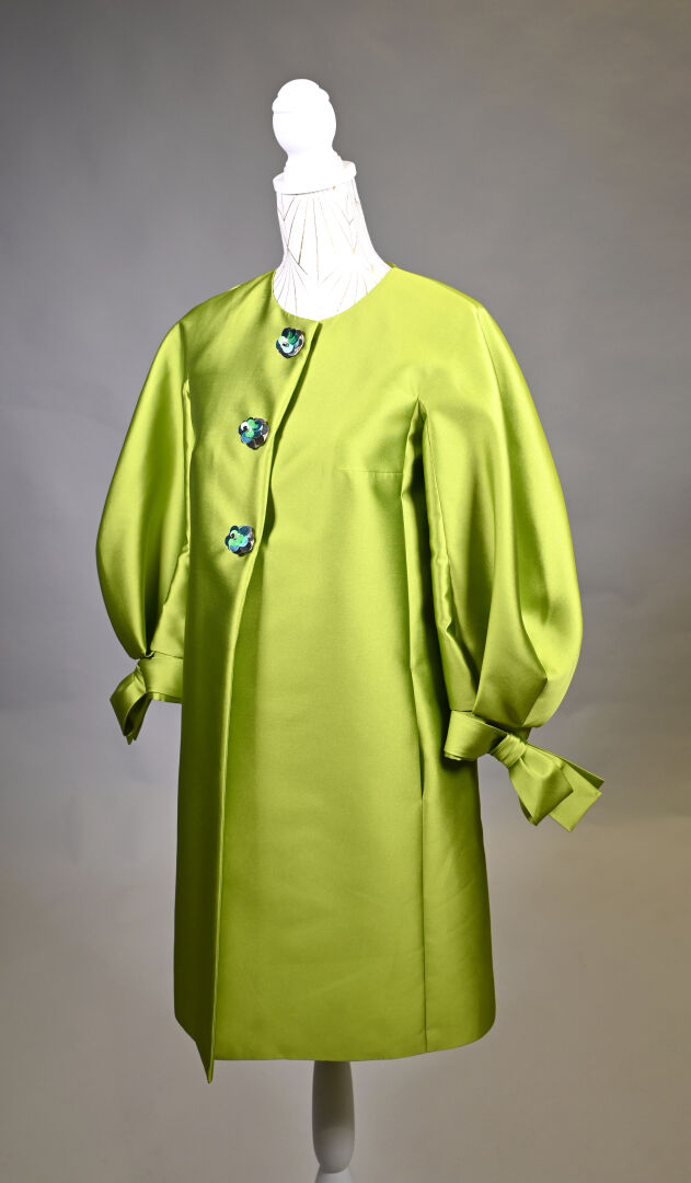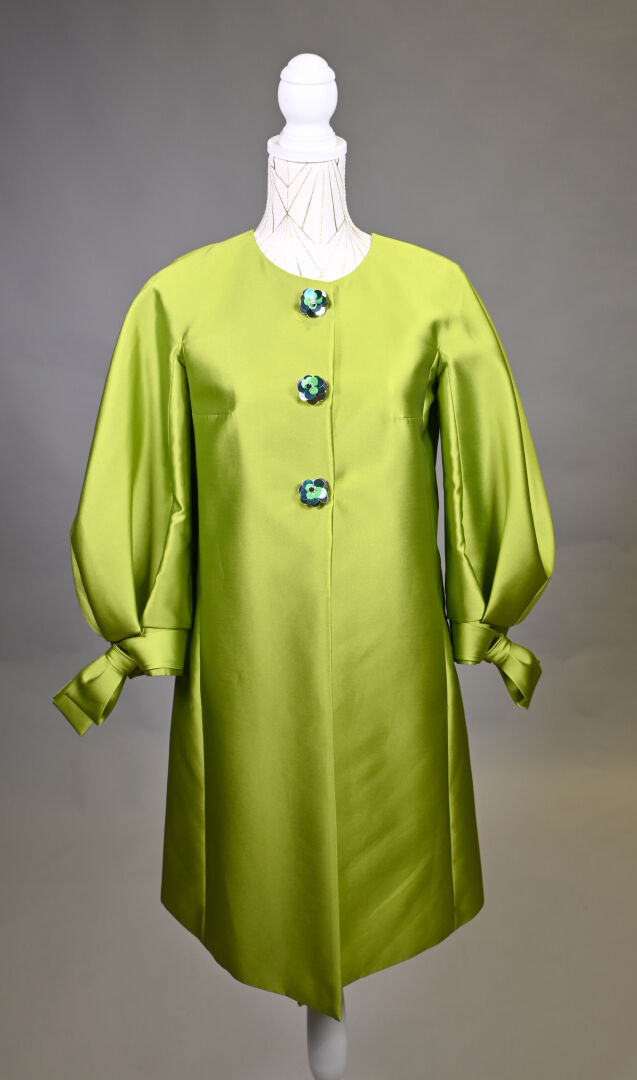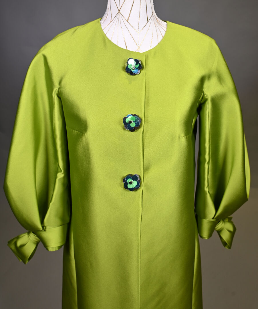 PAULE KA. Veste vert pomme, légèrement trapèze en mélange soie et polyester, manches ballon à noeuds, les boutons fleurs à pastilles vert, or et bleu. Taille S. Long. : 92 cm.