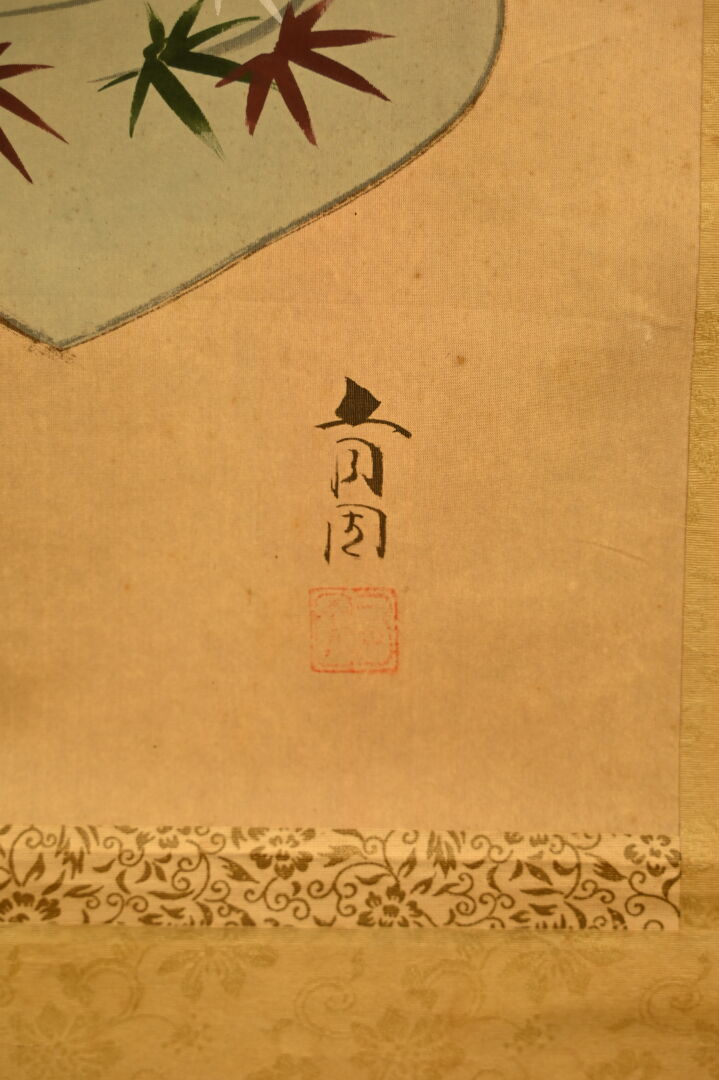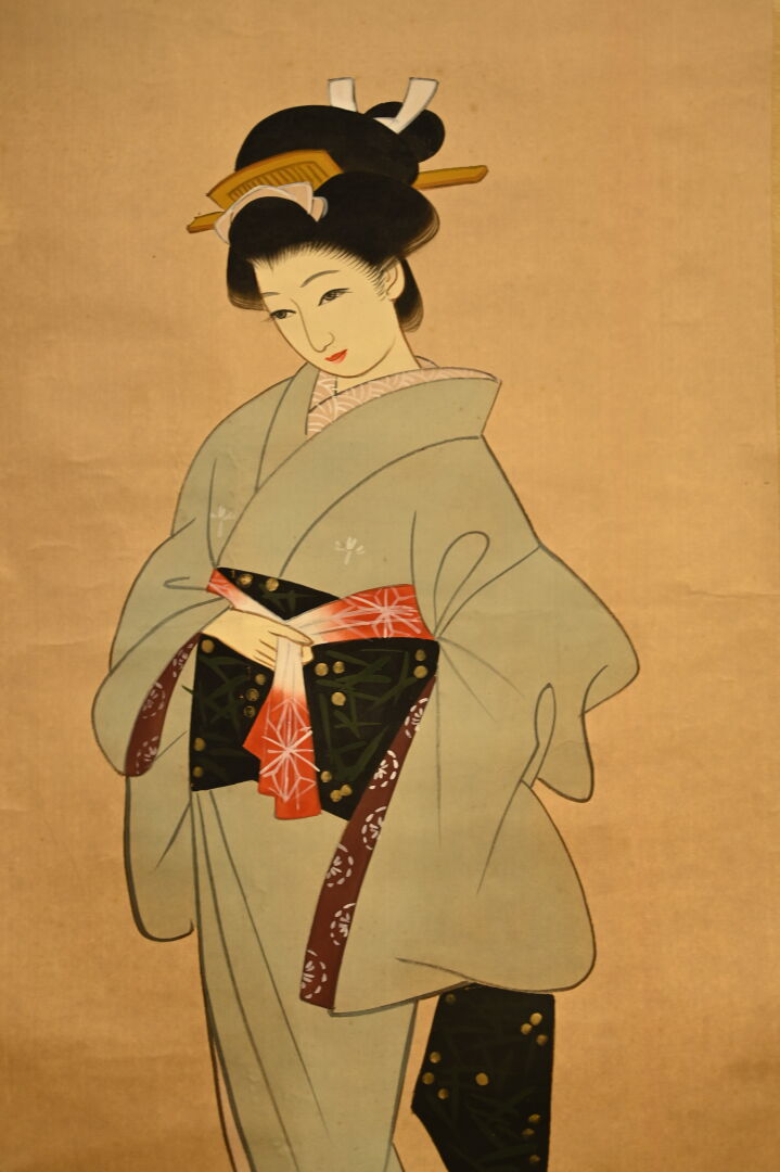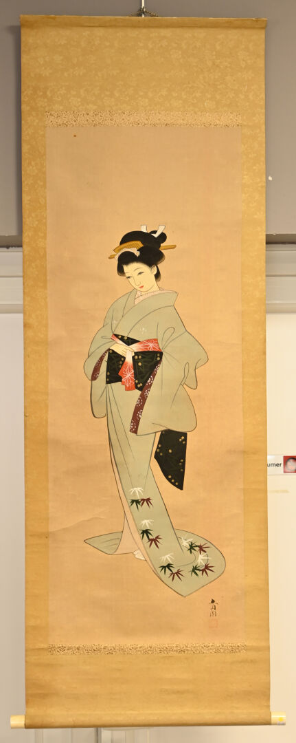 Peinture sur soie représentant une femme vêtue d’un Kimono. Collée sur toile (rousseurs). Japon, XXe siècle. Long. totale avec le rouleau : 144 cm – Larg. : 51 cm.