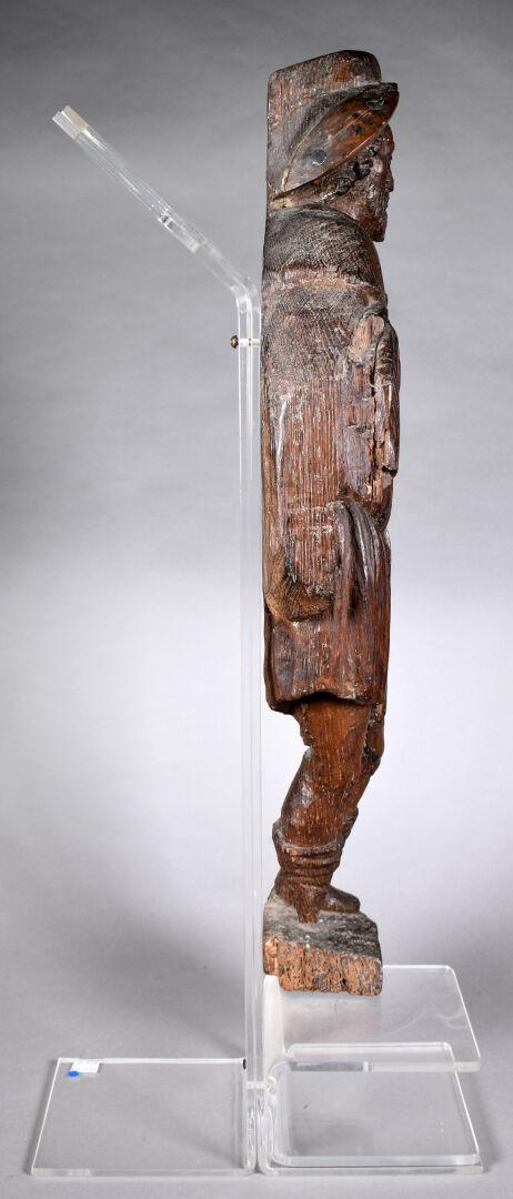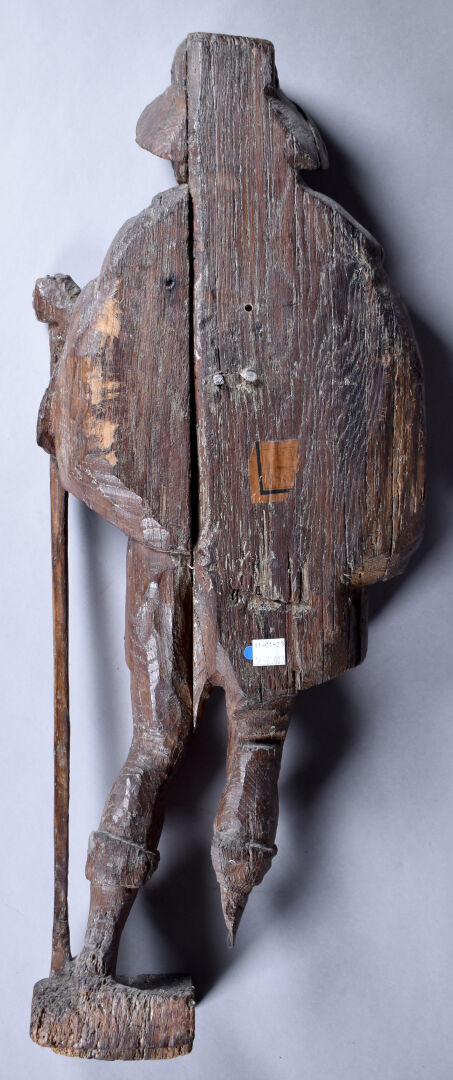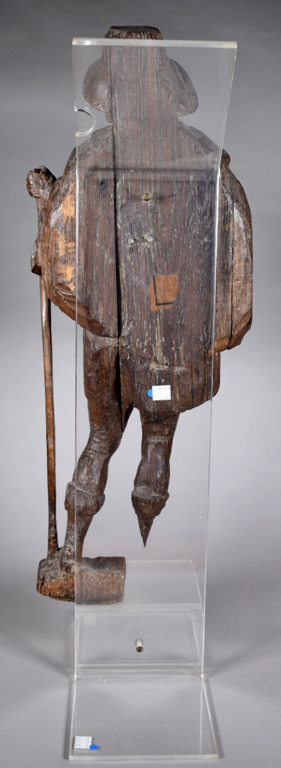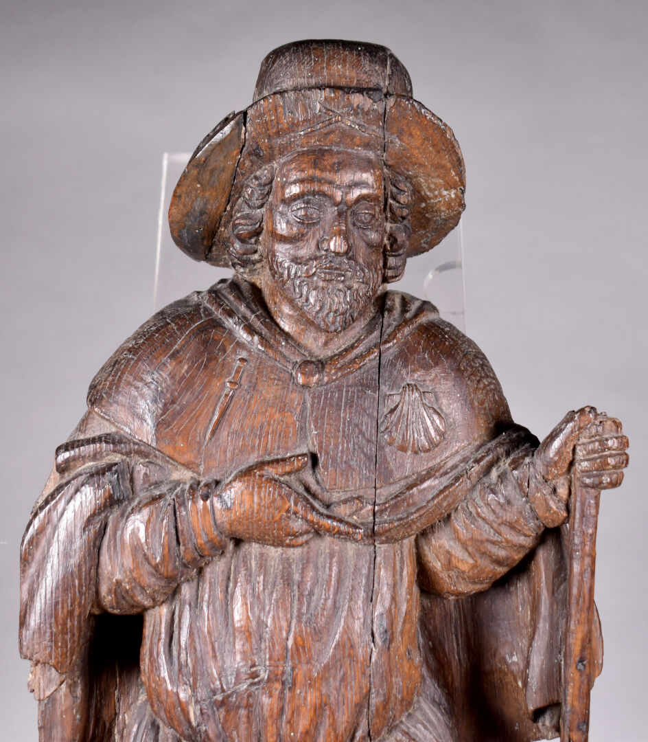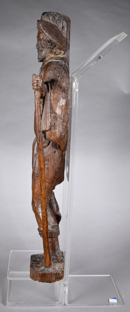 Pèlerin de St Jacques en chêne sculpté (manquent le pied droit, éclats et restaurations). Travail probablement de la fin du XVIIe siècle ou du début du XVIIIe siècle. Haut. : 64,5 cm.