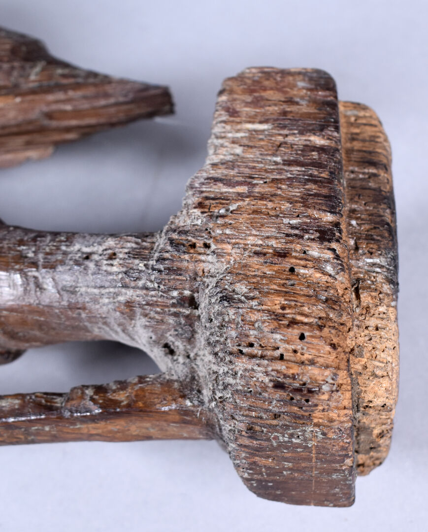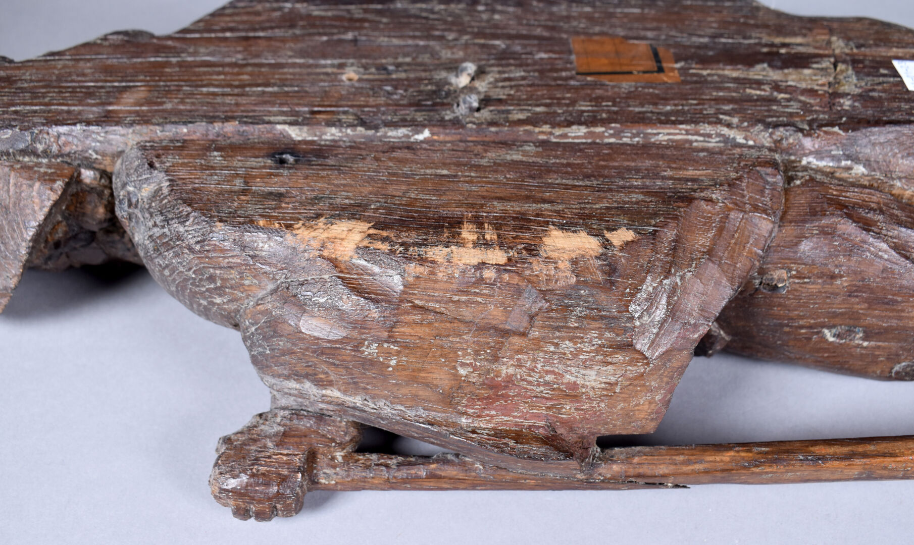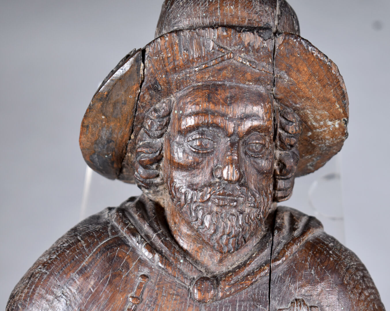 Pèlerin de St Jacques en chêne sculpté (manquent le pied droit, éclats et restaurations). Travail probablement de la fin du XVIIe siècle ou du début du XVIIIe siècle. Haut. : 64,5 cm.