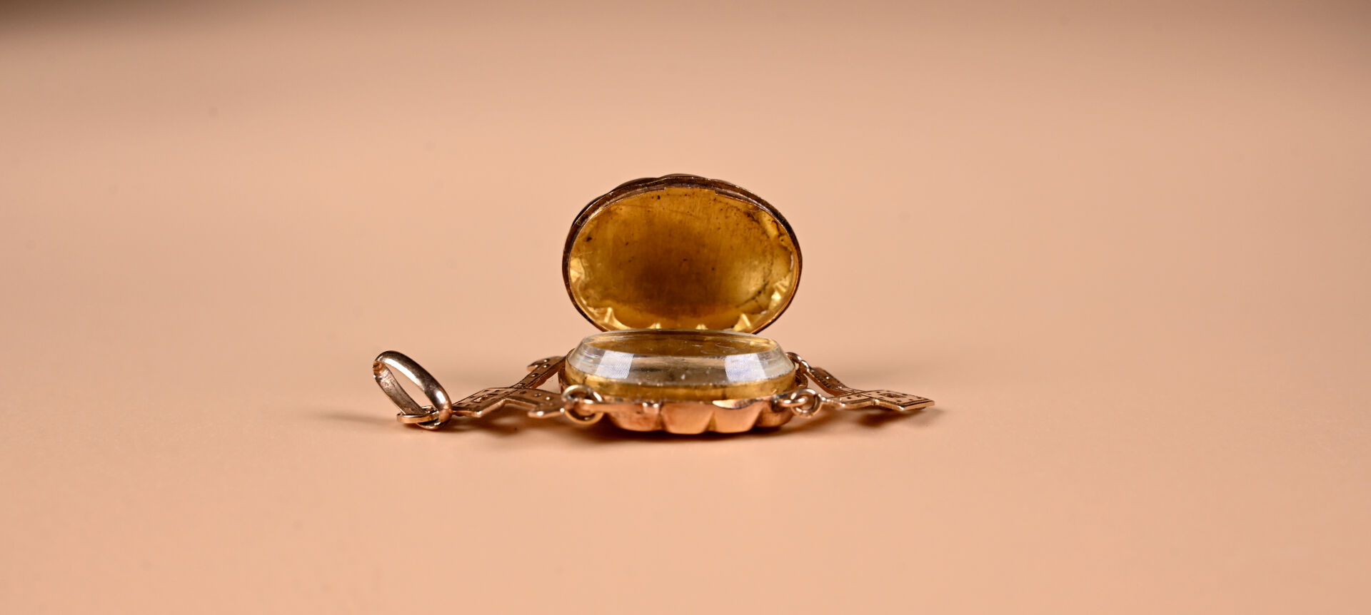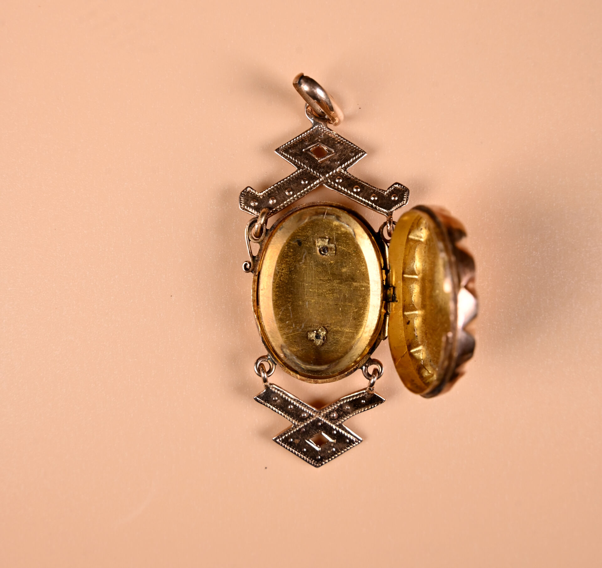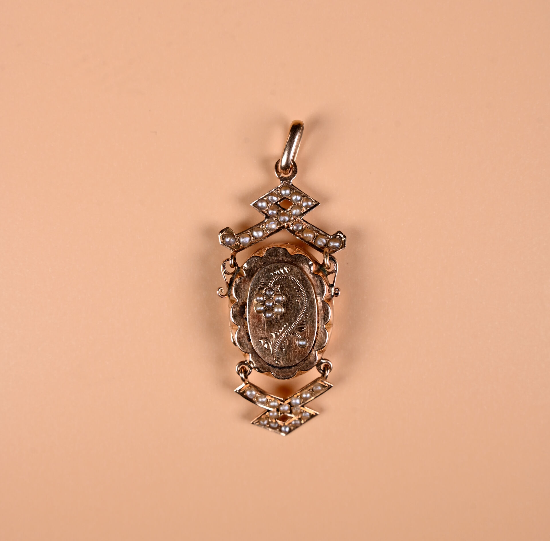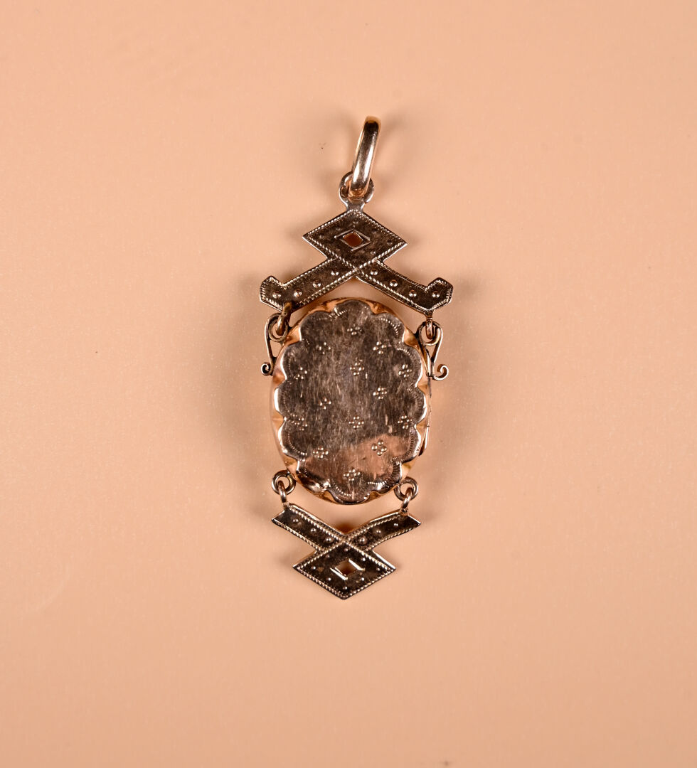 Pendentif ancien en or rose 18K 750/1000e et semences de perles. Centré d’un médaillon (avec verre). Haut. : 5,5 cm. Travail du début du XXe siècle. Poids brut. : 9,8 g.