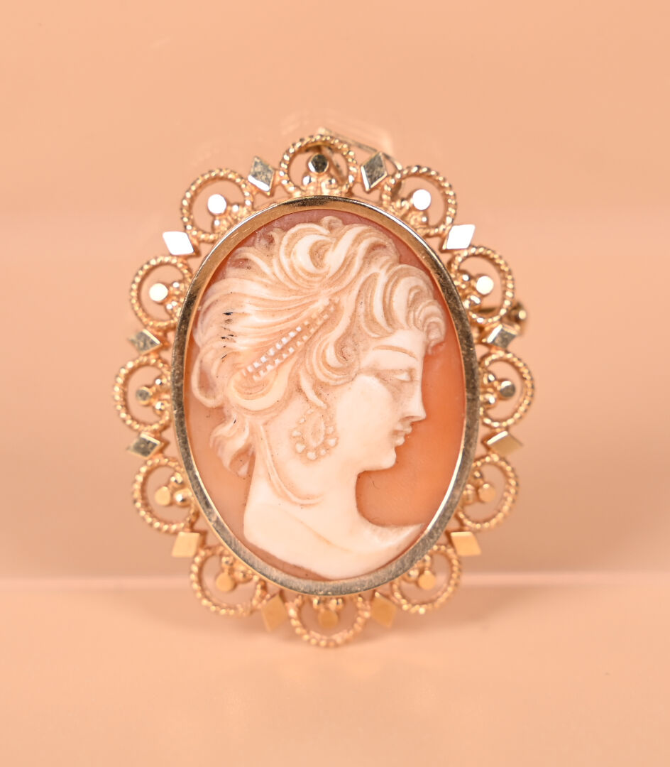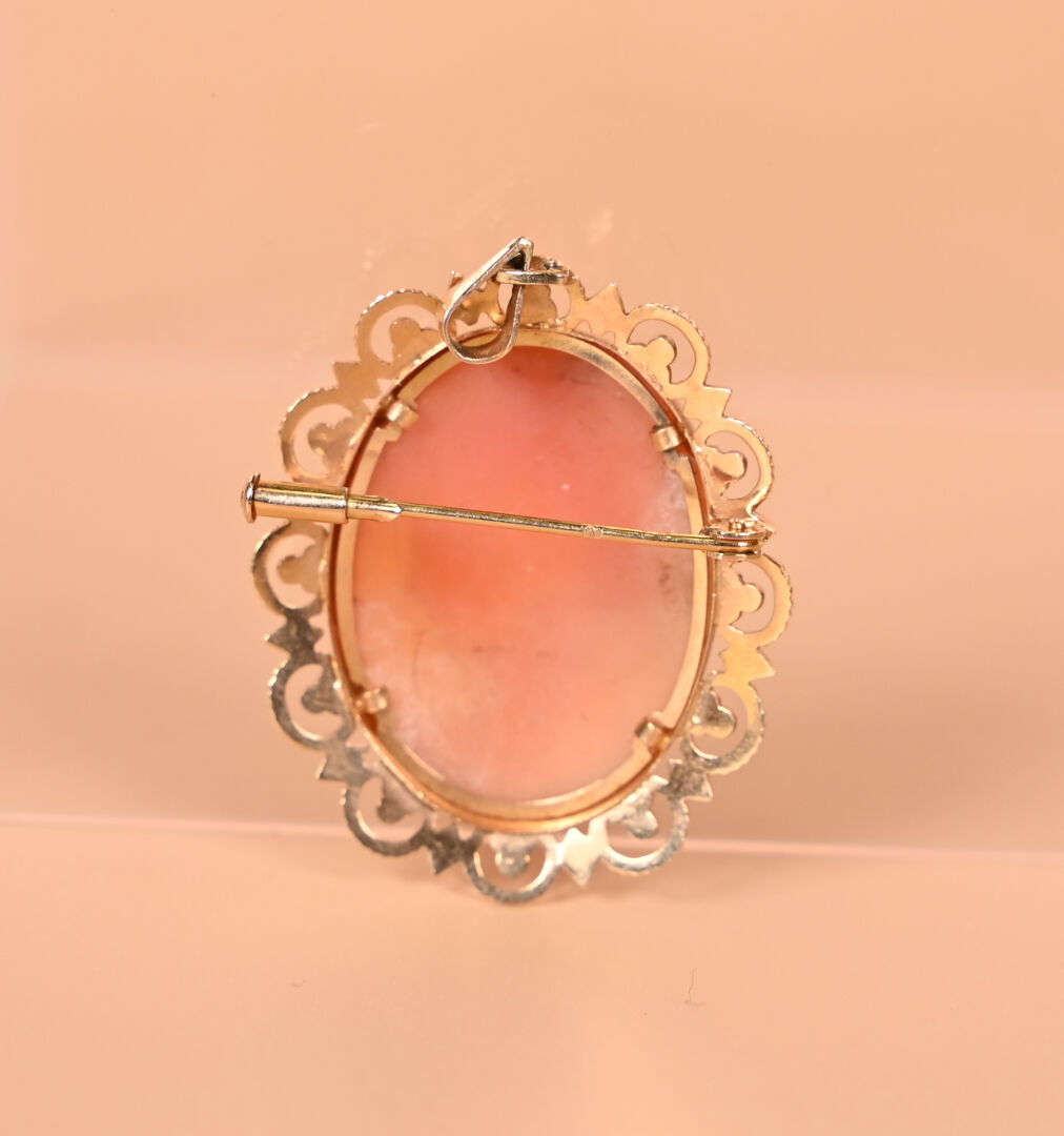 Pendentif/broche en or 18K 750/1000e et camée coquille. Poids brut : 9,5 g.