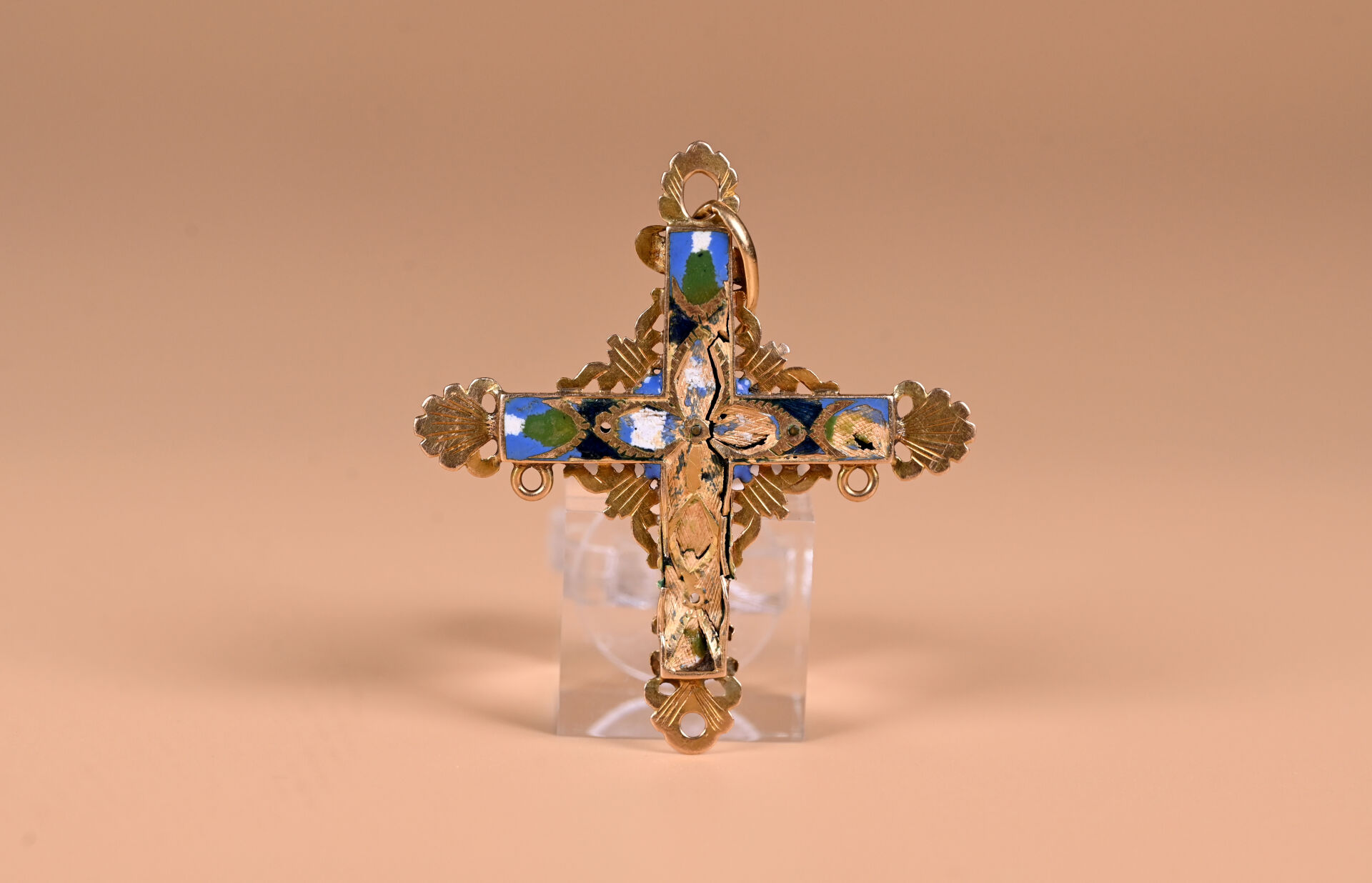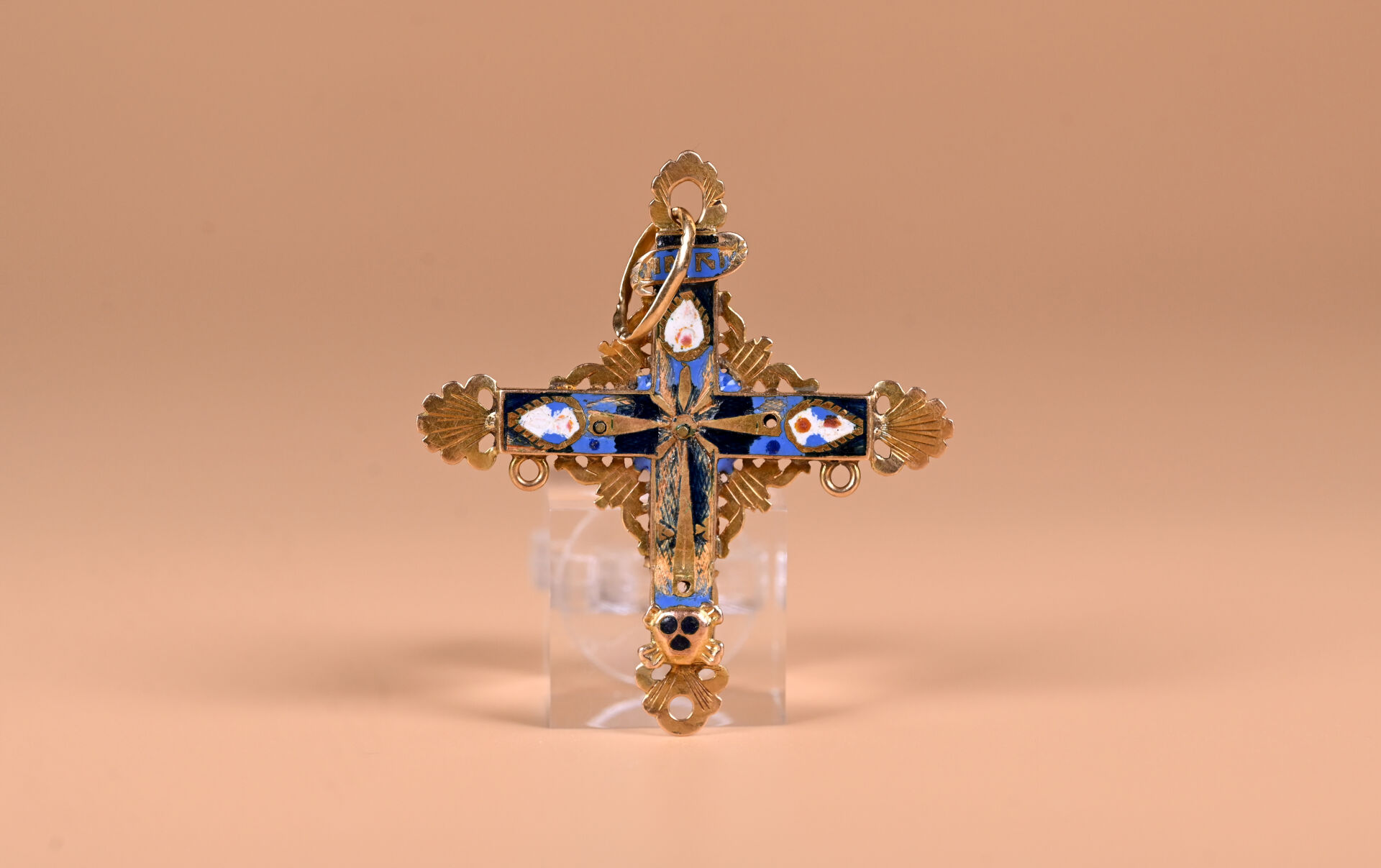 Pendentif croix régionaliste du Puy-en- Velay en or 750 millièmes 18k présentant un travail d’émail polychrome. Doubles anneaux avec breloques manquantes. Hauteur : 5 cm ( sans la bélière). Largeur : 4,5 cm. Travail de la première moitié du XIXème siècle. Poids brut : 4,6 g ( accidents et enfoncements, manques à l’émail).
