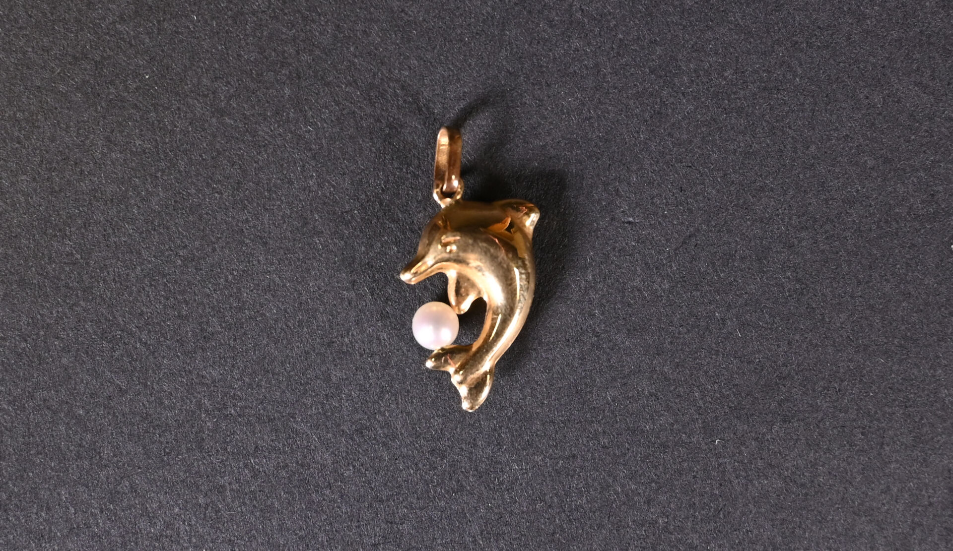 Pendentif » dauphin » en or 750/1000 et petite perle de culture. Poids brut : 1,1 g