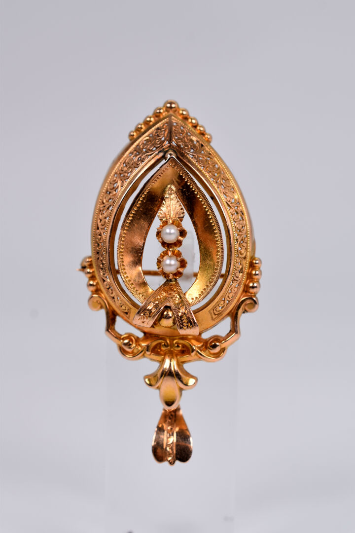 Pendentif en or jaune 18K 750/1000e à décor ajouré en ciselure et deux petites perles (chocs). Epoque Napoléon III. Haut. : 5,5 cm. Poids brut. : 5 g.