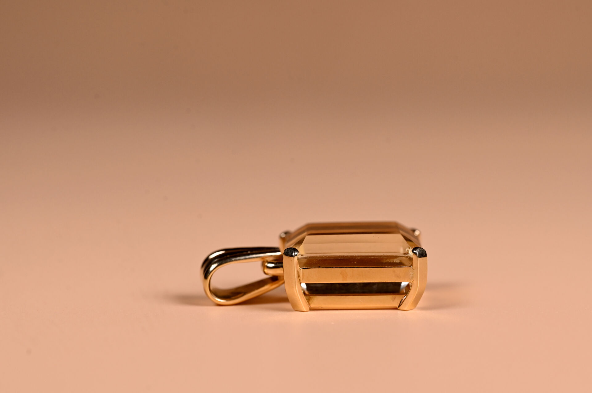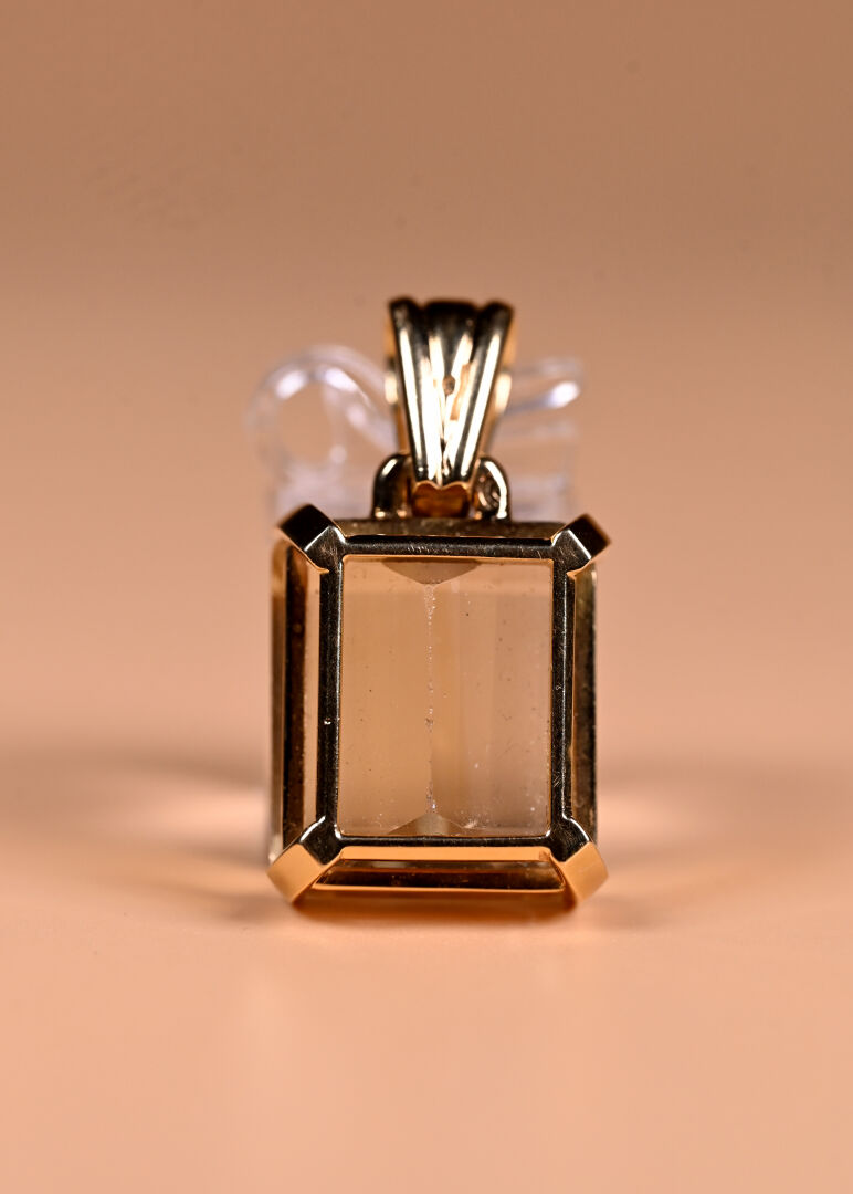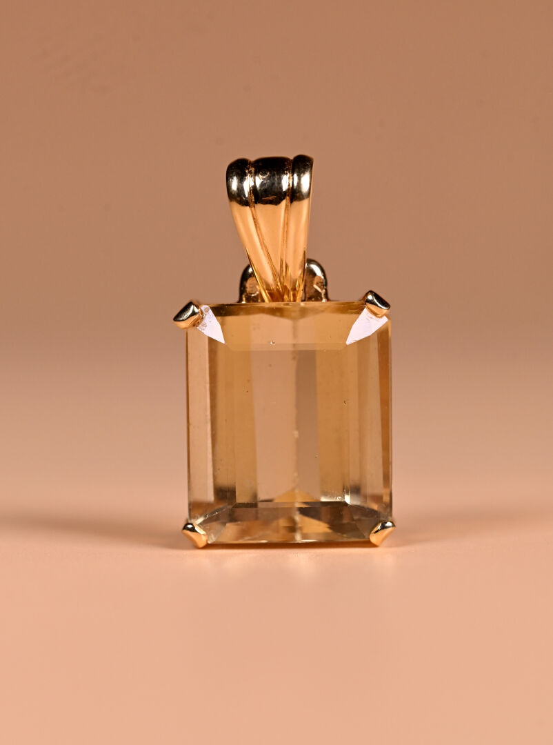 Pendentif en or jaune 18K 750/1000e avec une importante citrine taille baguette. Haut. : 4 cm. Poids brut. : 22,7 g.