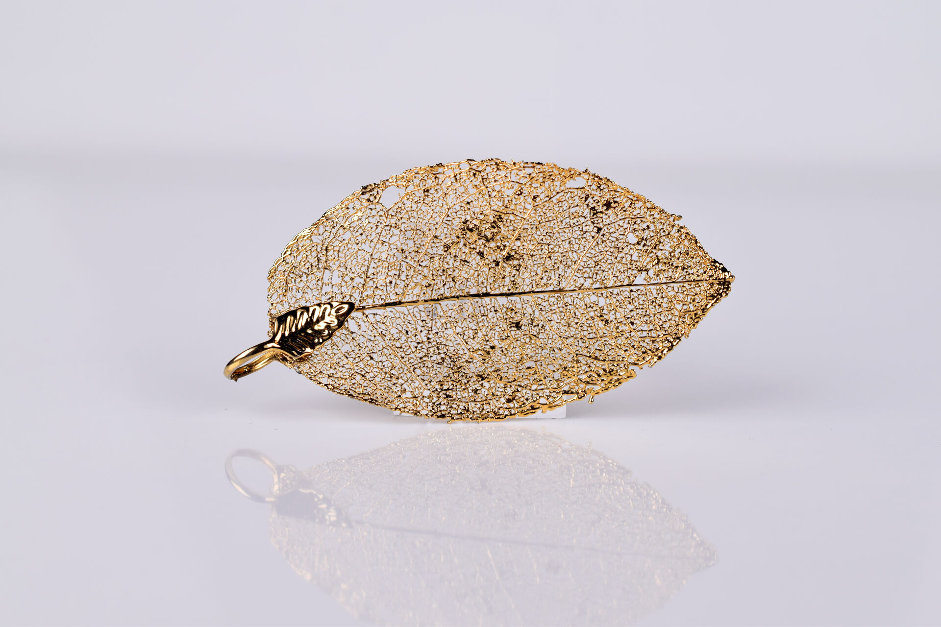 Pendentif feuille plaquée or jaune. Long. : 6 cm.