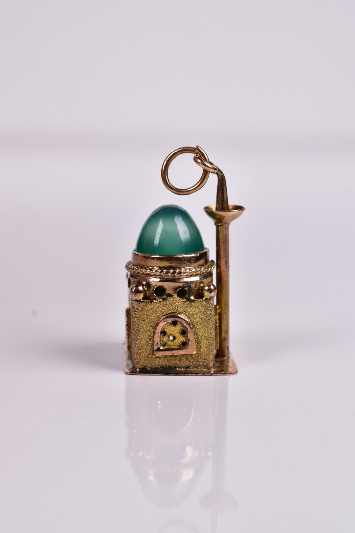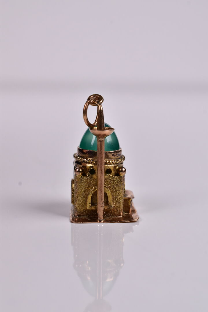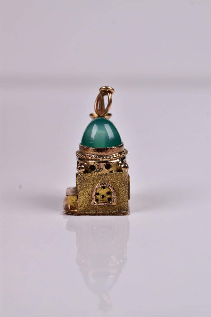 Pendentif « mosquée » en or 585/1000e, et chrysoprase en cabochon. Haut. : 2 cm. Poids brut : 4 g.
