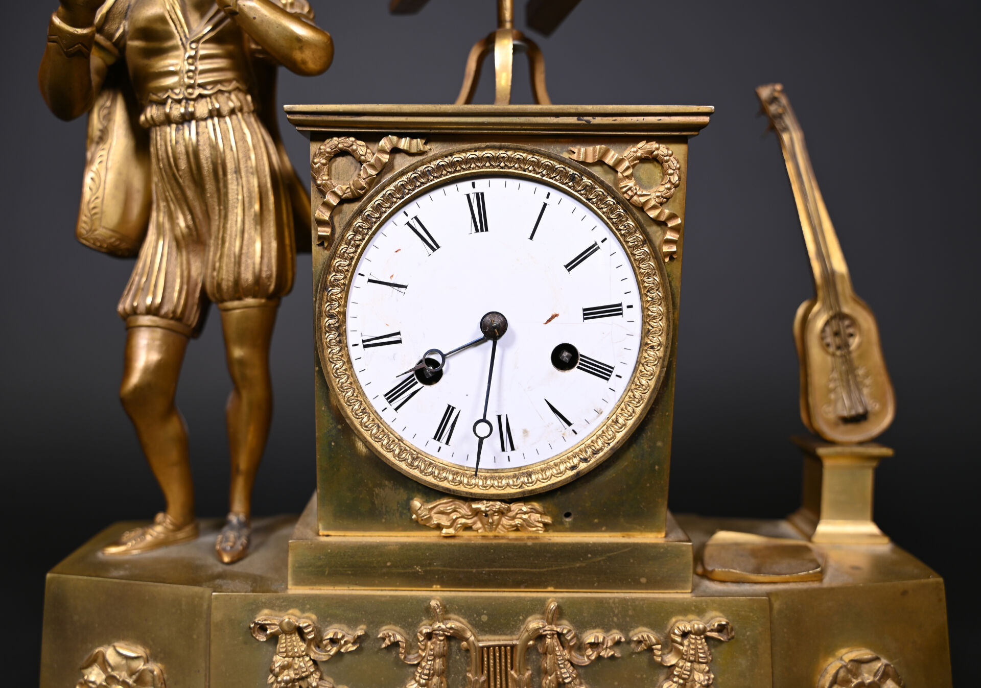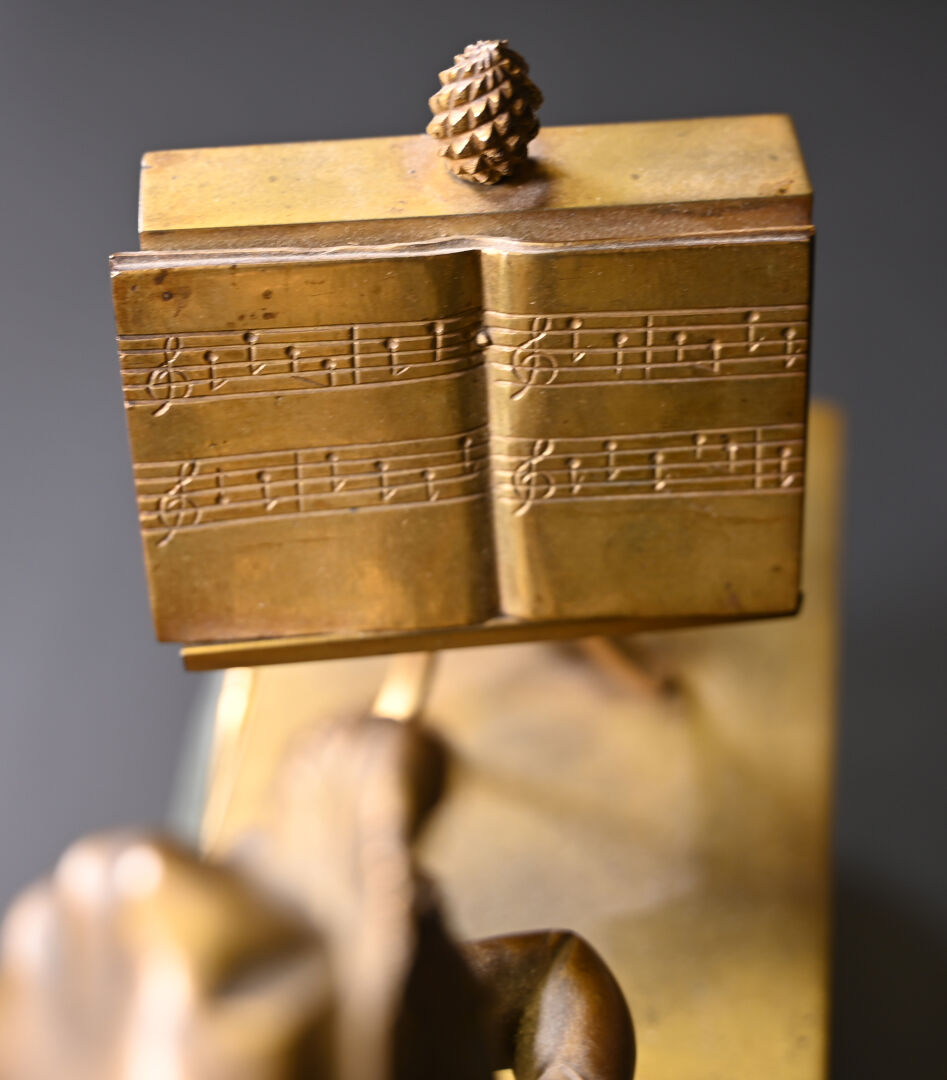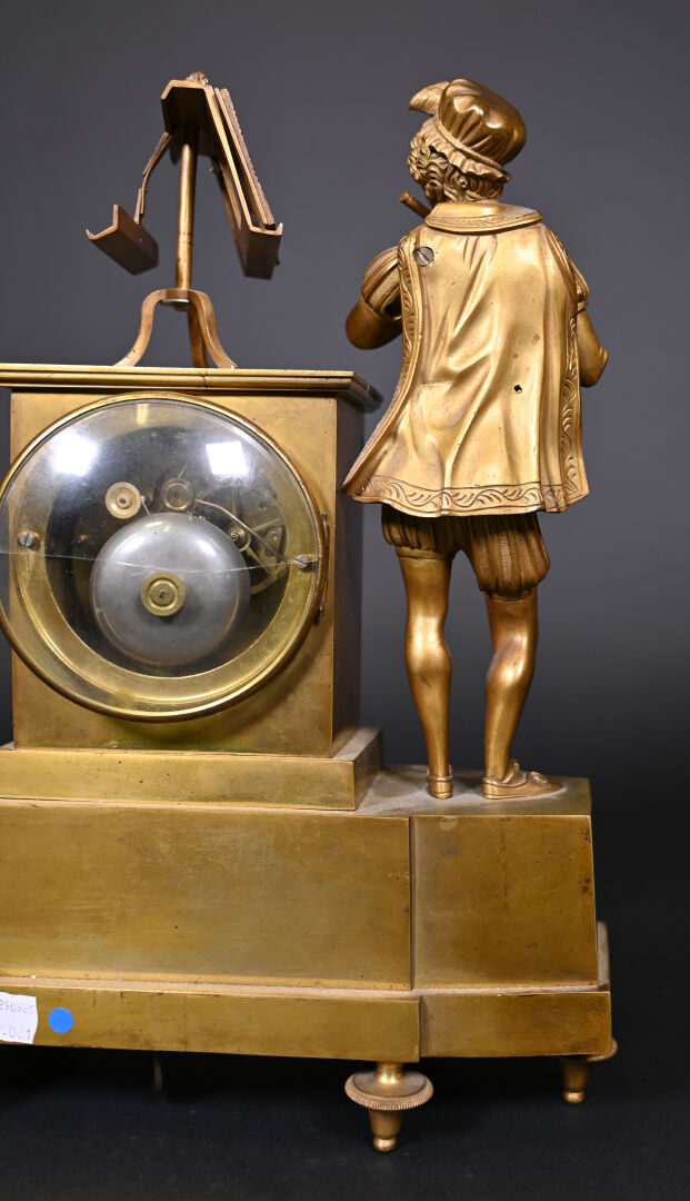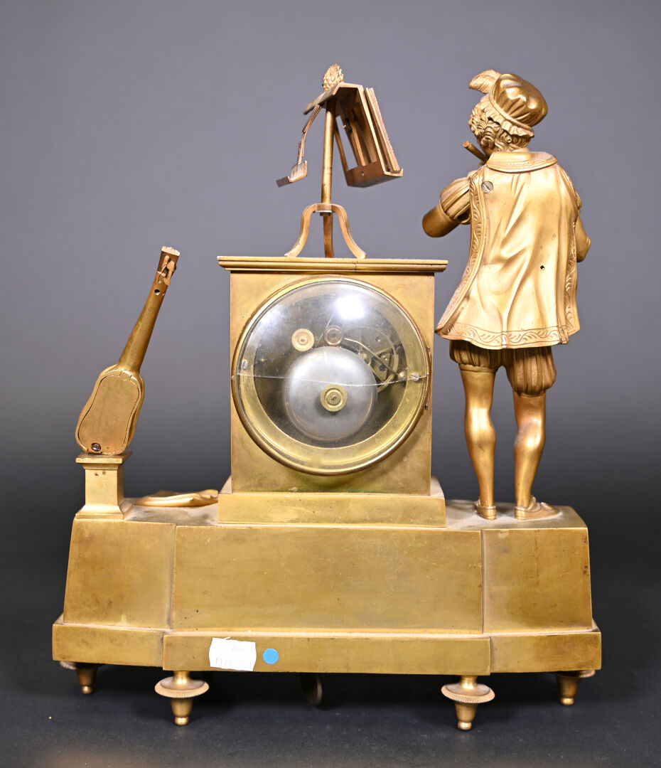 Pendule borne en bronze à décor d’un musicien en culotte et tenue d’inspiration médiévale. Cadran émaillé de chiffres romains en noir sur fond blanc (usures d’usage, manques (notamment le verre du cadran), fêles et un éclat sur le cadran, guitare à refixer, fêle sur le verre à l’arrière et absence de clef). Vers 1830/1840. Haut. : 37,5 cm.