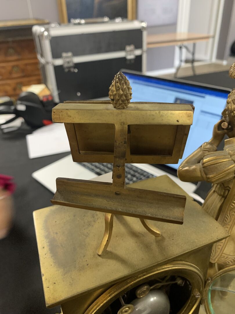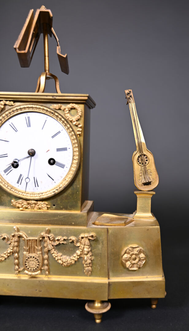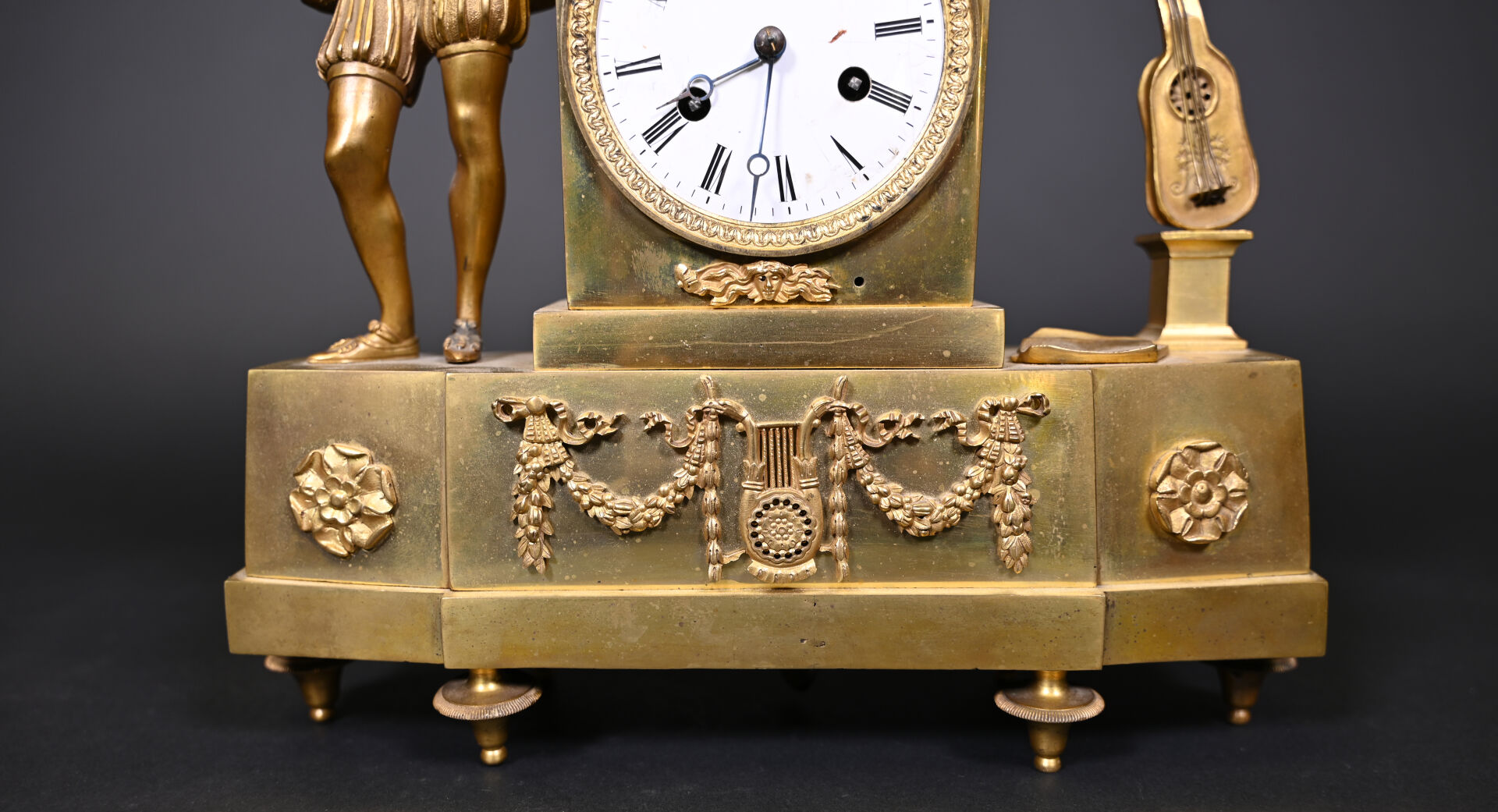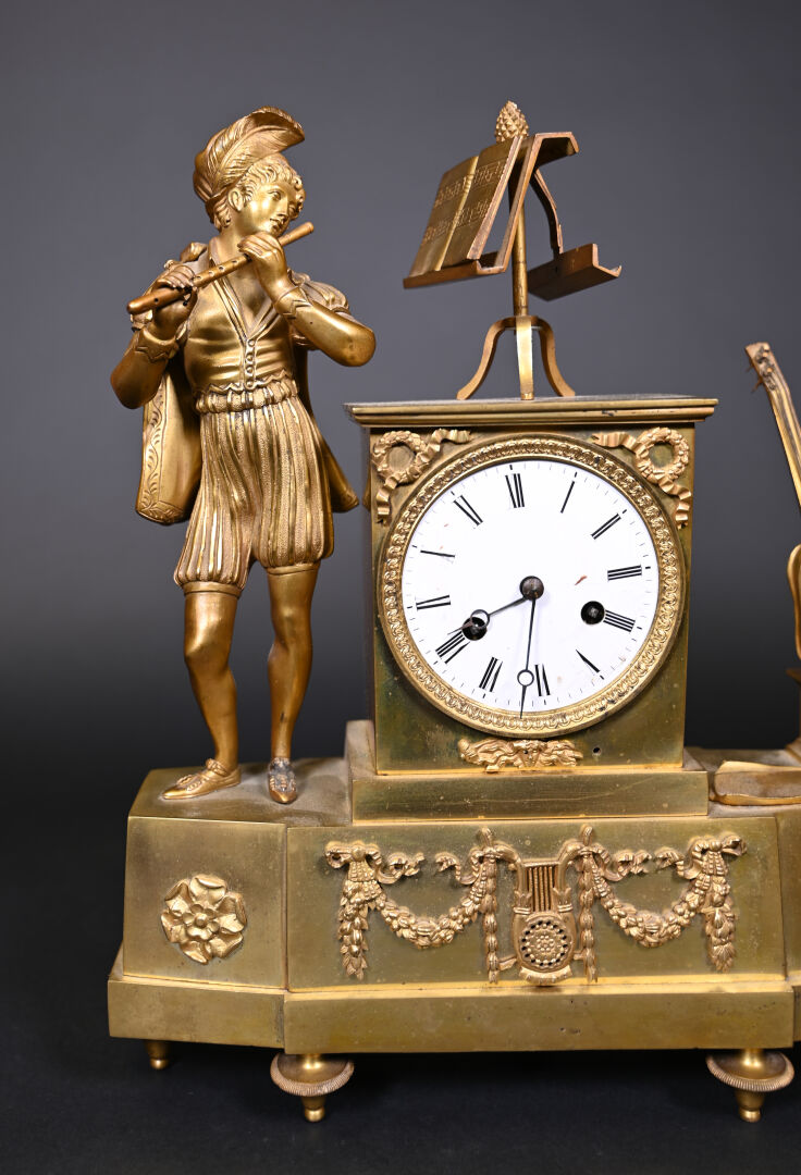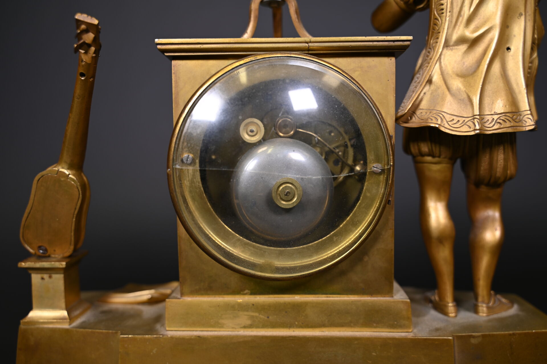 Pendule borne en bronze à décor d’un musicien en culotte et tenue d’inspiration médiévale. Cadran émaillé de chiffres romains en noir sur fond blanc (usures d’usage, manques (notamment le verre du cadran), fêles et un éclat sur le cadran, guitare à refixer, fêle sur le verre à l’arrière et absence de clef). Vers 1830/1840. Haut. : 37,5 cm.
