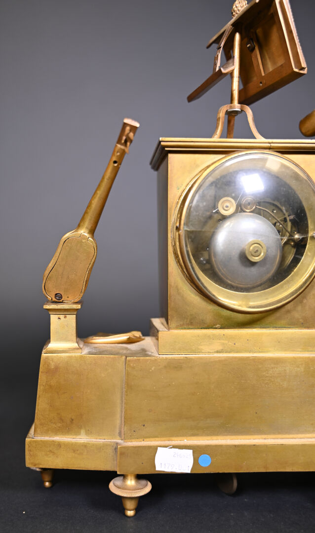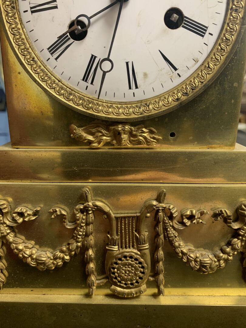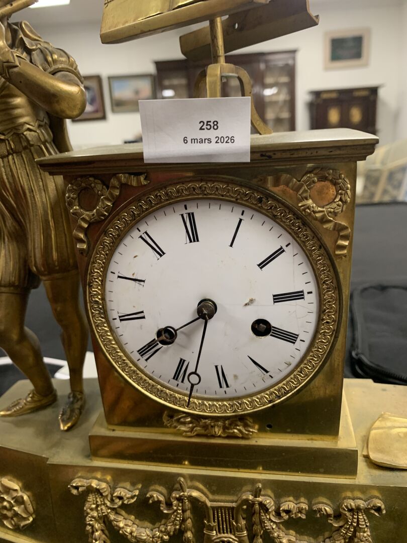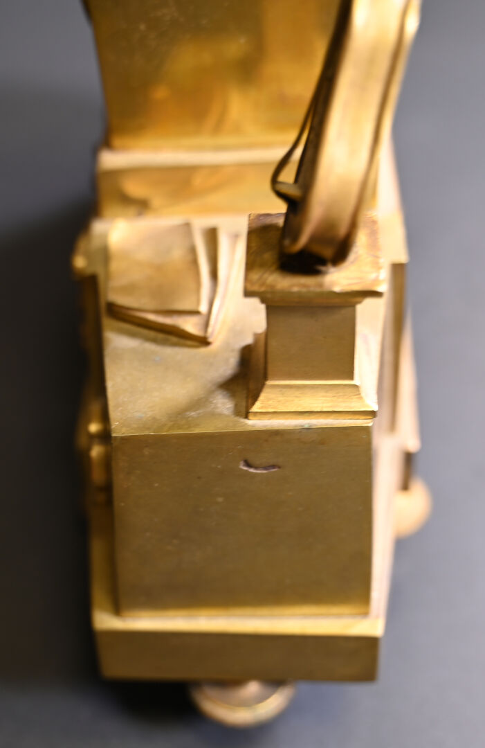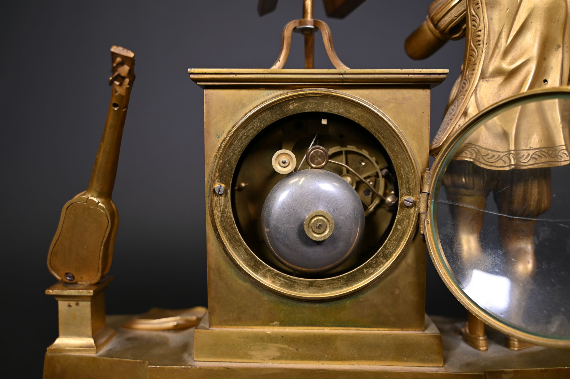 Pendule borne en bronze à décor d’un musicien en culotte et tenue d’inspiration médiévale. Cadran émaillé de chiffres romains en noir sur fond blanc (usures d’usage, manques (notamment le verre du cadran), fêles et un éclat sur le cadran, guitare à refixer, fêle sur le verre à l’arrière et absence de clef). Vers 1830/1840. Haut. : 37,5 cm.