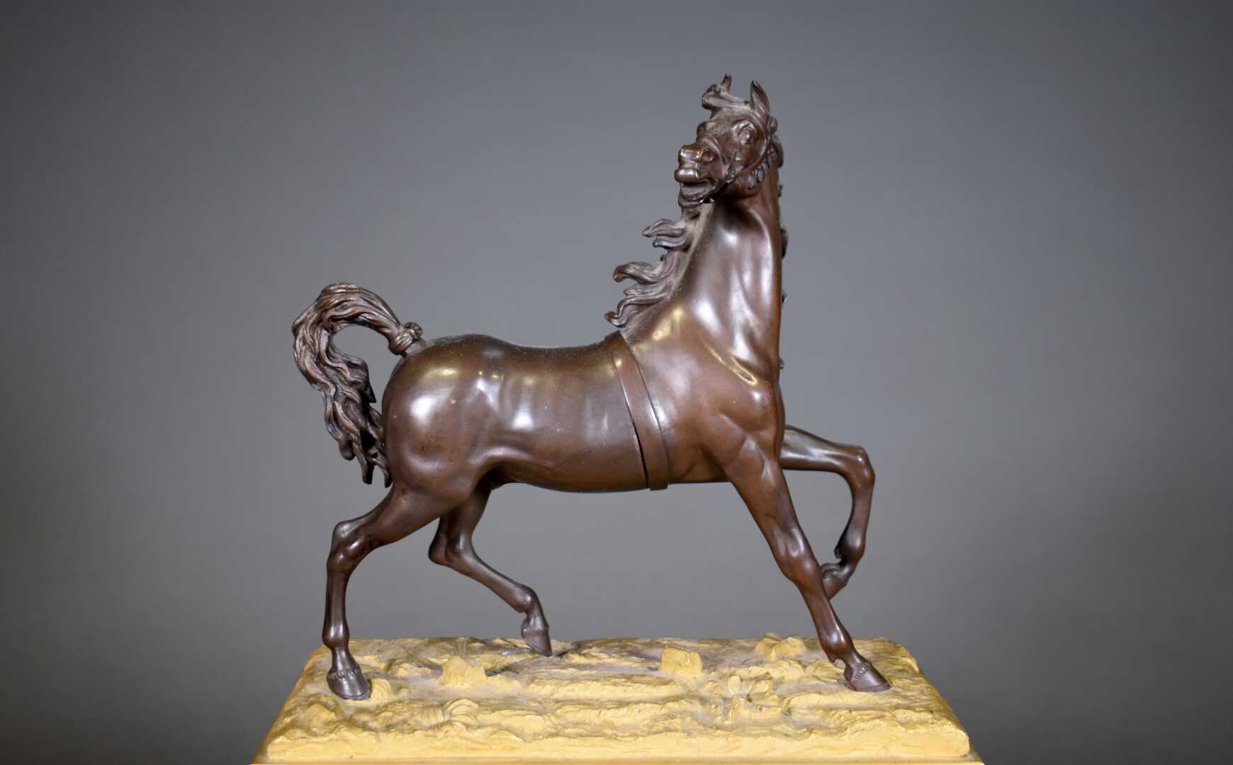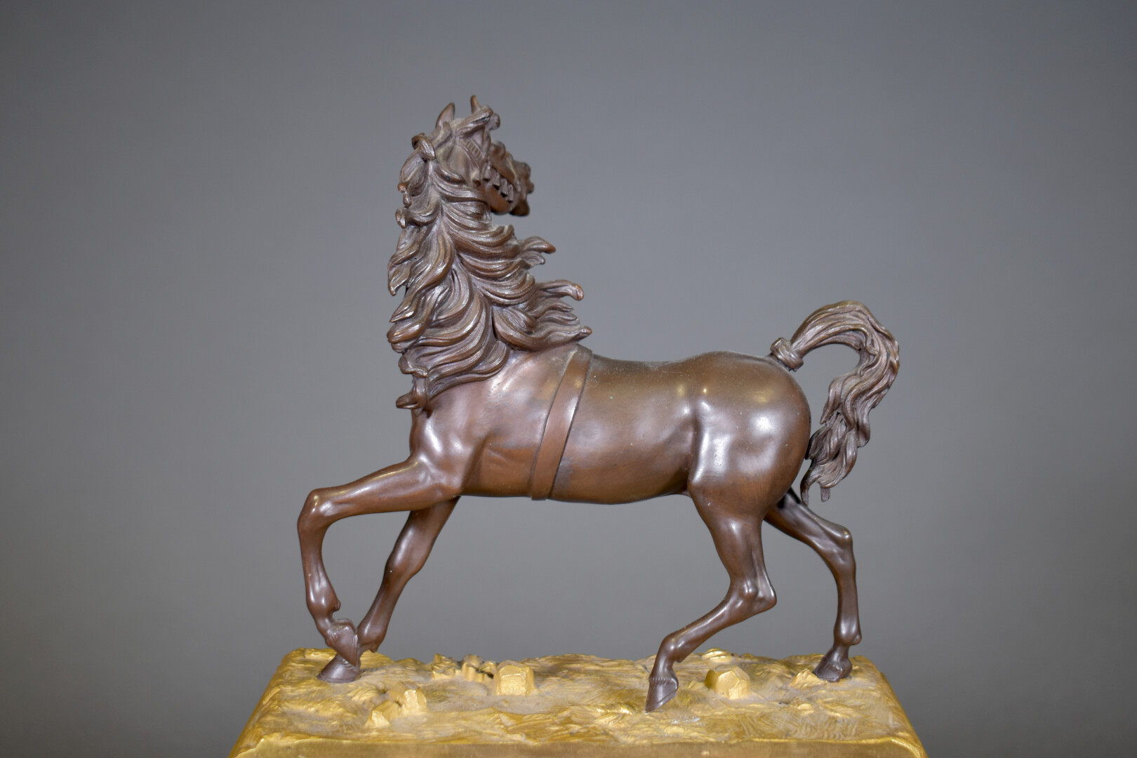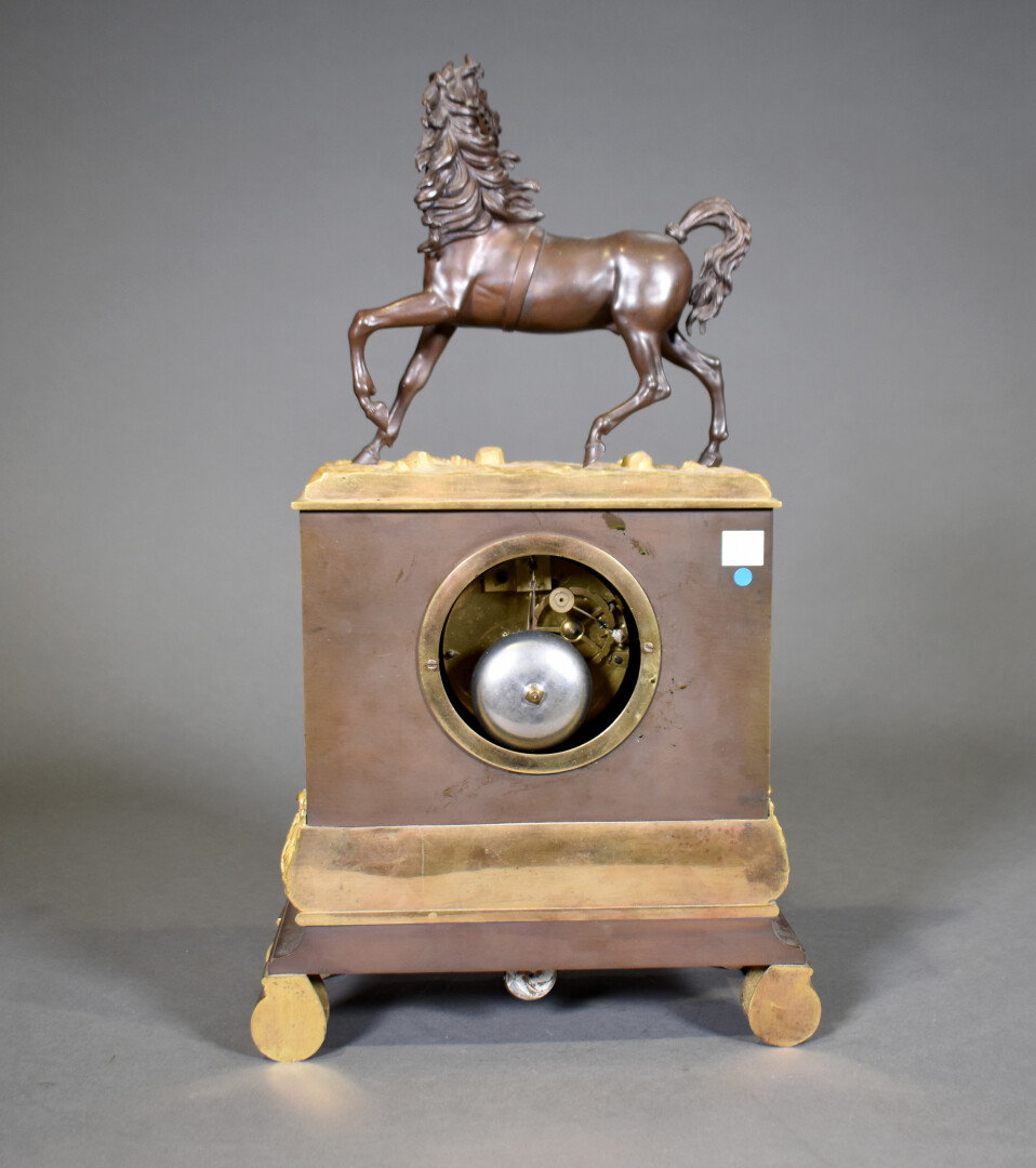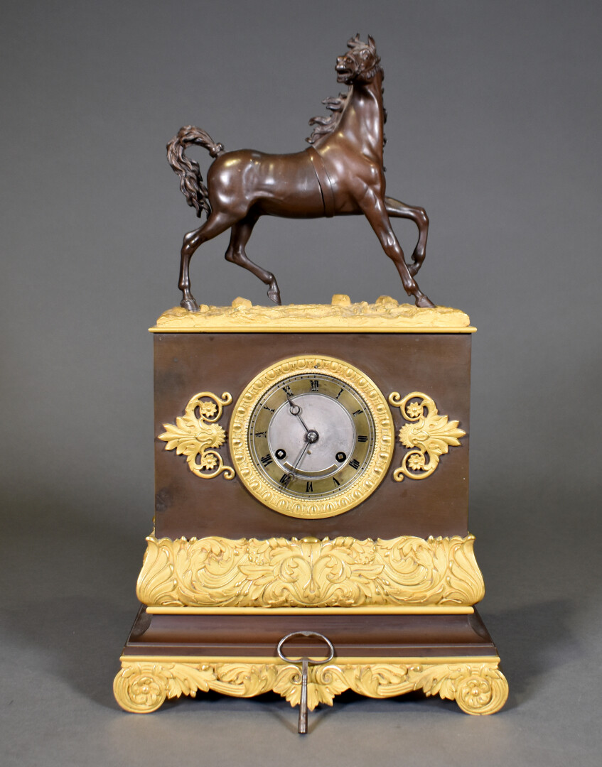 Pendule borne en bronze patiné brun, ciselé doré. Cadran à fond métallique à chiffres romains pour les heures. La base en plinthe à décor d’acanthes et entrelacs végétaux. Elle est surmontée d’un bronze d’après un modèle d’Isidore Bonheur, le « Cheval fougueux ». Mouvement estampillé « Pons – Médaille d’argent 1823 ». Milieu du XIXe siècle, avant 1850. Avec clé et balancier. Haut. : 50 cm.