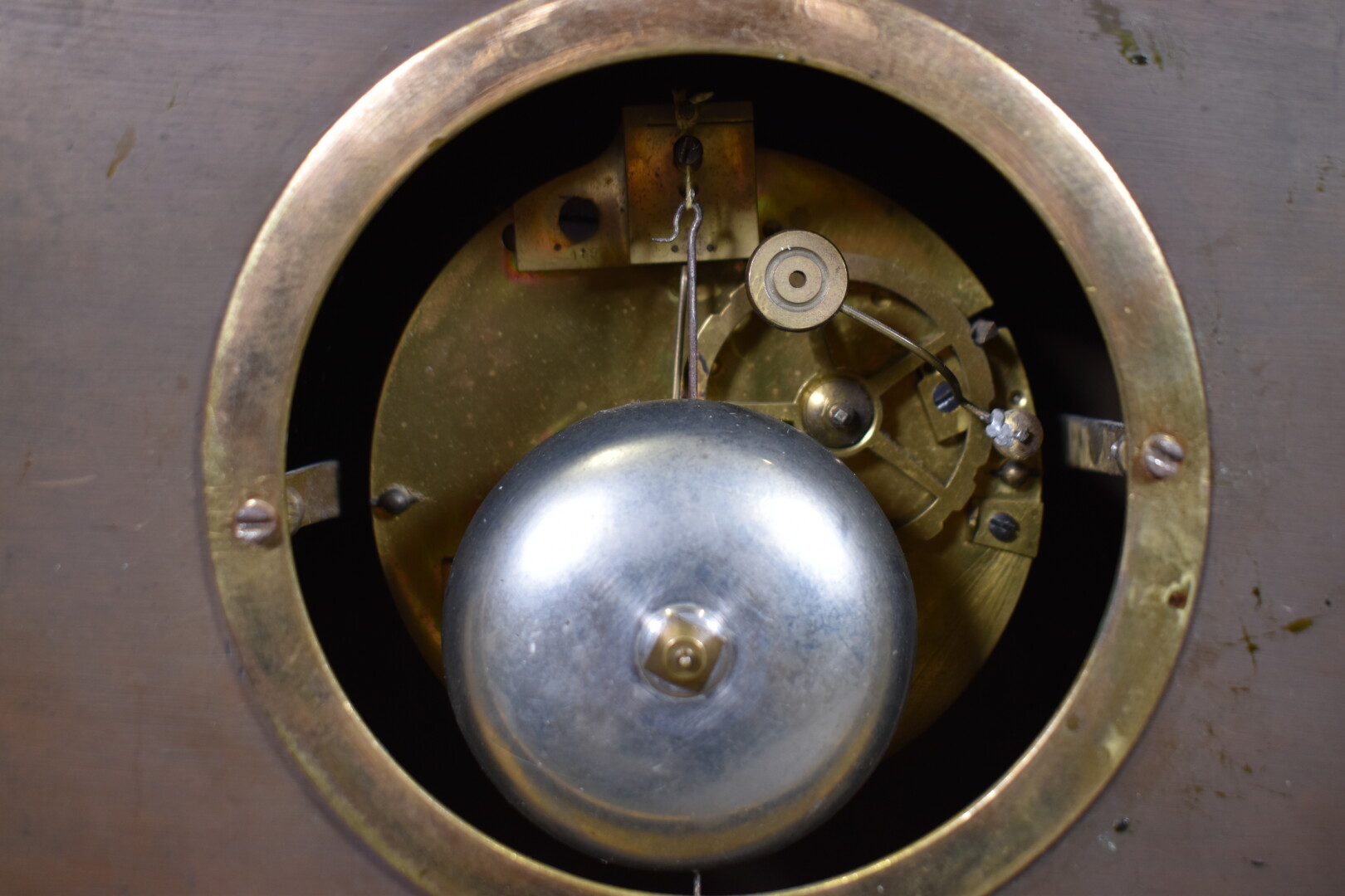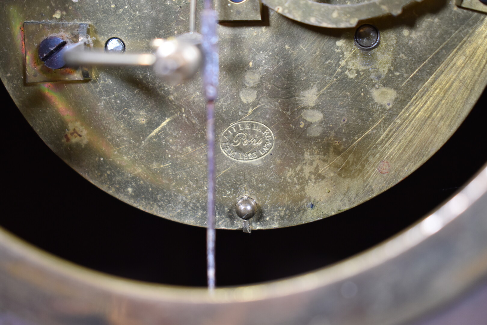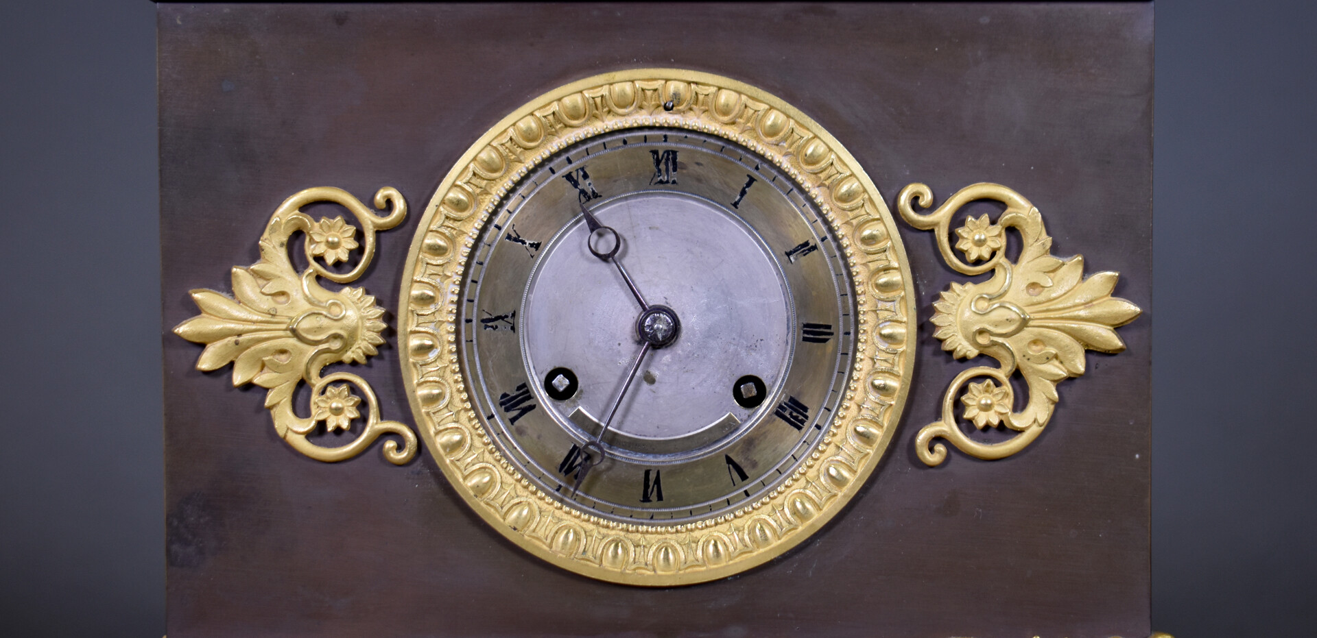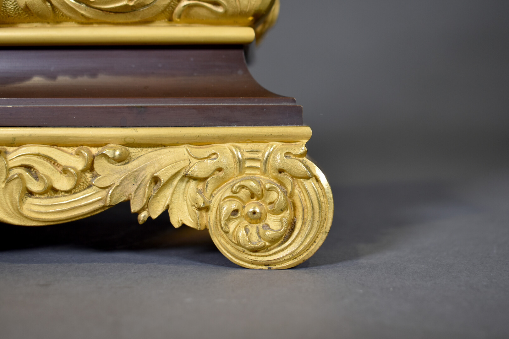 Pendule borne en bronze patiné brun, ciselé doré. Cadran à fond métallique à chiffres romains pour les heures. La base en plinthe à décor d’acanthes et entrelacs végétaux. Elle est surmontée d’un bronze d’après un modèle d’Isidore Bonheur, le « Cheval fougueux ». Mouvement estampillé « Pons – Médaille d’argent 1823 ». Milieu du XIXe siècle, avant 1850. Avec clé et balancier. Haut. : 50 cm.