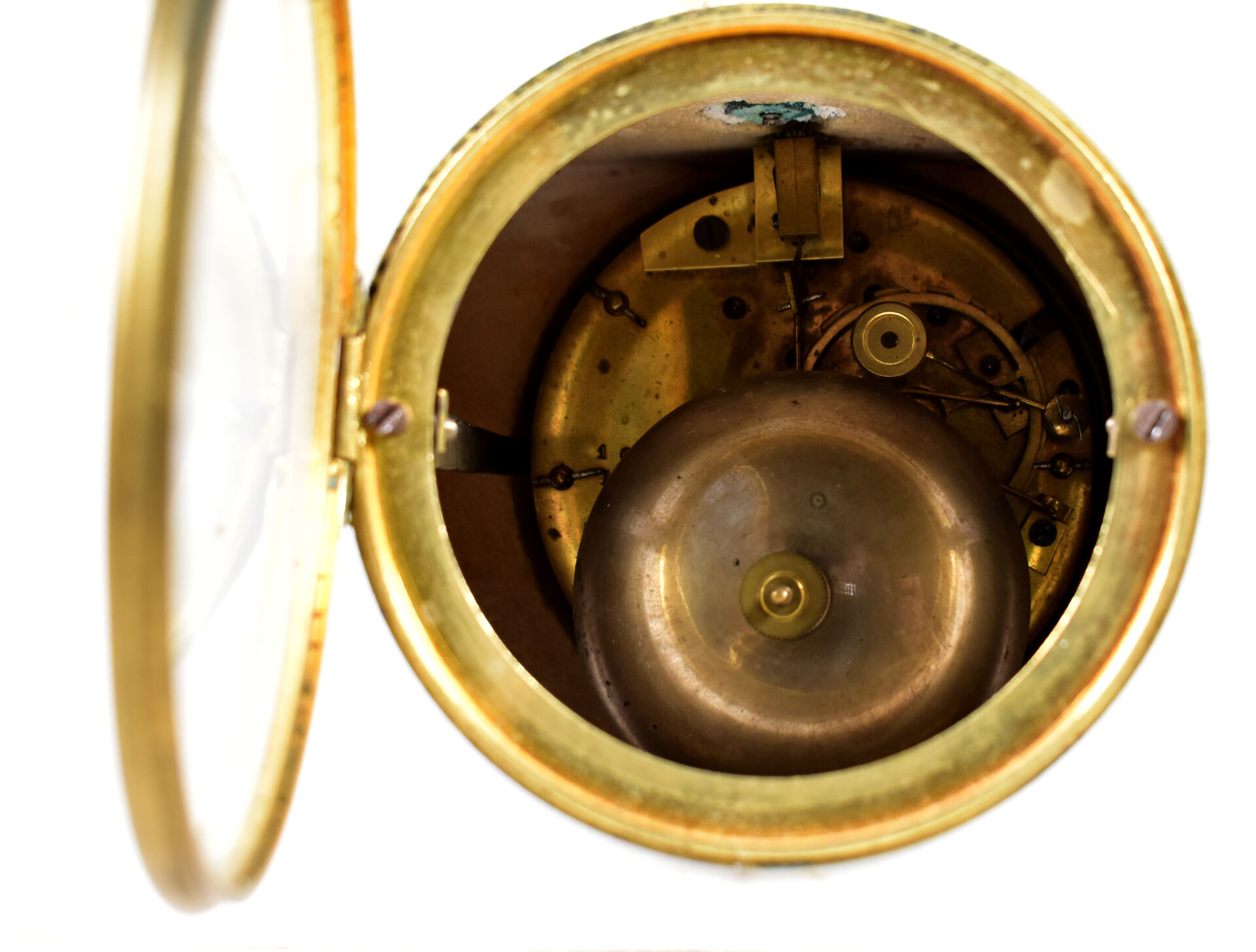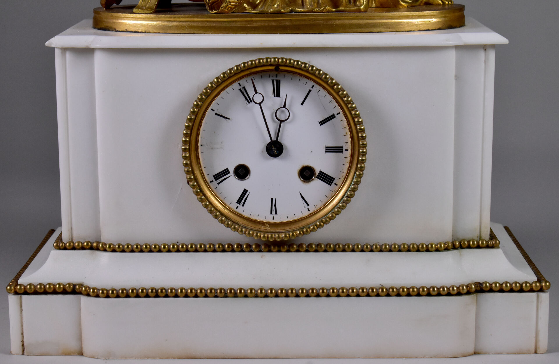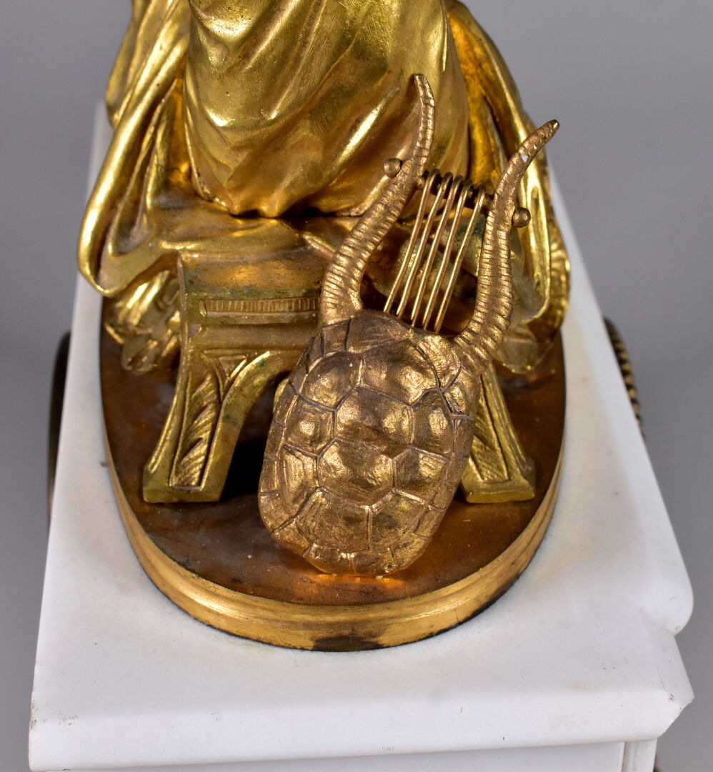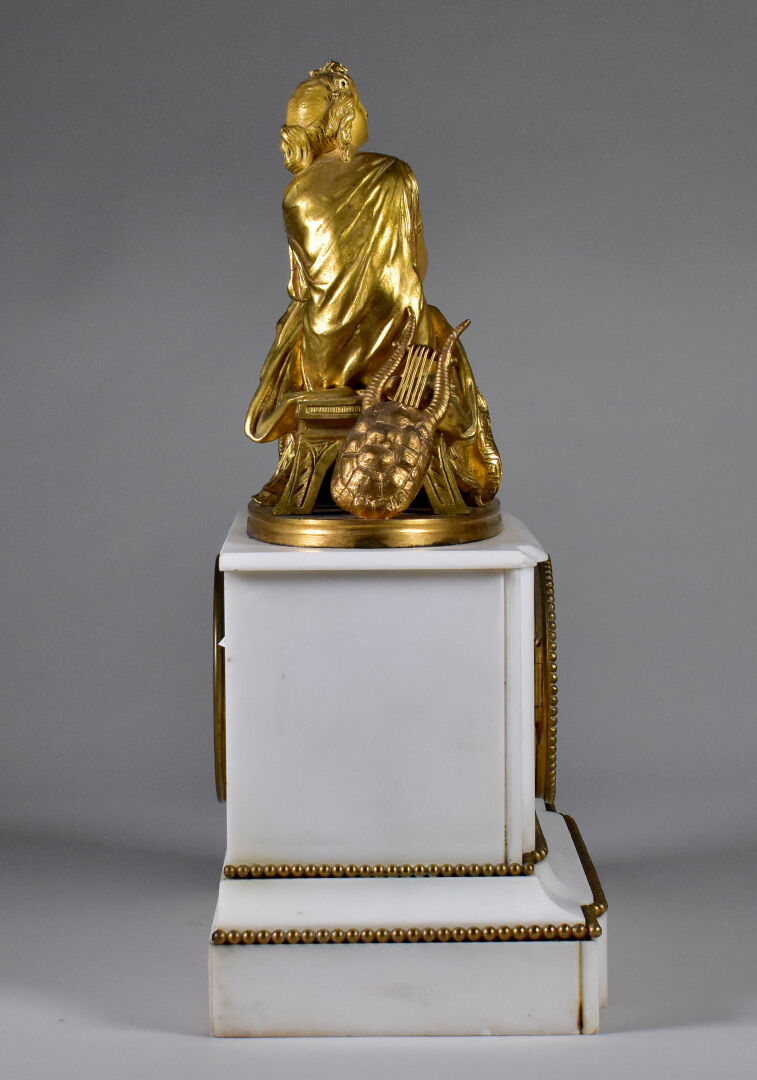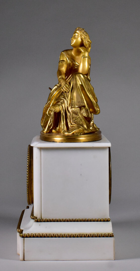 Pendule borne en marbre blanc. Cadran émaillé à chiffres romains en noir sur fond blanc (usures, manque le verre, un éclat). Elle est ornée d’une musicienne pensive en bronze ciselé doré, dans le goût antique. Haut. : 38 cm – Larg. : 31,5 cm – Prof. : 15,5 cm.