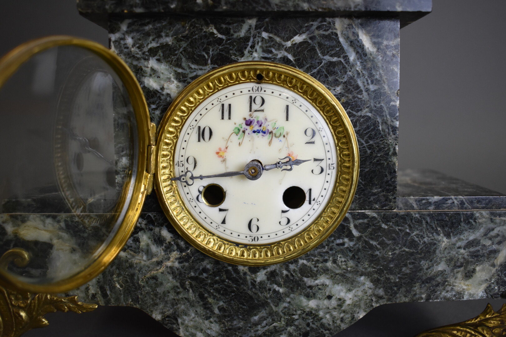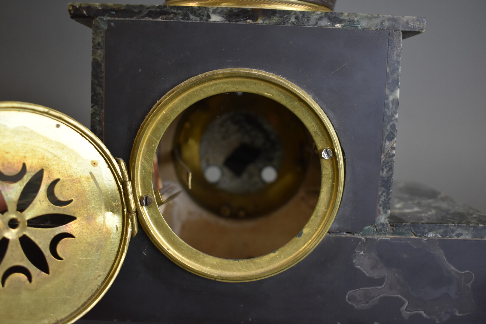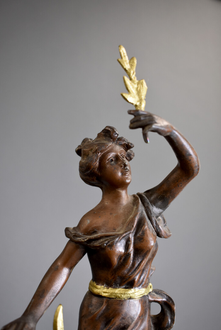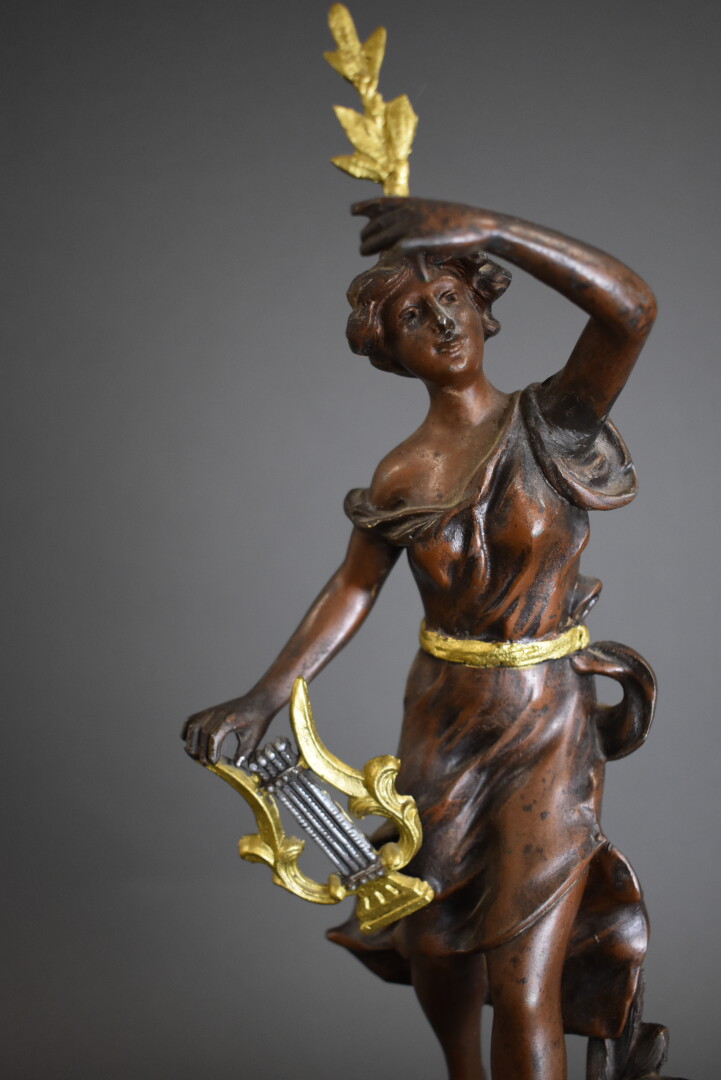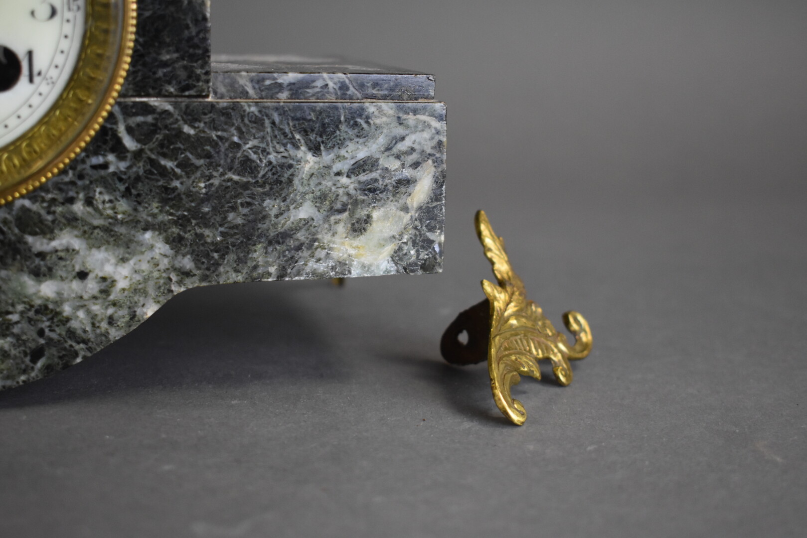 Pendule borne en marbre vert ornée d’une figure en régule patinée brun « Harmonie des Champs » d’après Rousseau. Cadran à chiffres arabes pour les heures. Manque le mécanisme, un pied à refixer. Vers 1900. Haut. : 54, 5 cm.